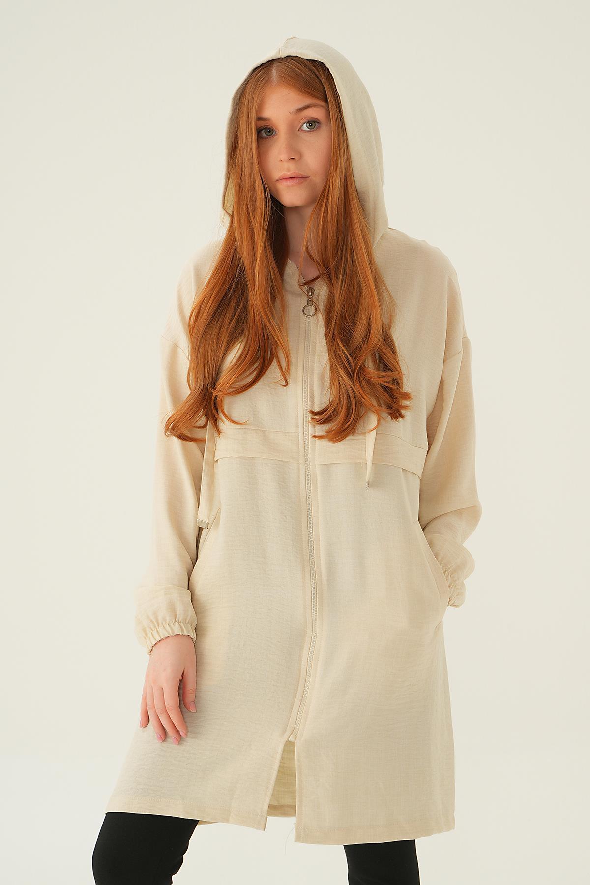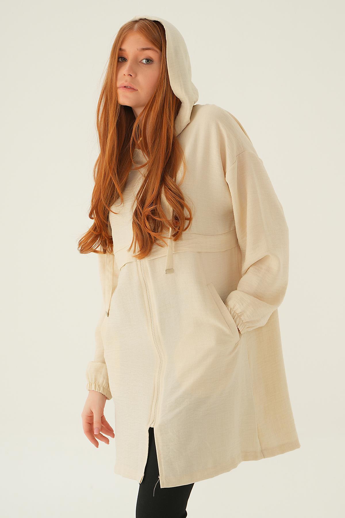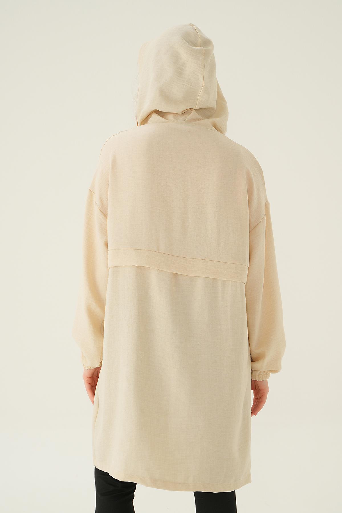 Bej Kapüşonlu Kısa Kap 6686-1