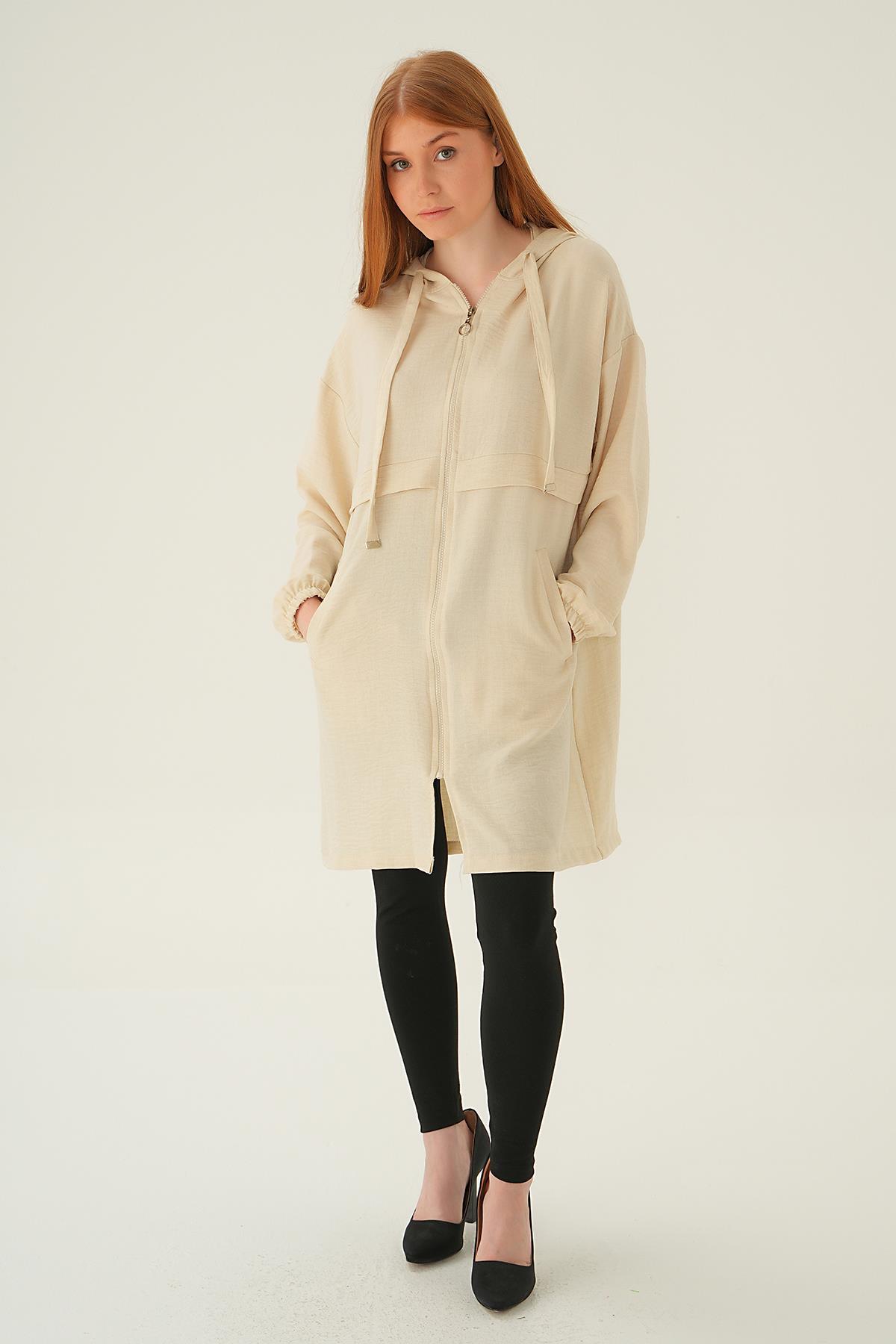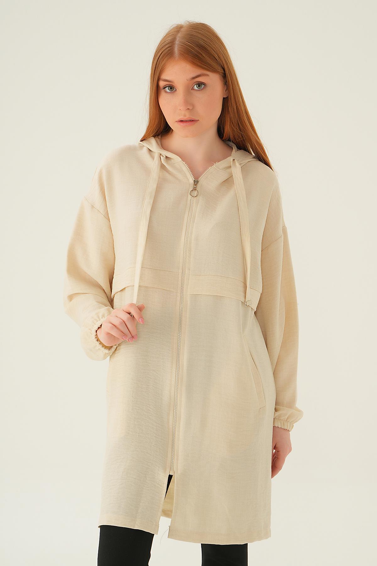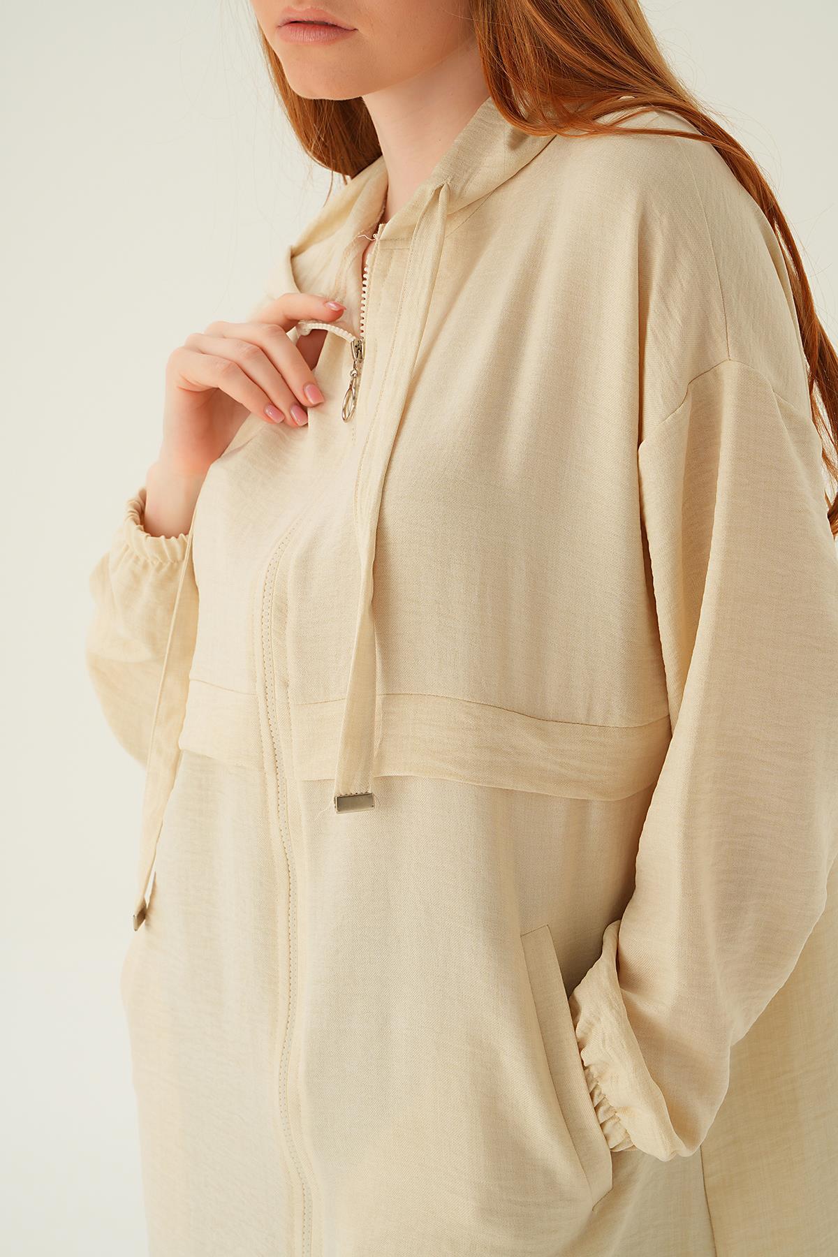 Bej Kapüşonlu Kısa Kap 6686-1