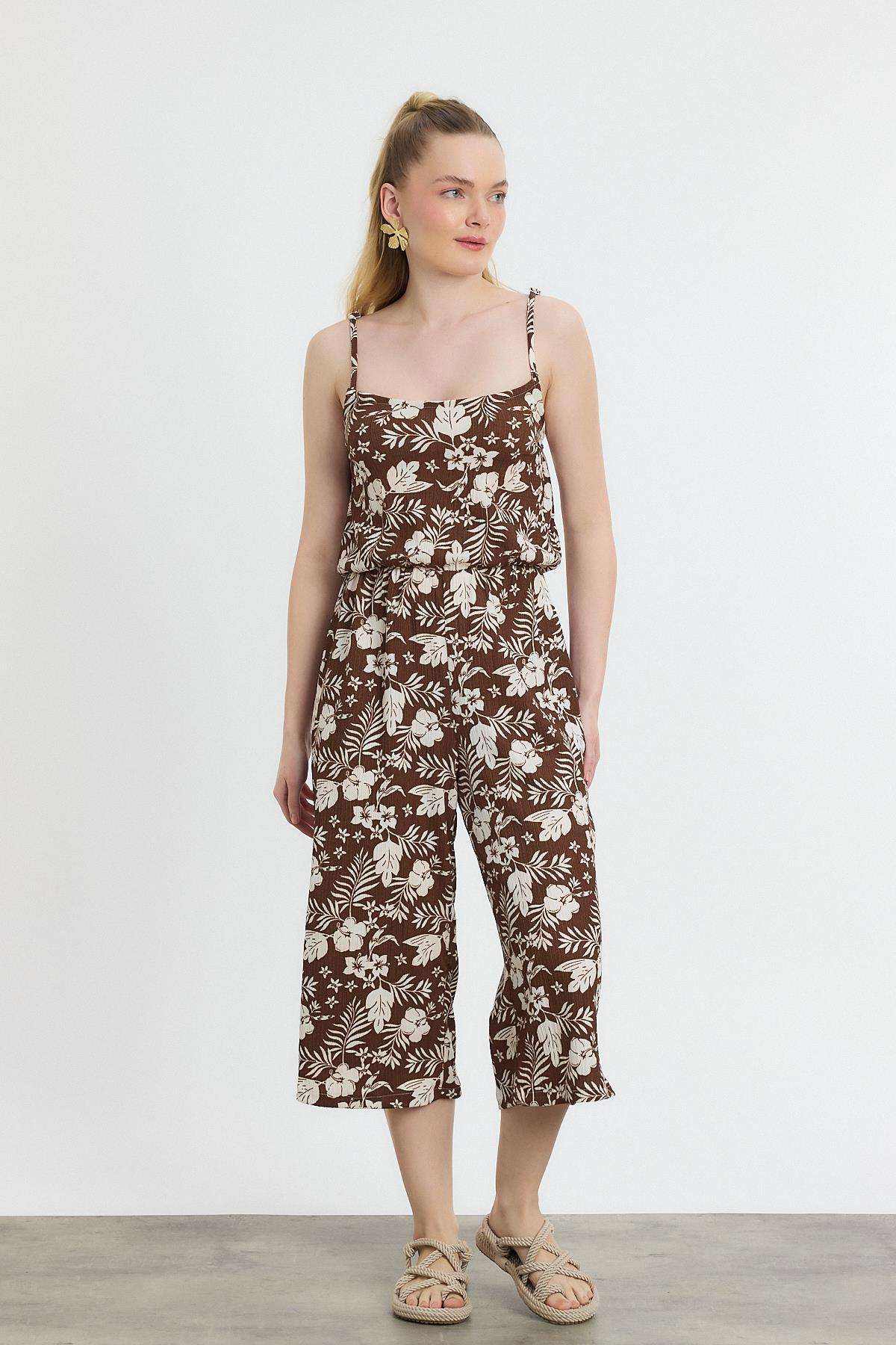Kahve Çiçek Desen Sıfır Kol Tulum 6718A
