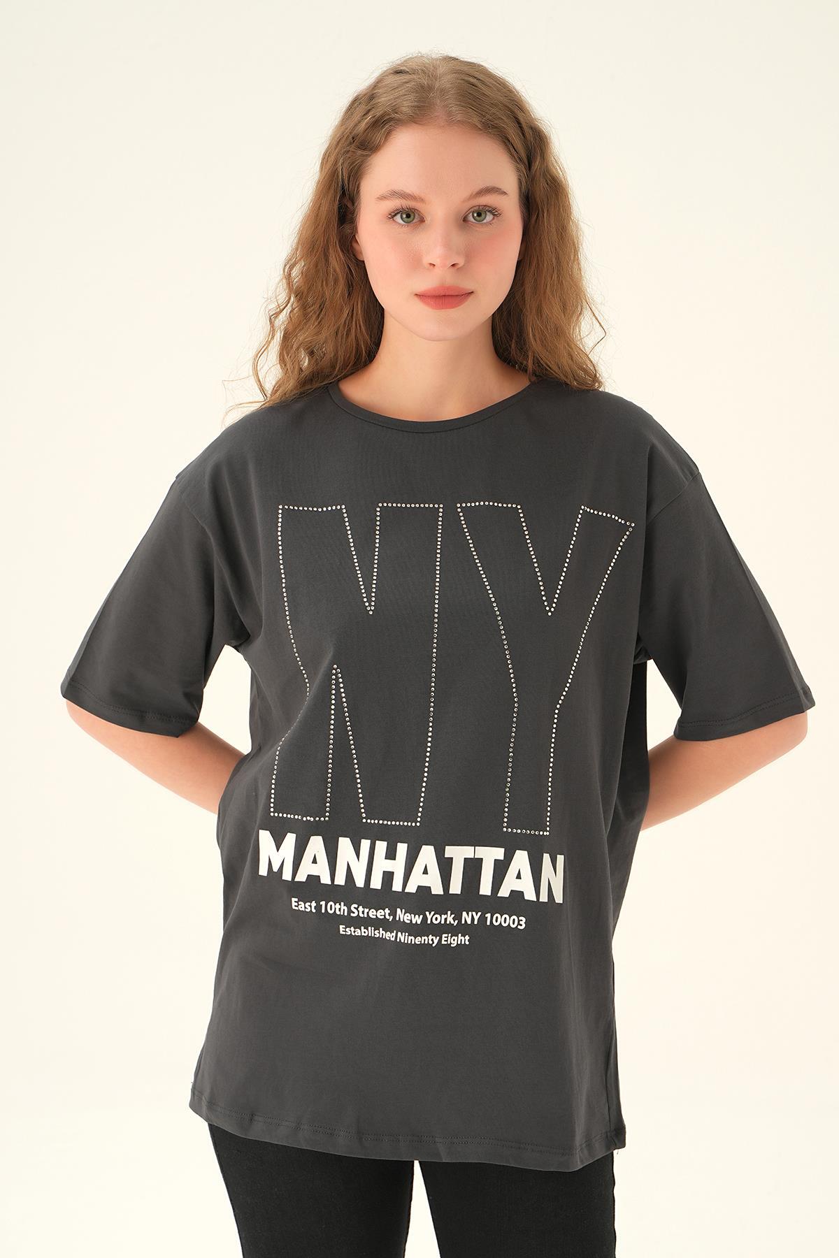 6744 NY İşlemeli Tişört Füme