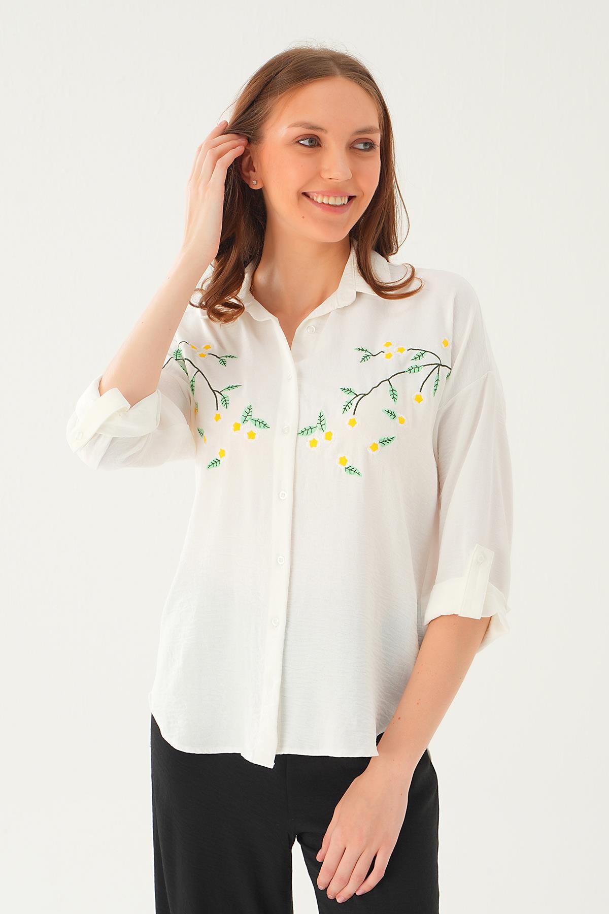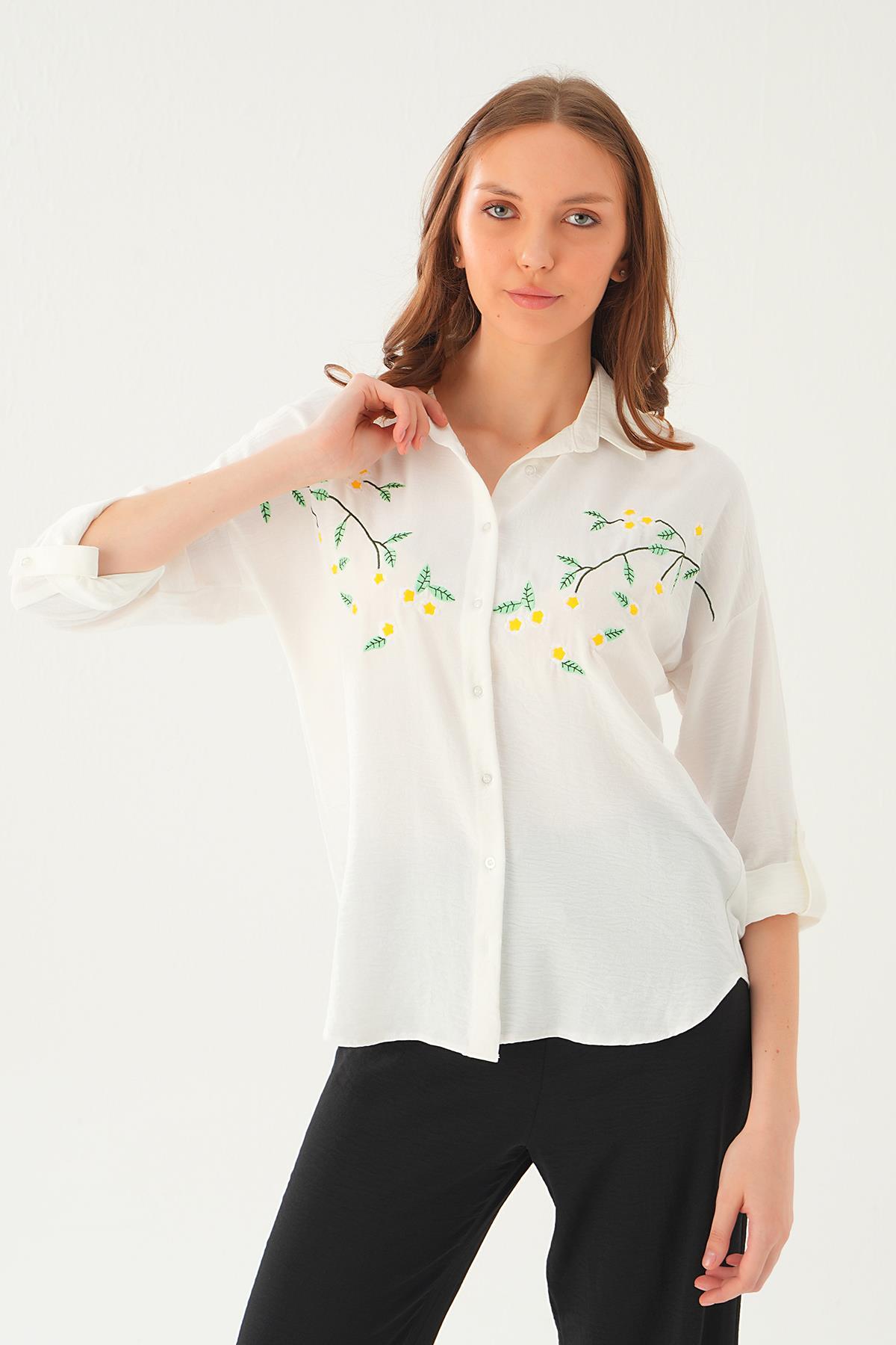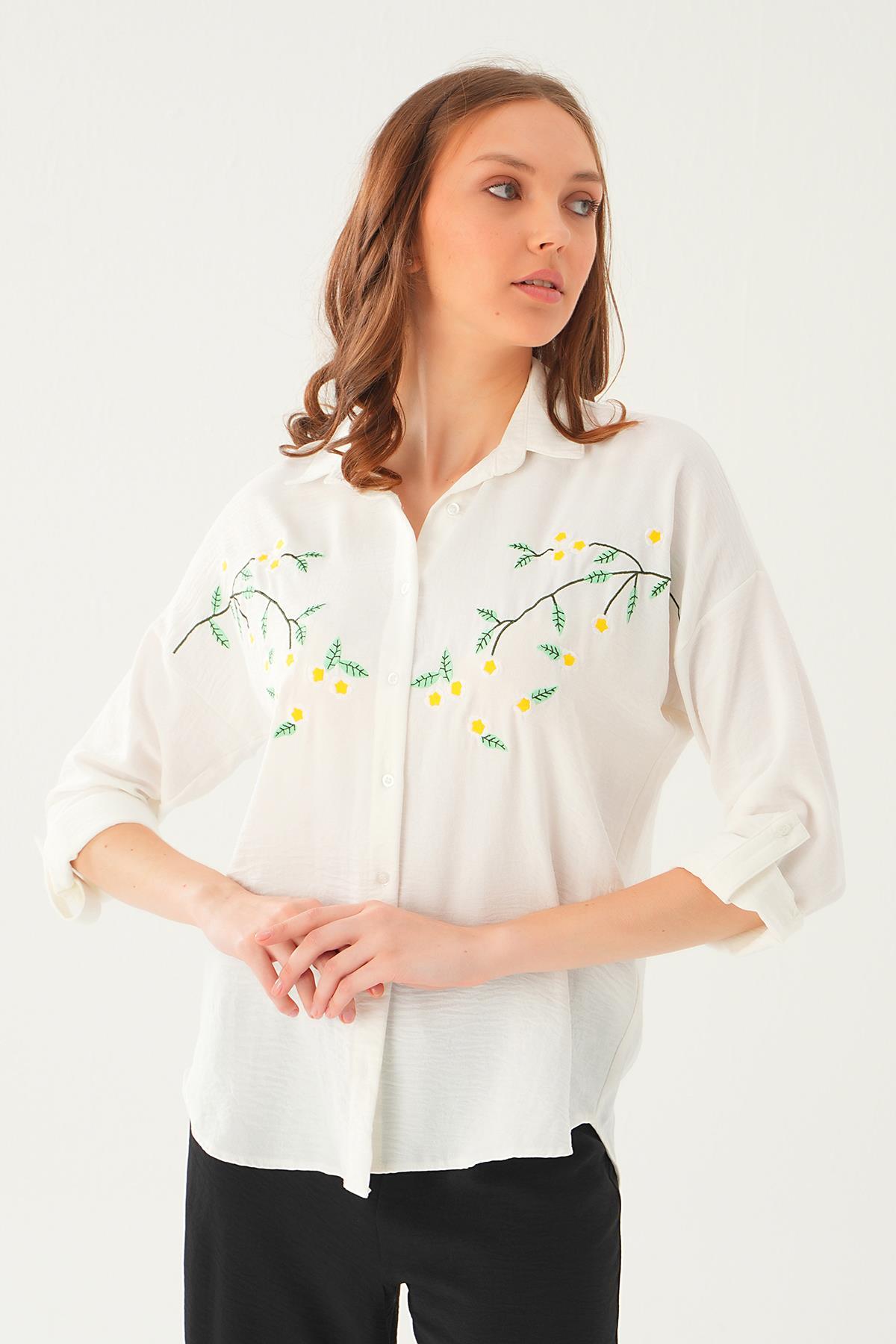 Ekru Çiçek Nakış Detay Gömlek 6787A