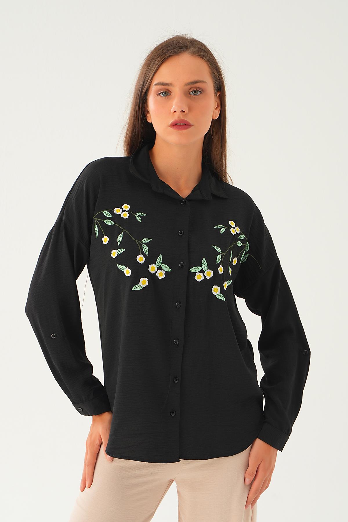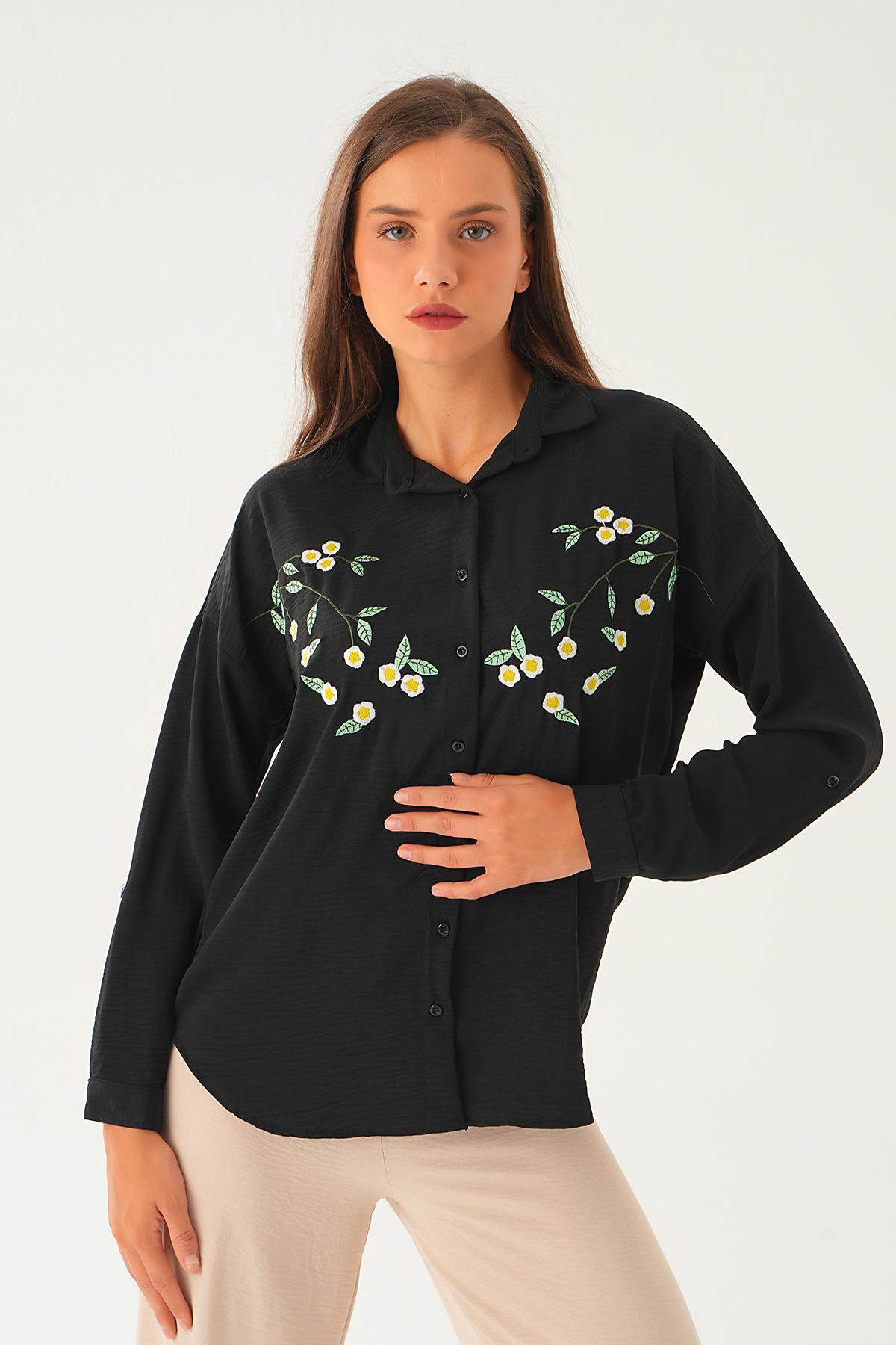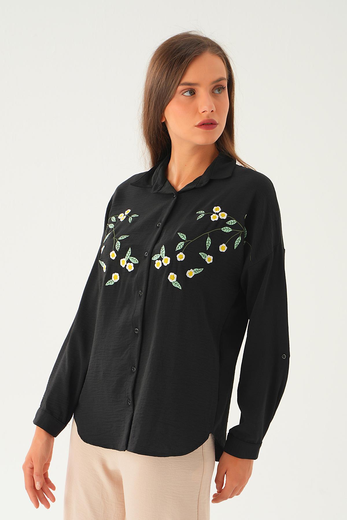 Siyah Çiçek Nakış Detay Gömlek 6787A