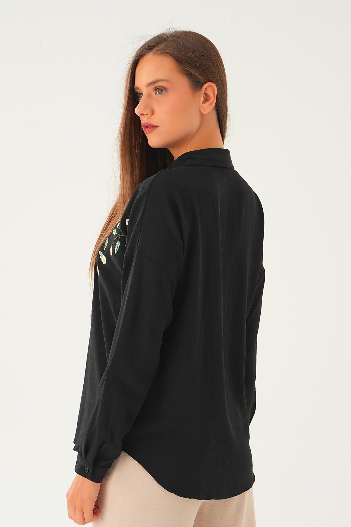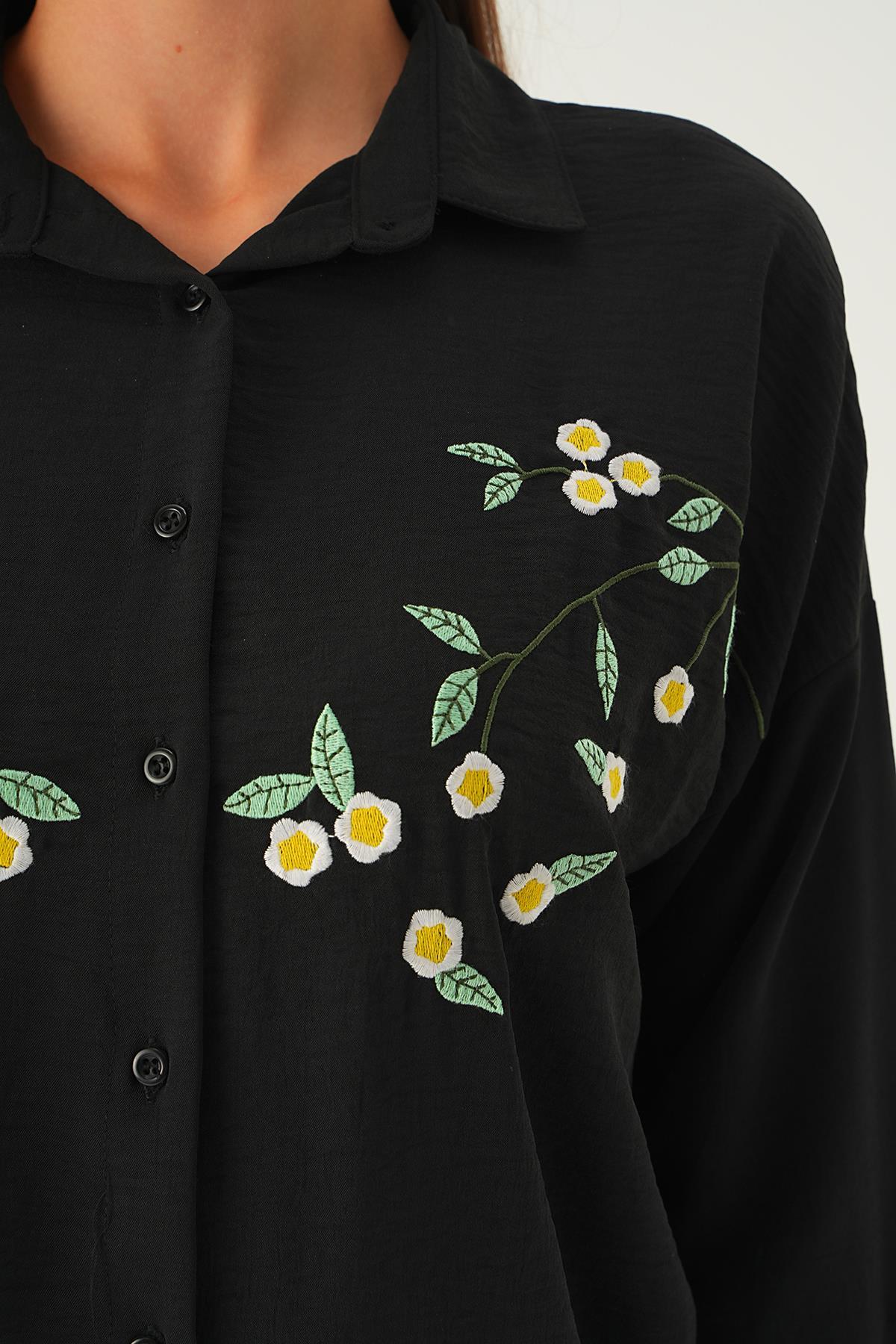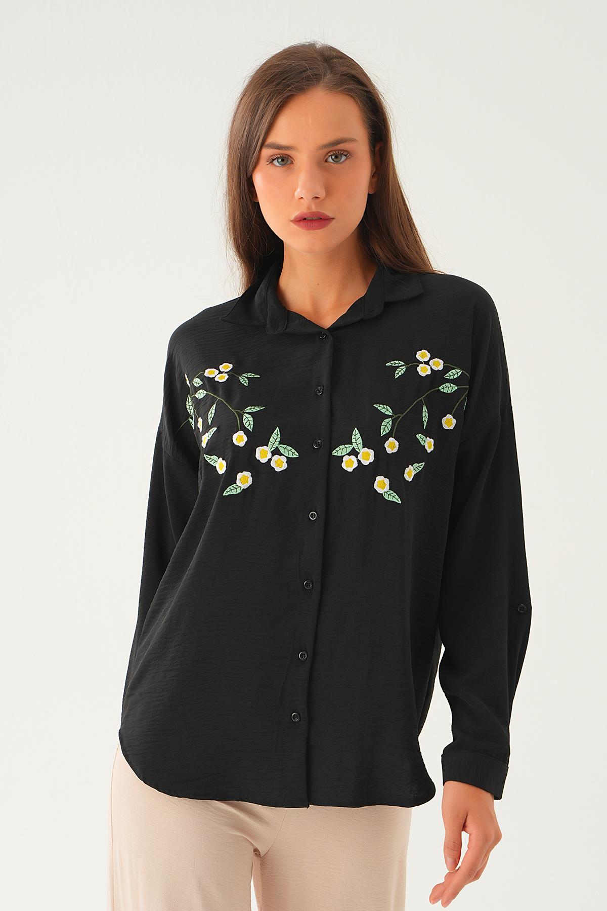 Siyah Çiçek Nakış Detay Gömlek 6787A