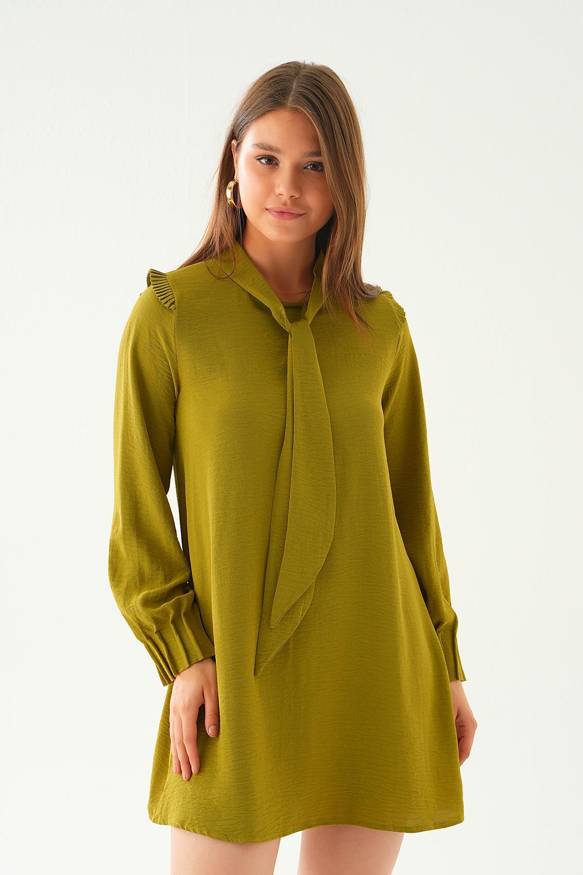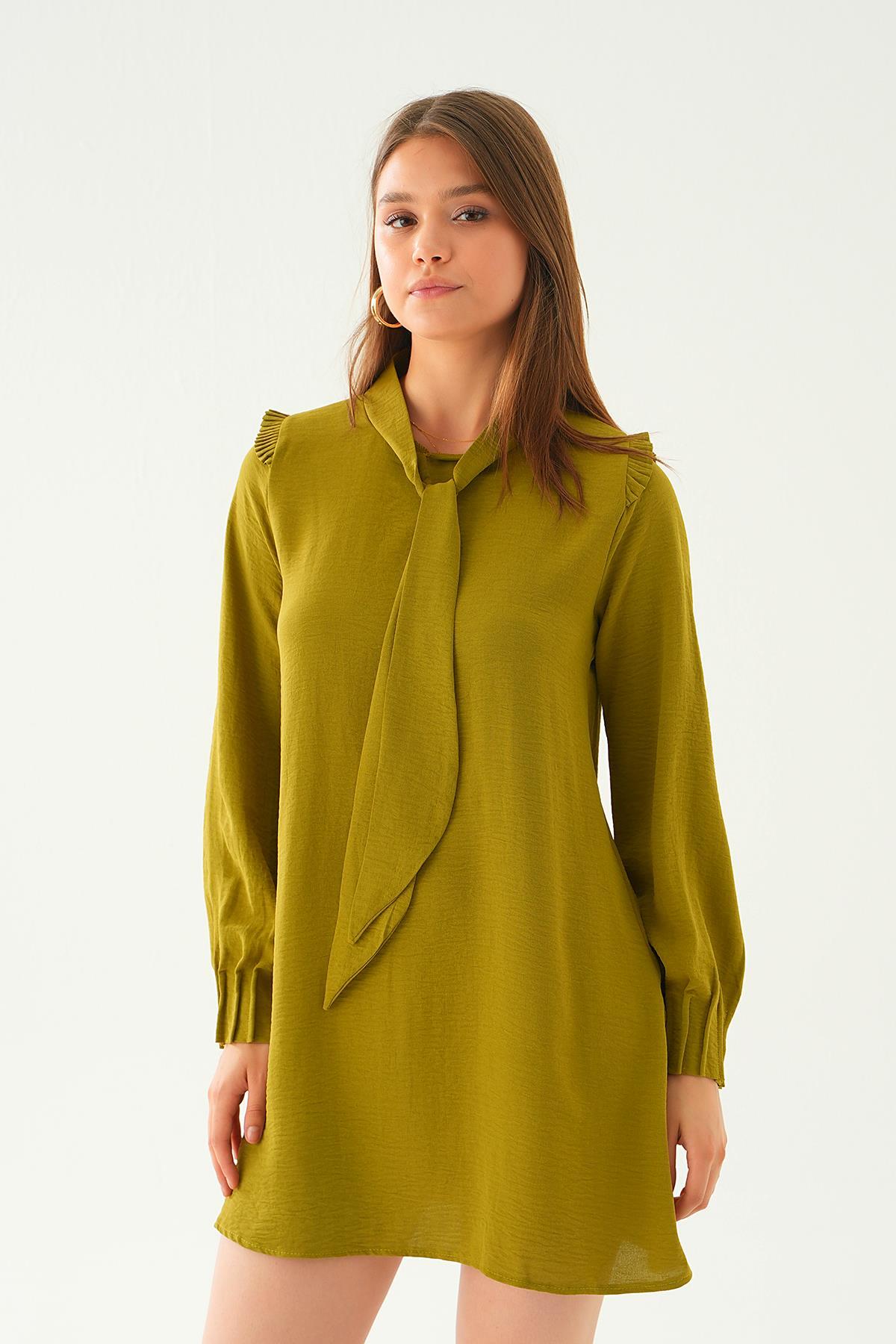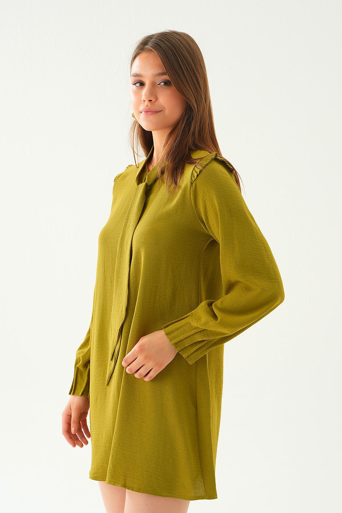 Yağ Yeşili Omuz Fırfırlı Fiyonklu Tunik 6796A