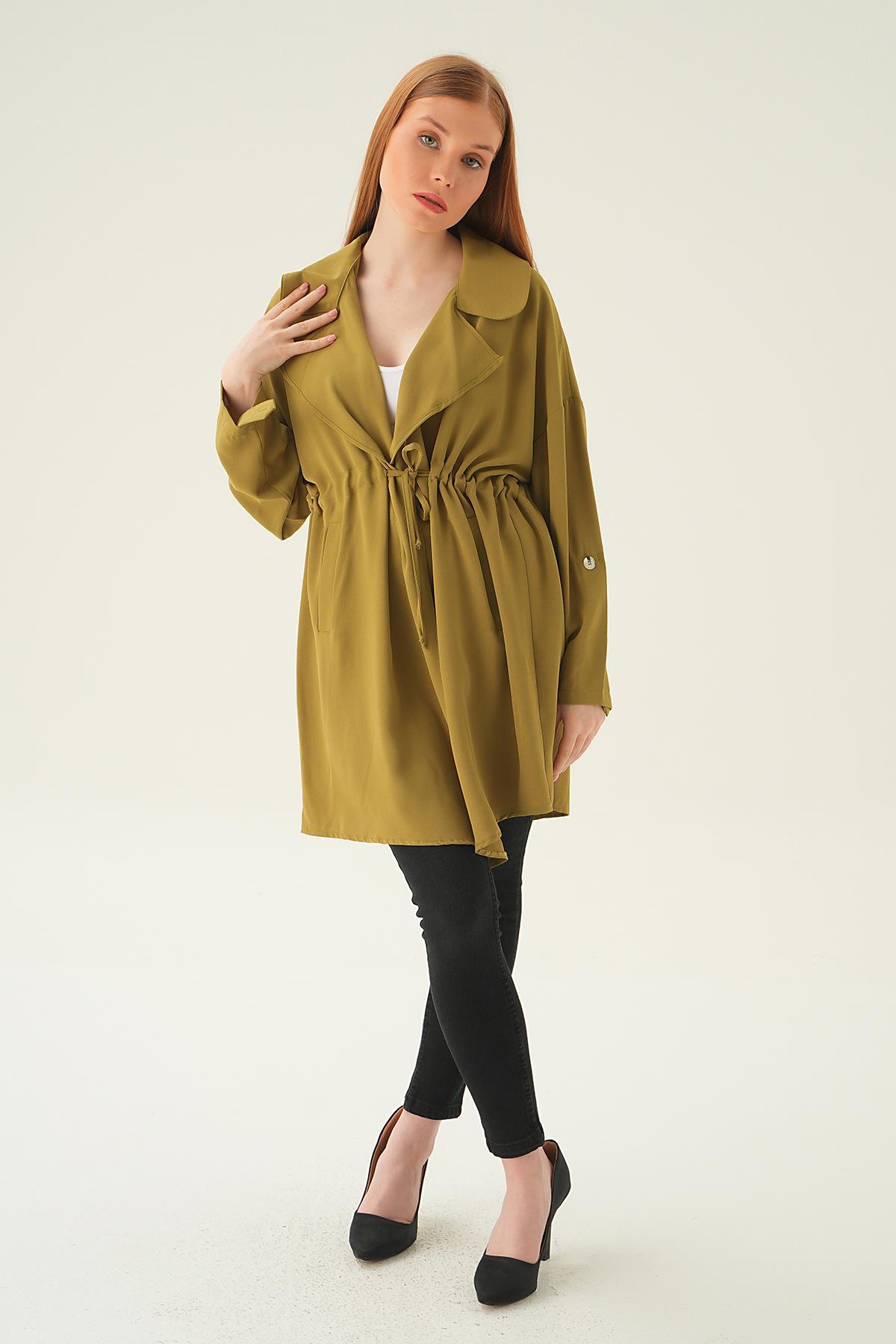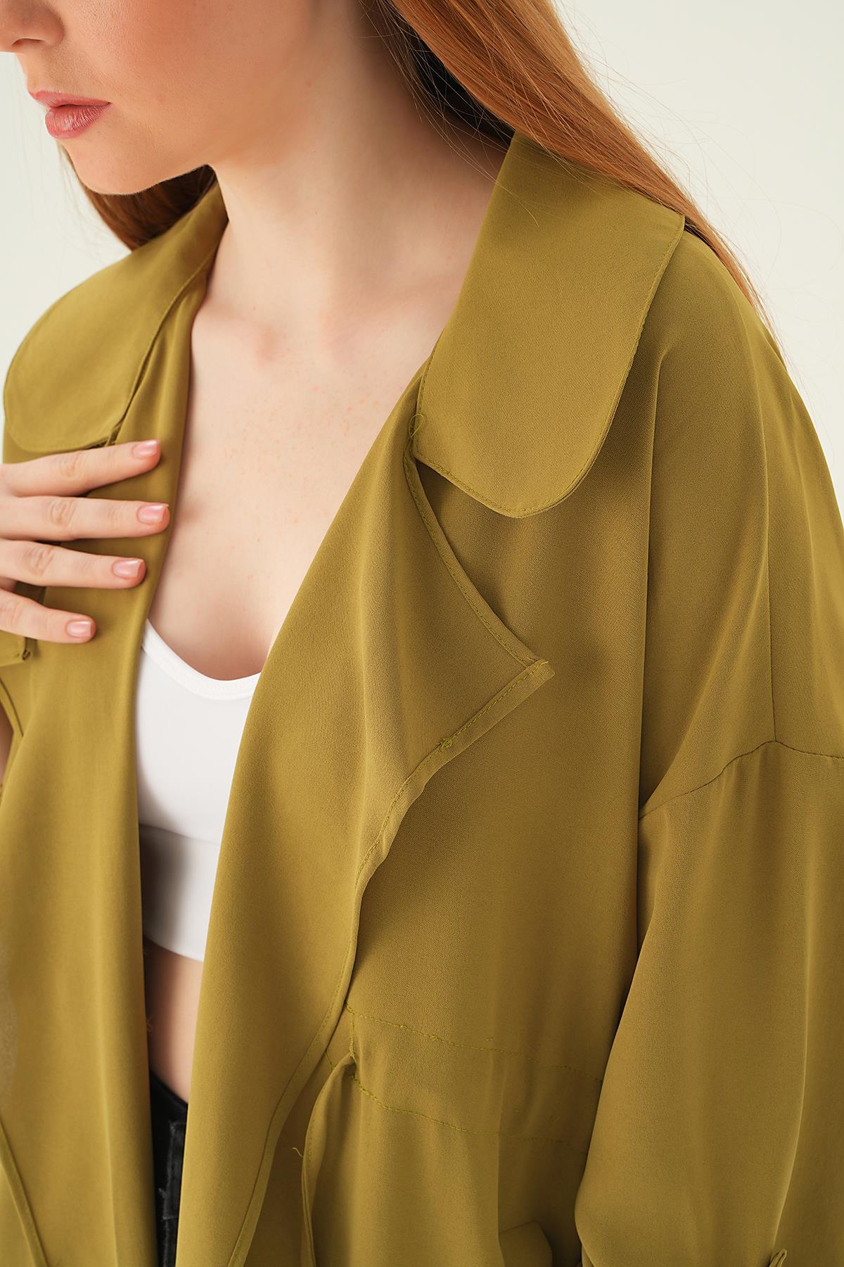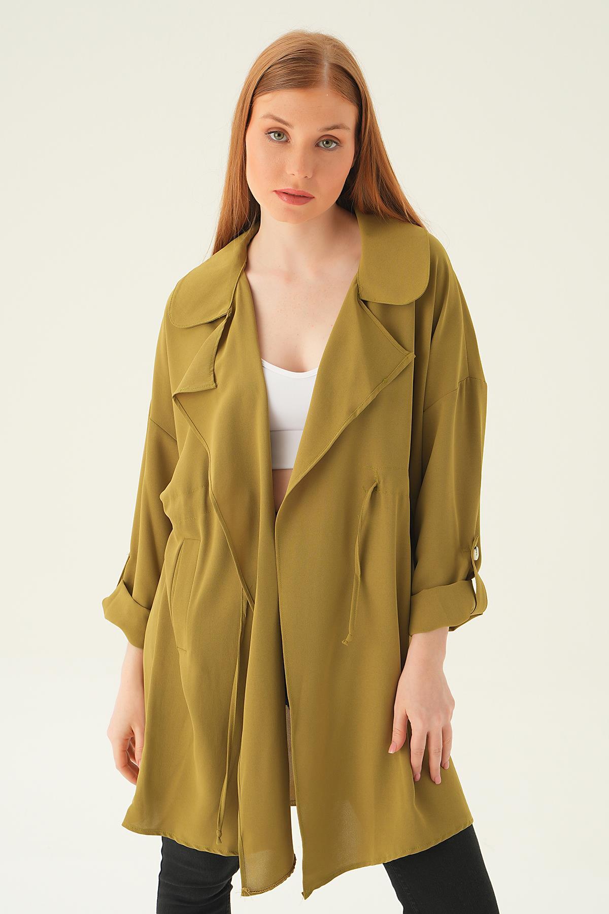 Olive Yeşili Kol Katlama Bel Bağlamalı Ceket 6833A