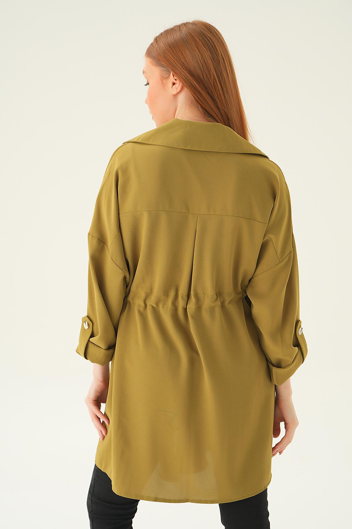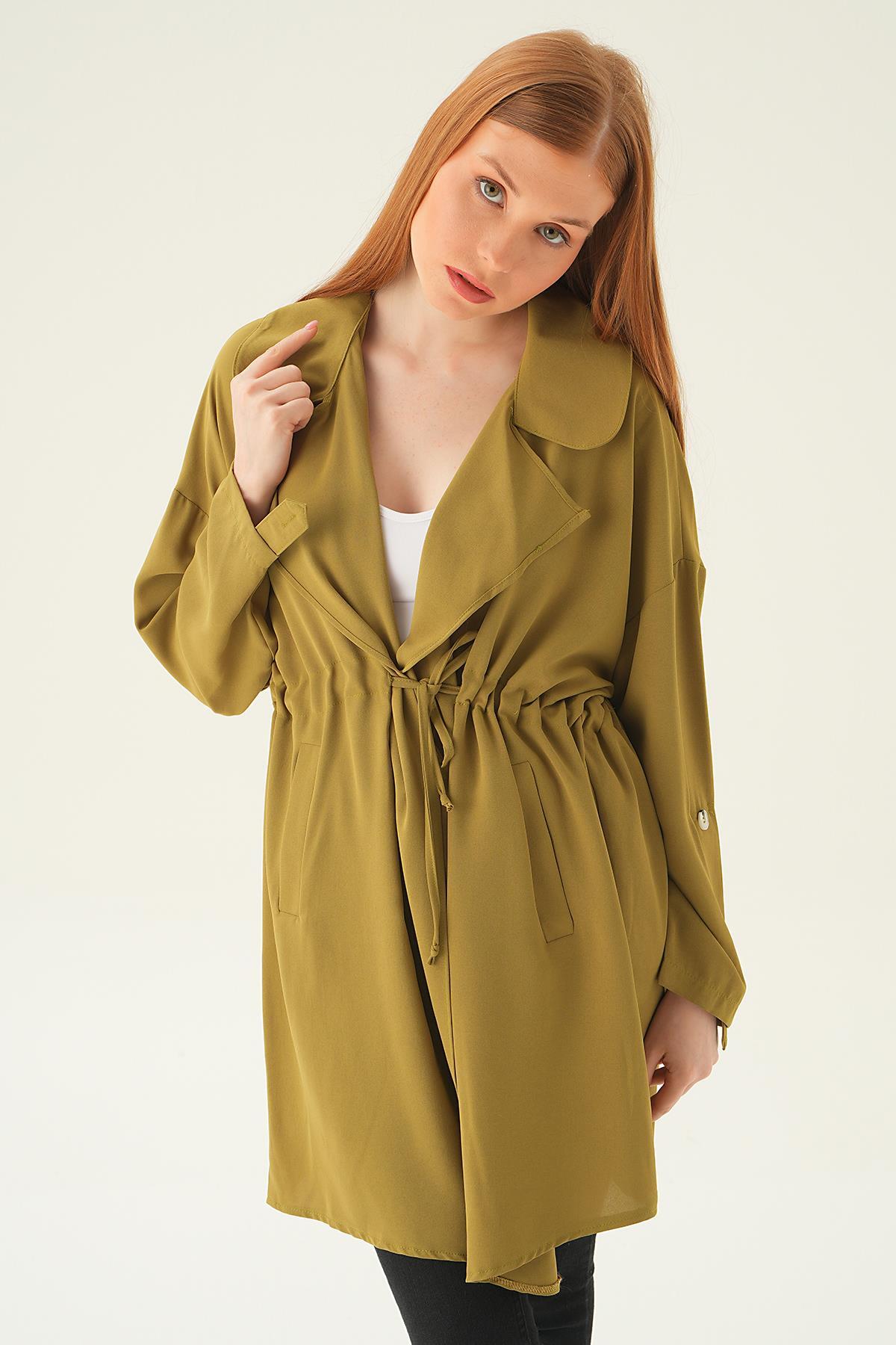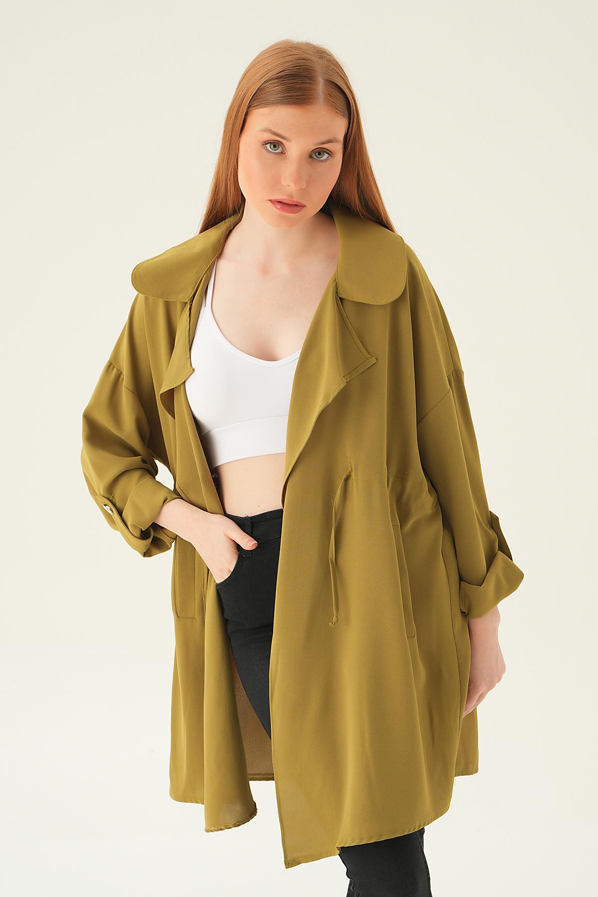 Olive Yeşili Kol Katlama Bel Bağlamalı Ceket 6833A