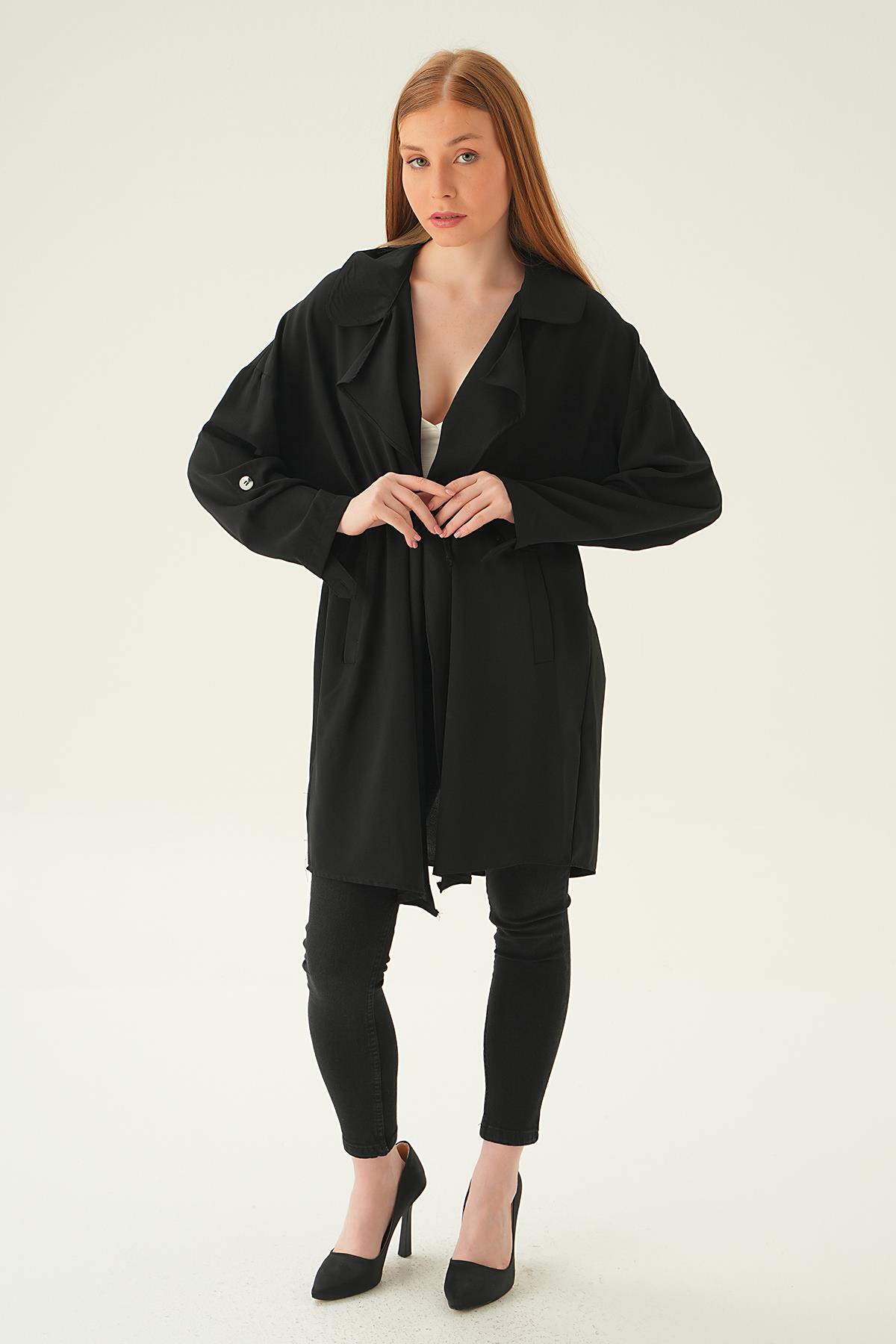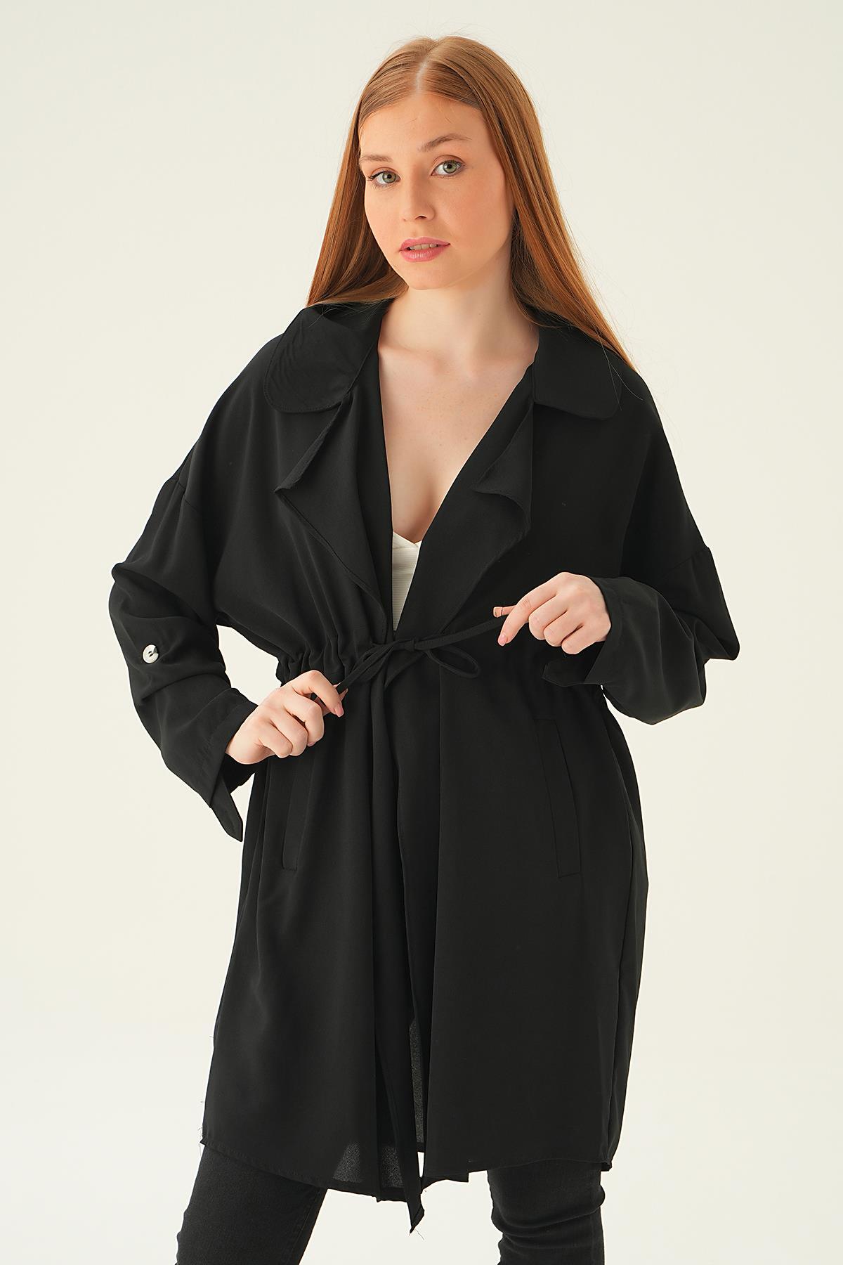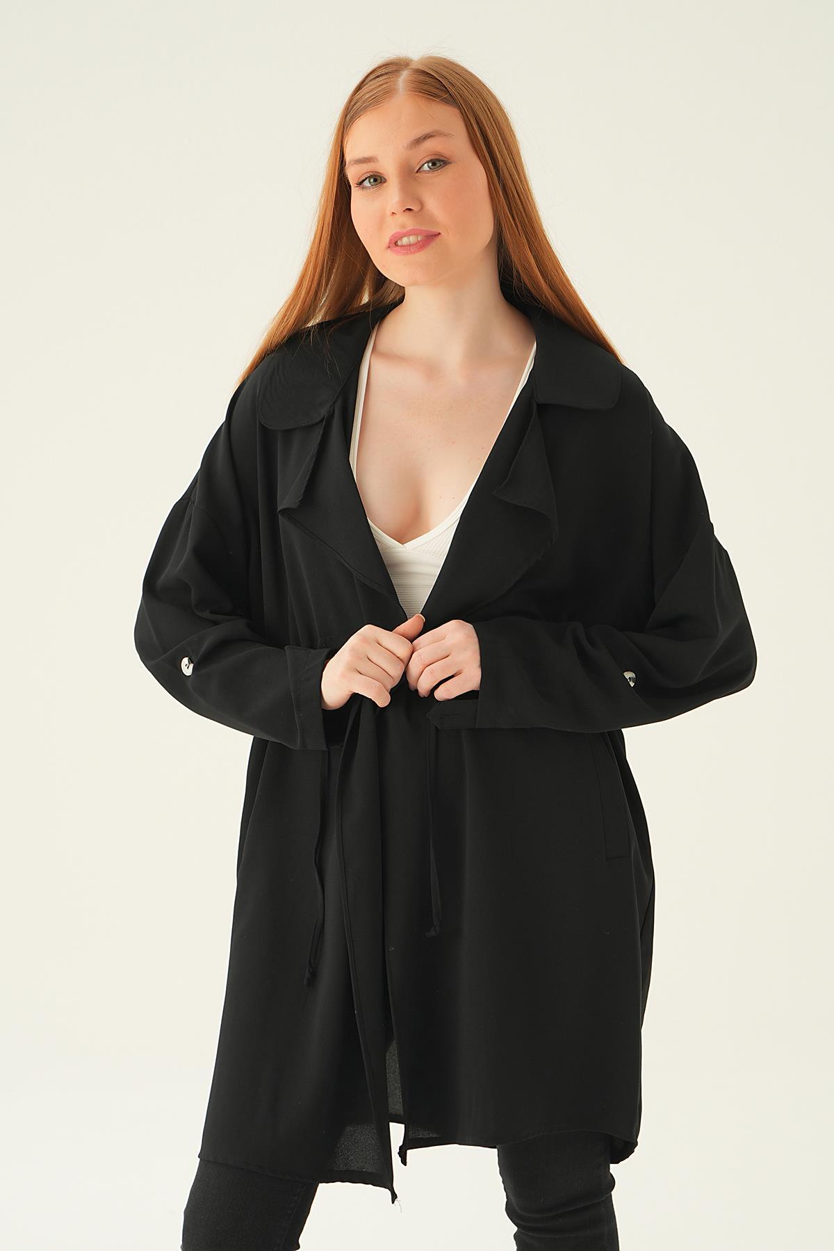 Siyah Kol Katlama Bel Bağlamalı Ceket 6833A