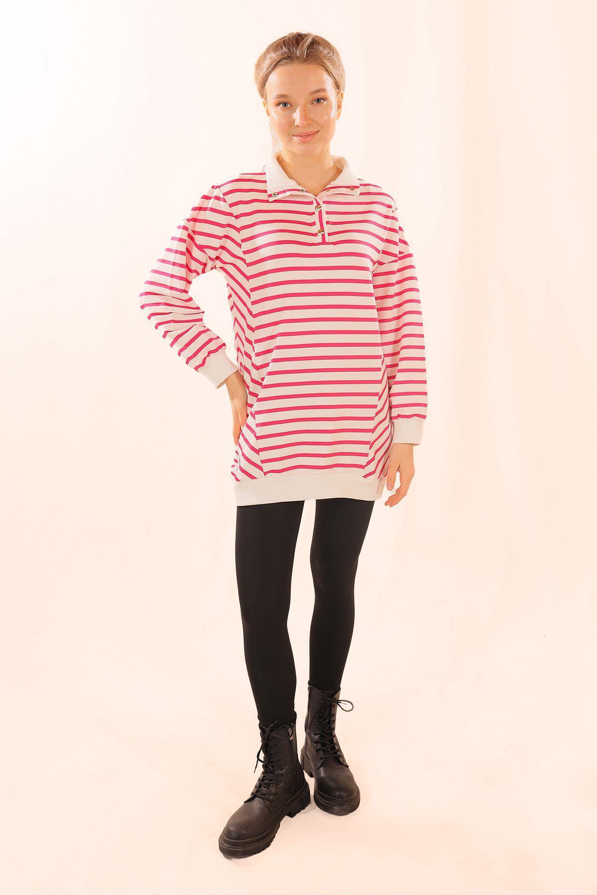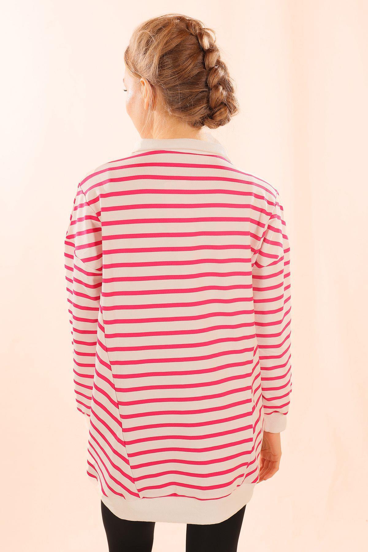 Fuşya Yaka Çıtçıtlı Çizgili Sweat 6868