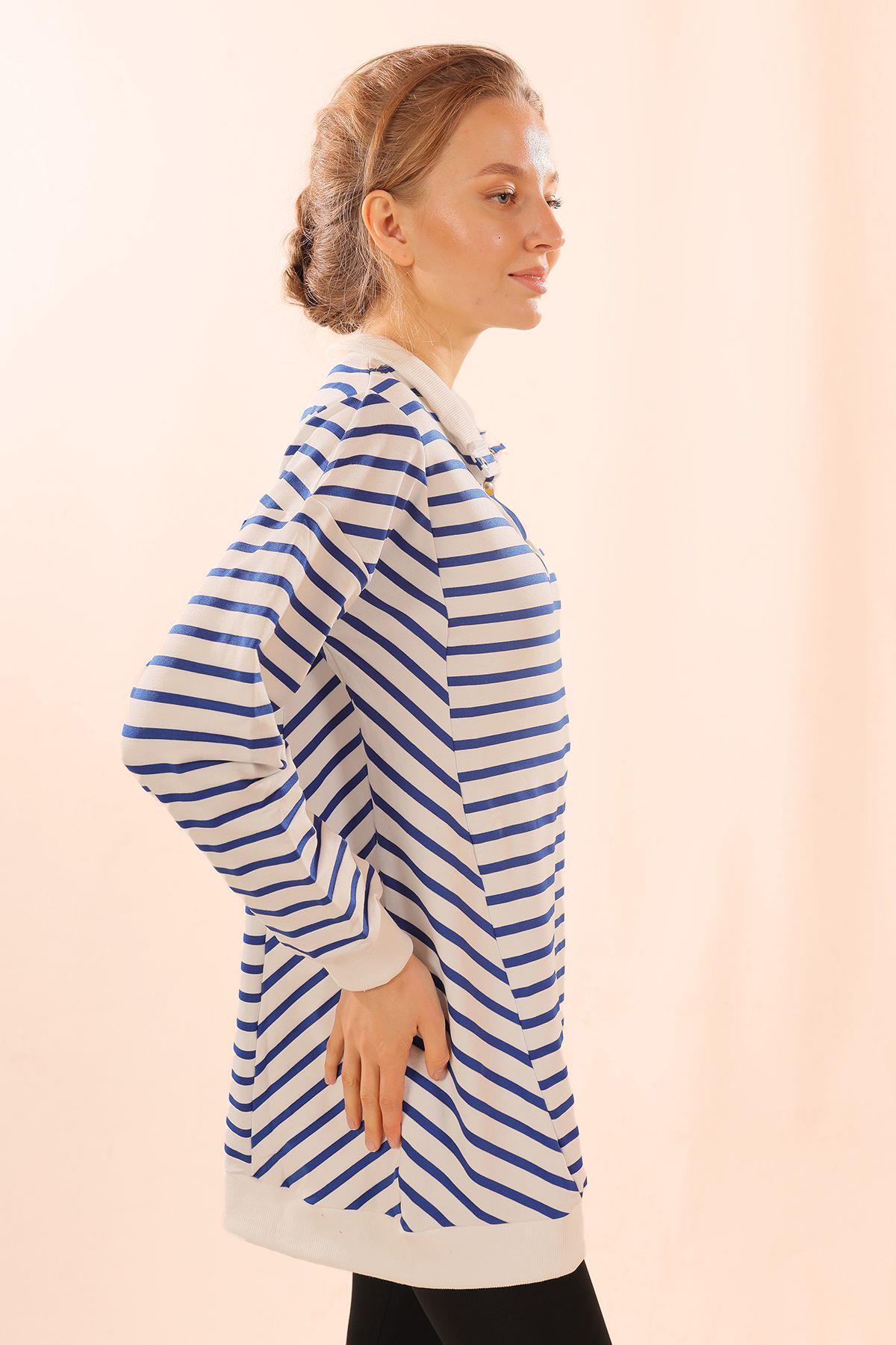 Saks Yaka Çıtçıtlı Çizgili Sweat 6868