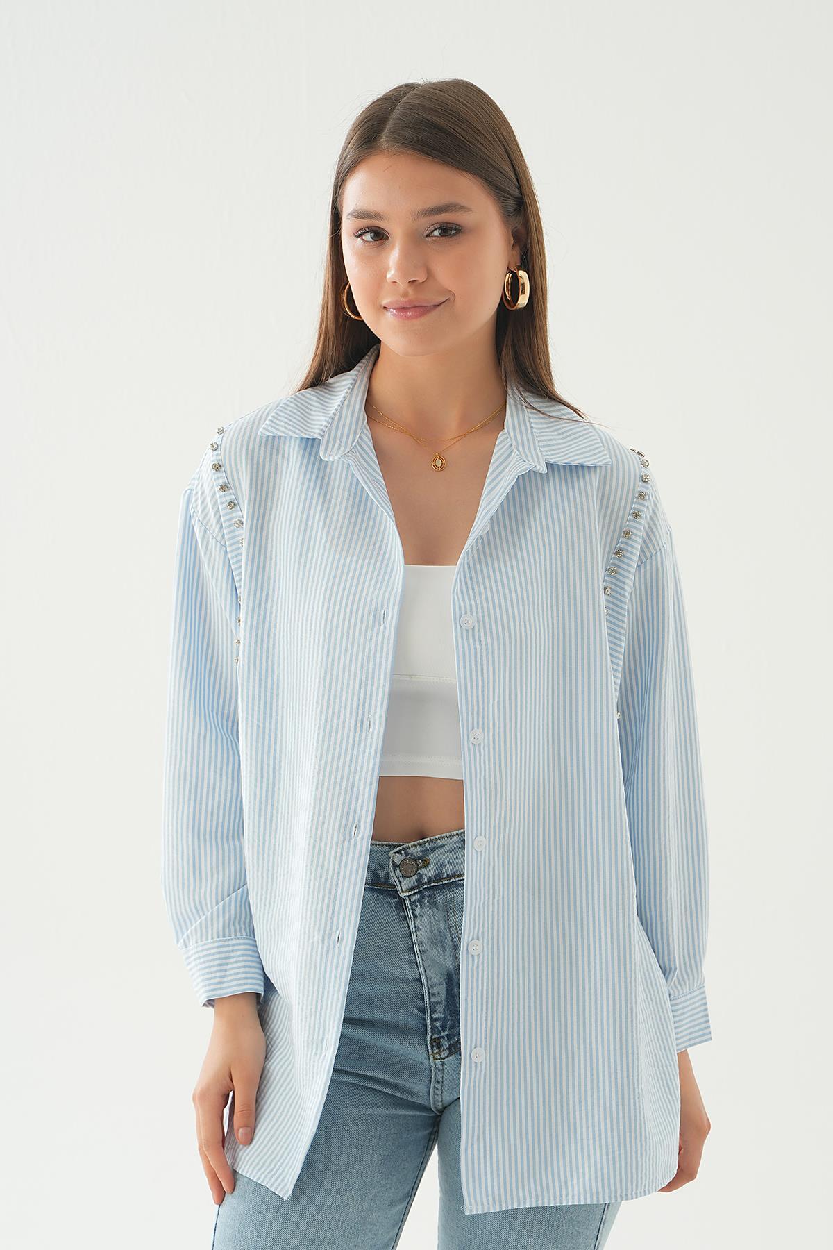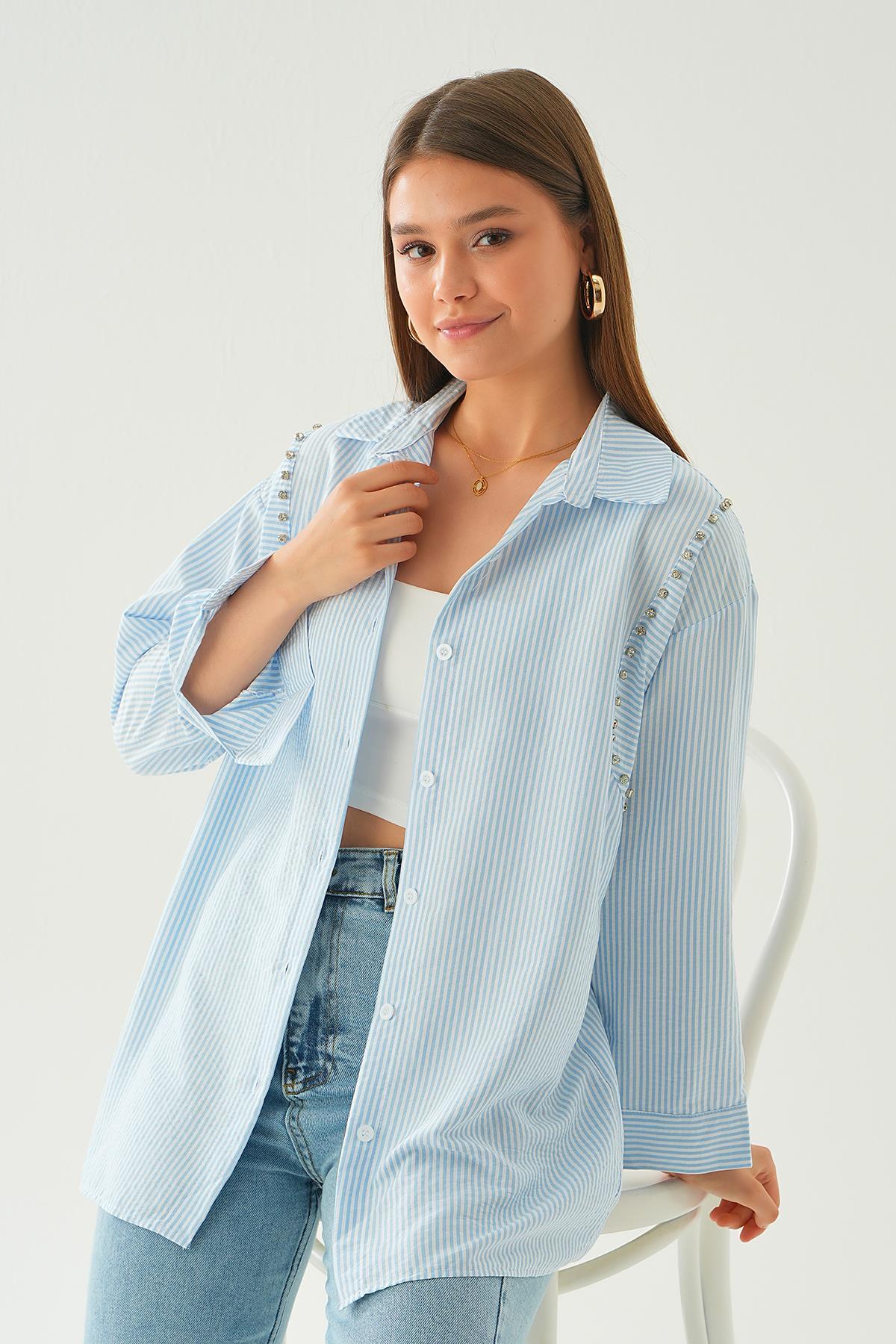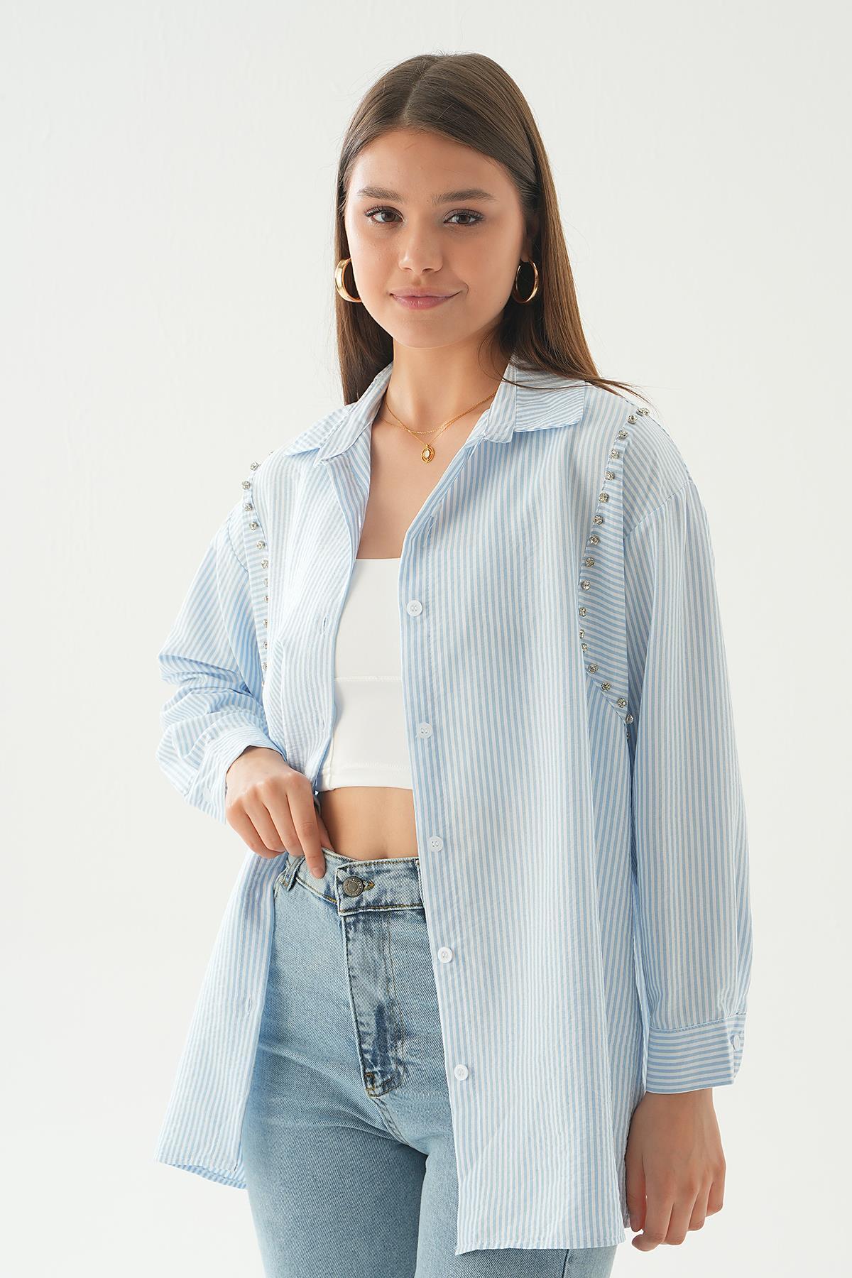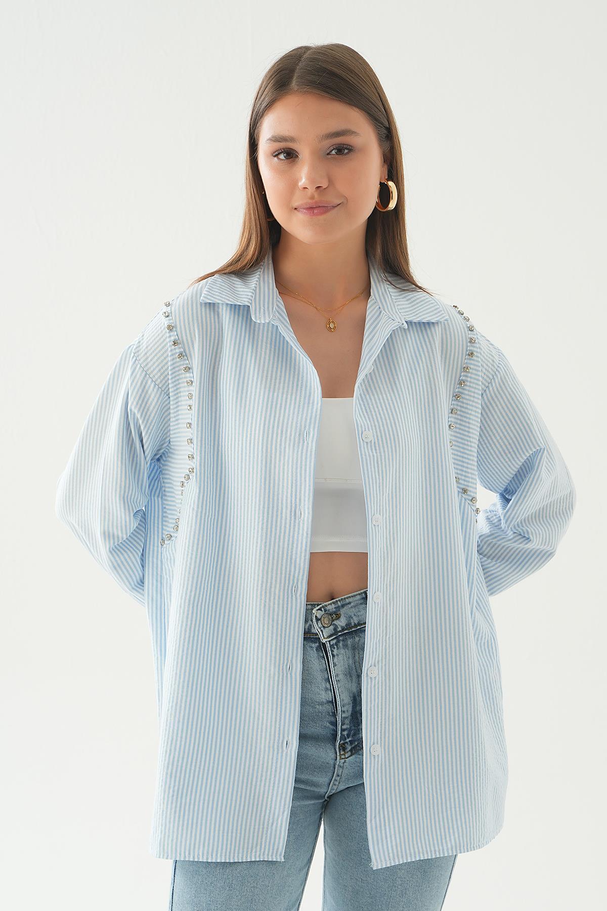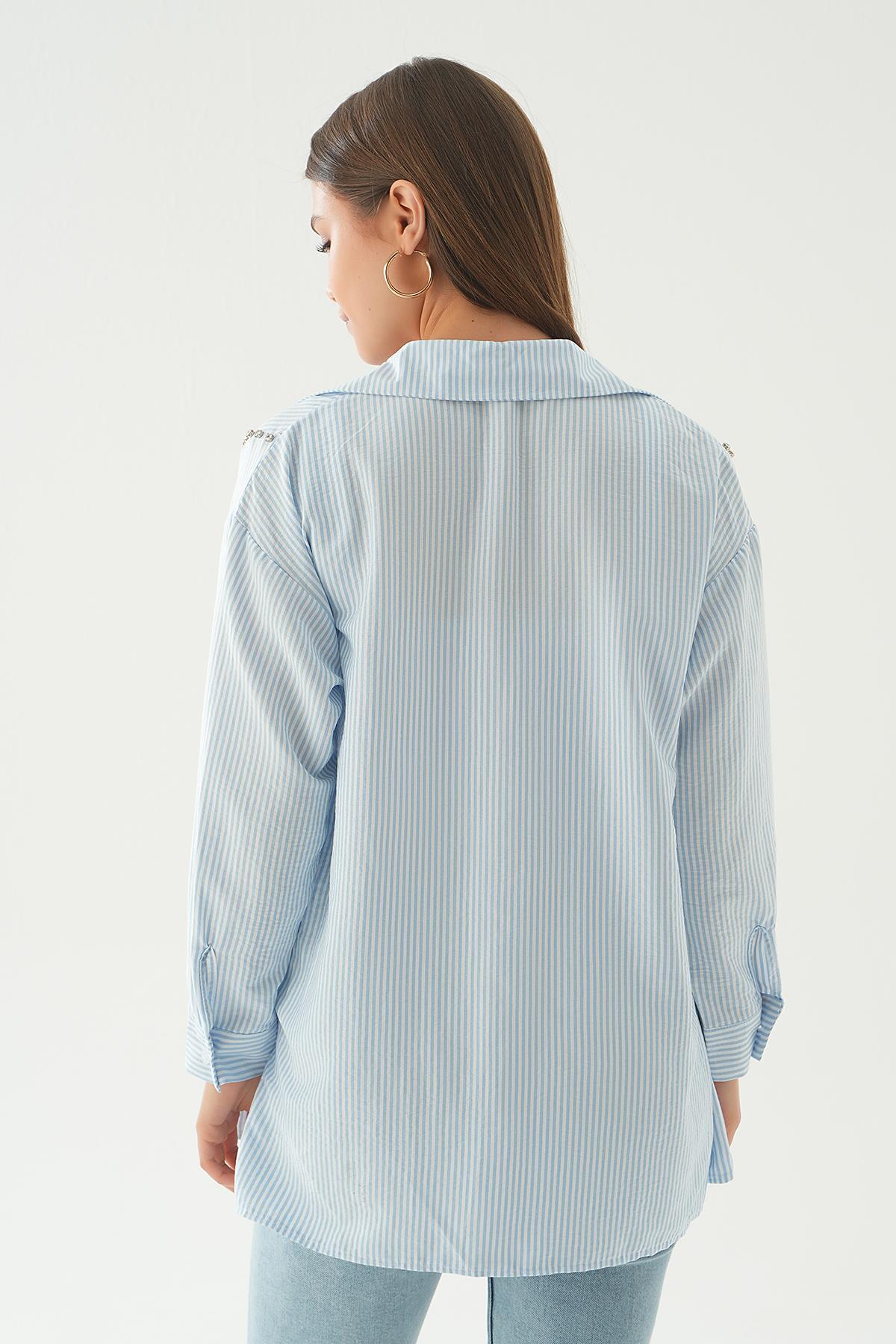 Mavi Taş Detay Çizgili Gömlek 6896A