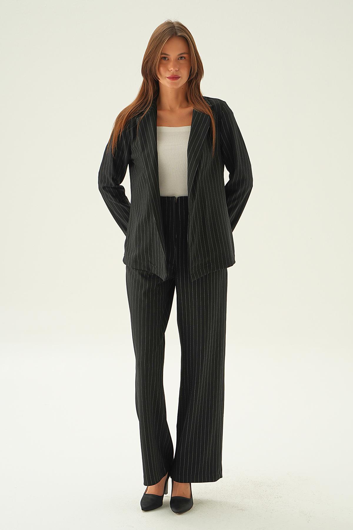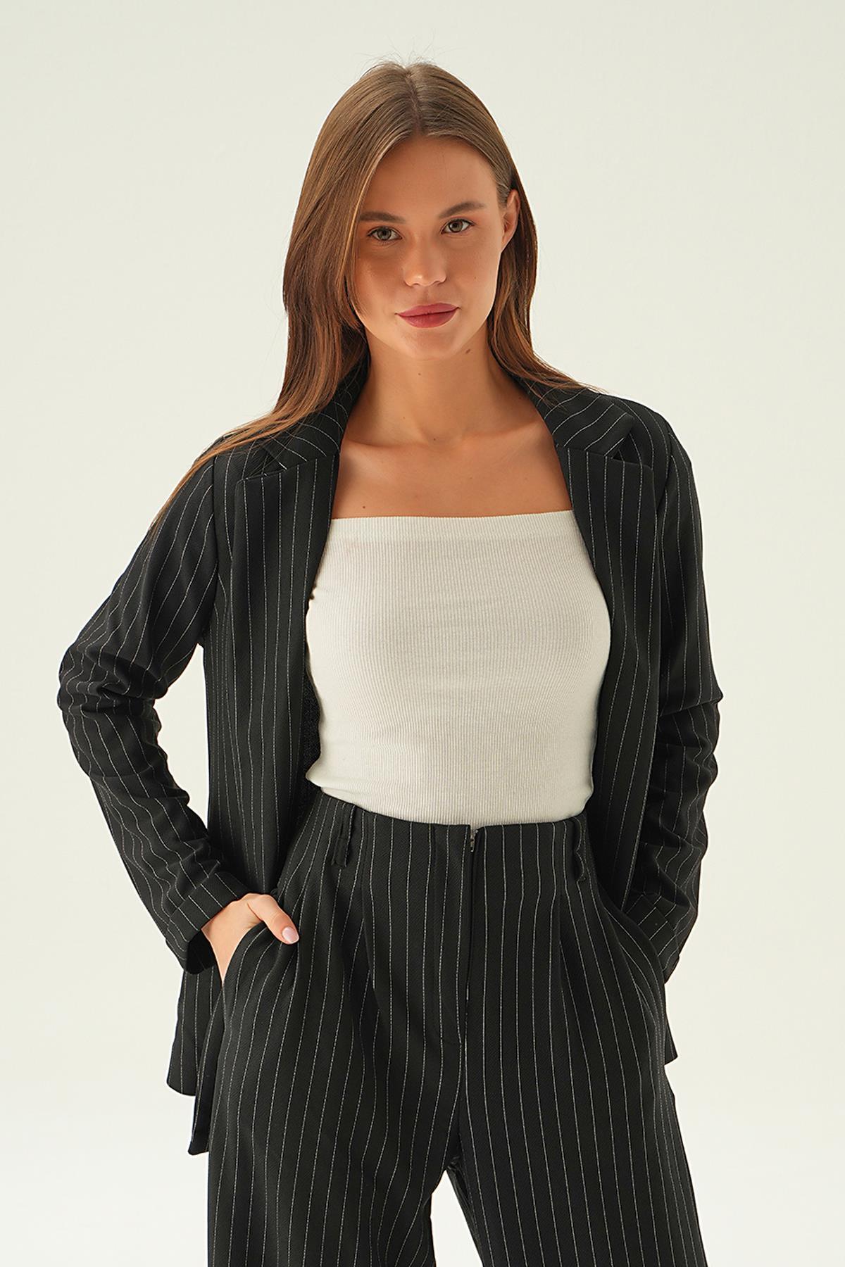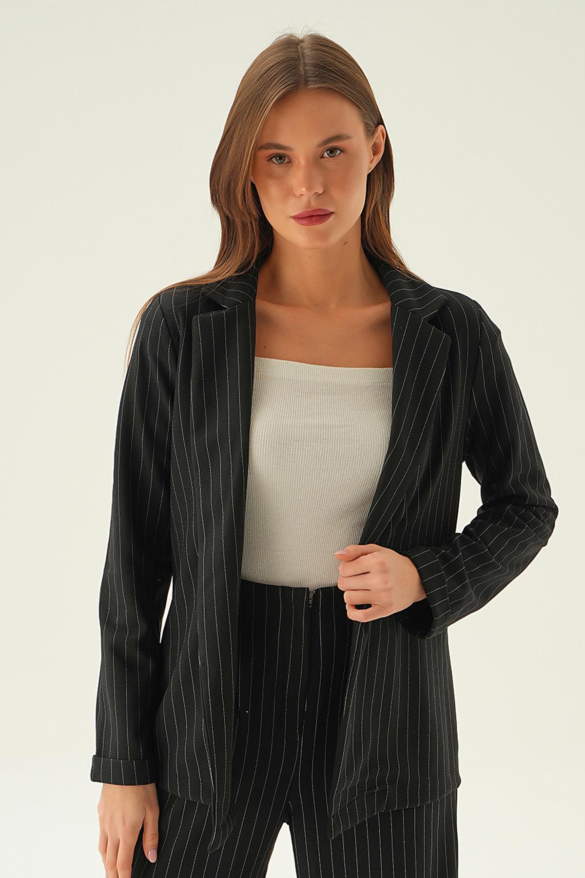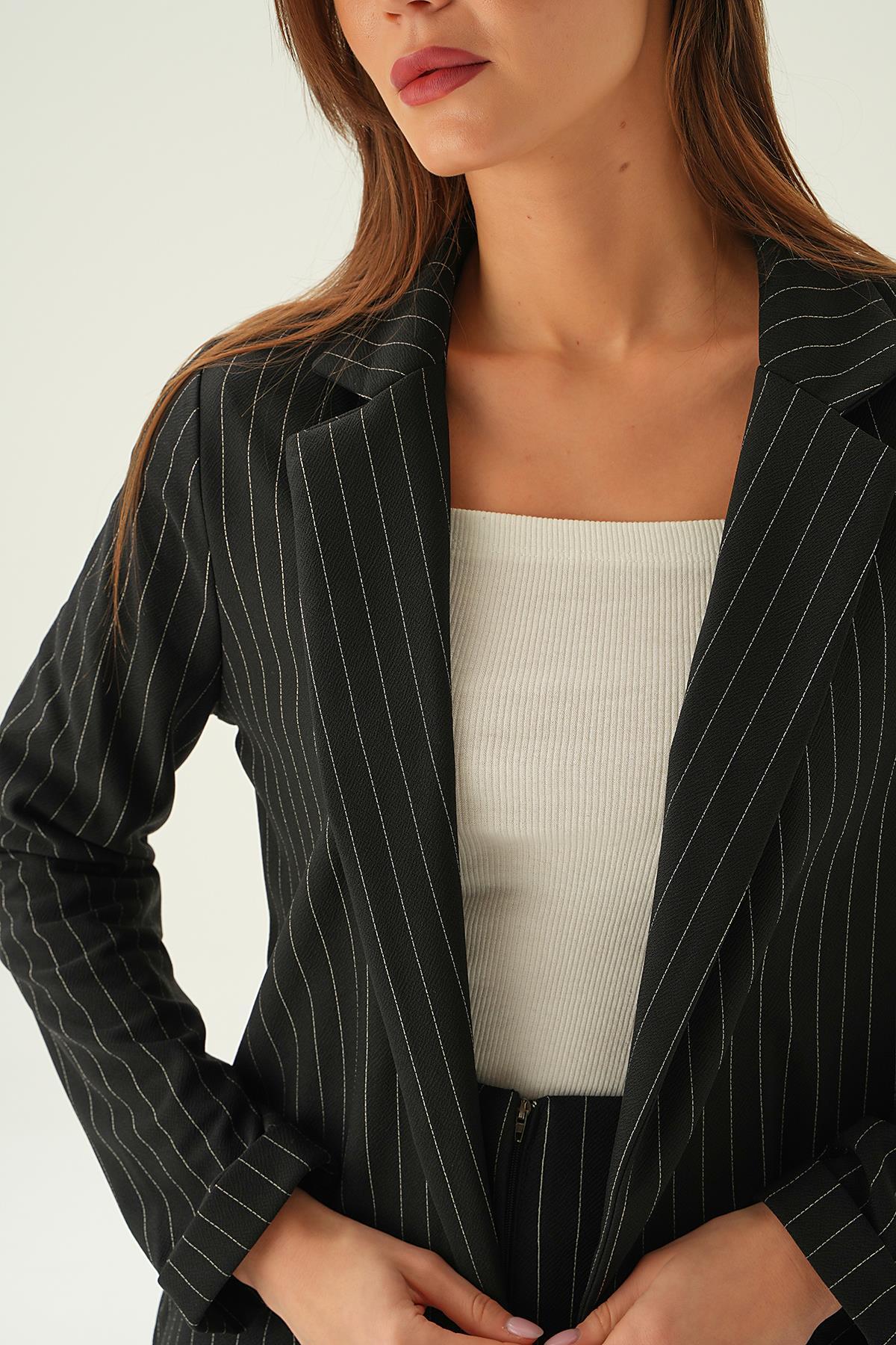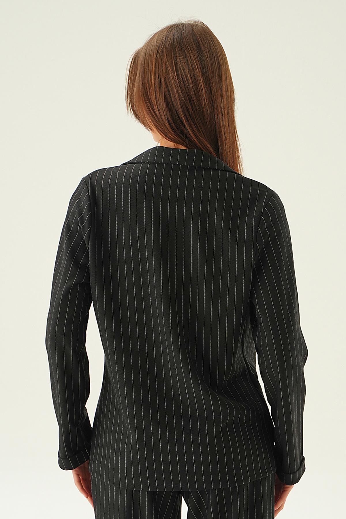 Siyah Kol Katlamalı Çizgili Ceket 6914A