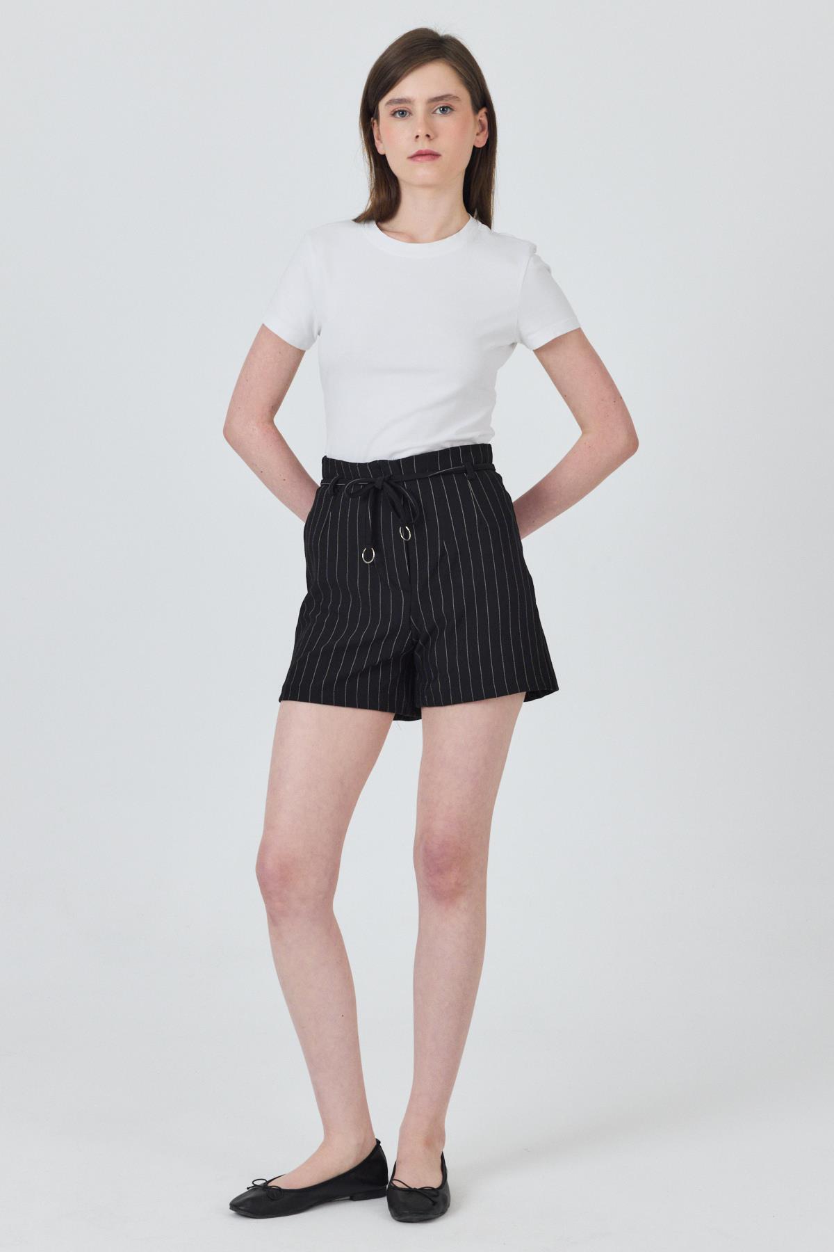 Siyah Çizgili Yüksek Bel Kemer Detaylı Mini Şort 6928A