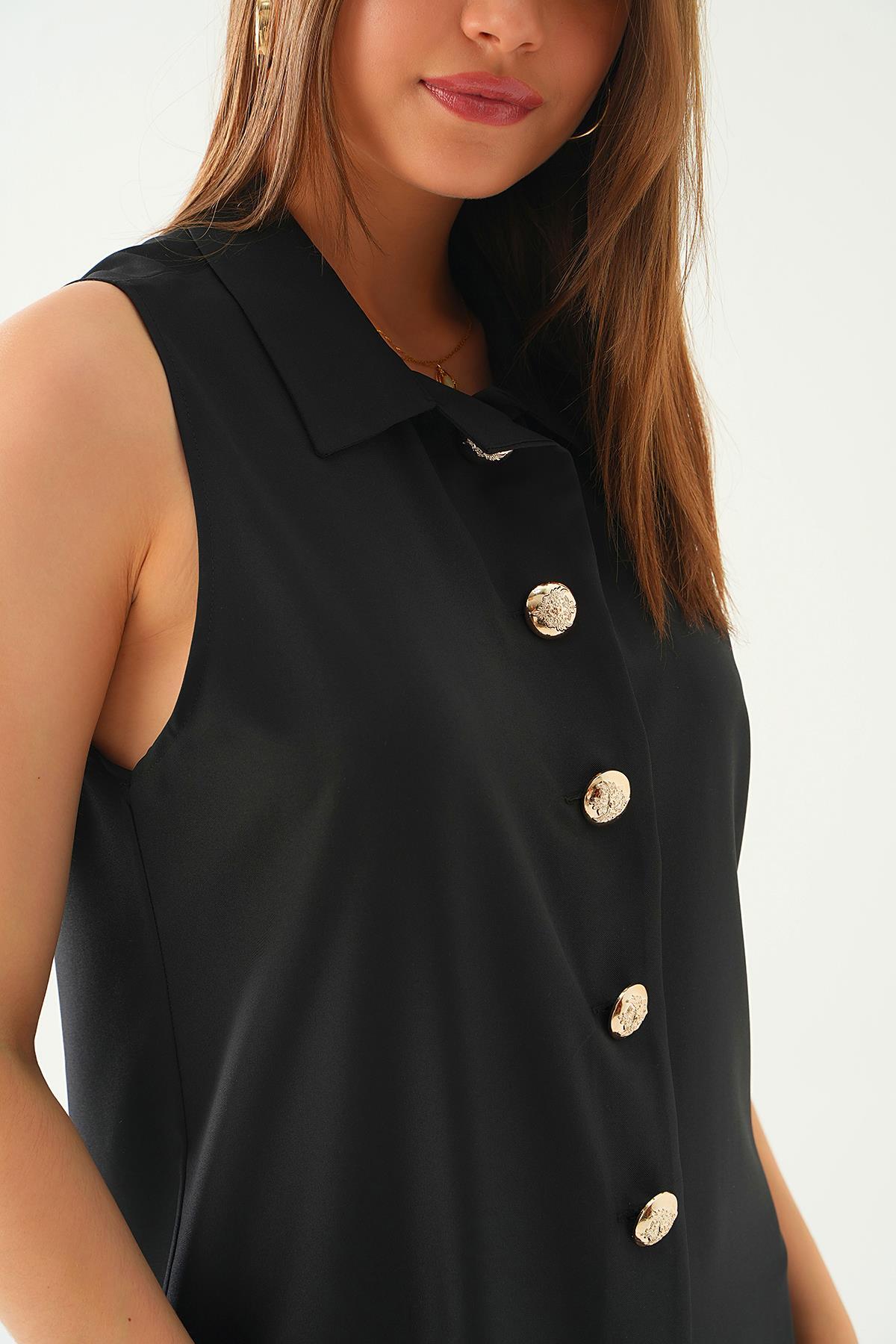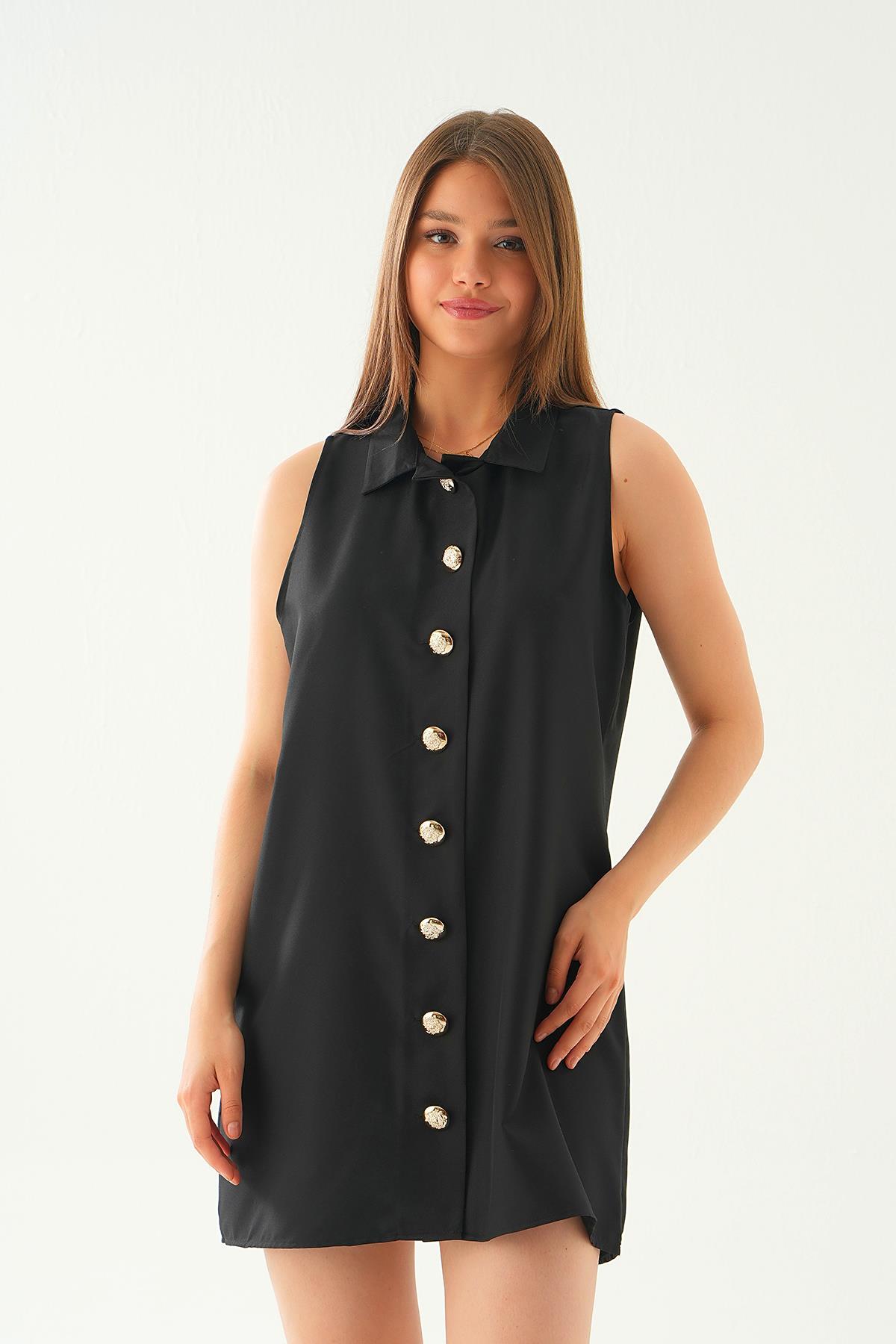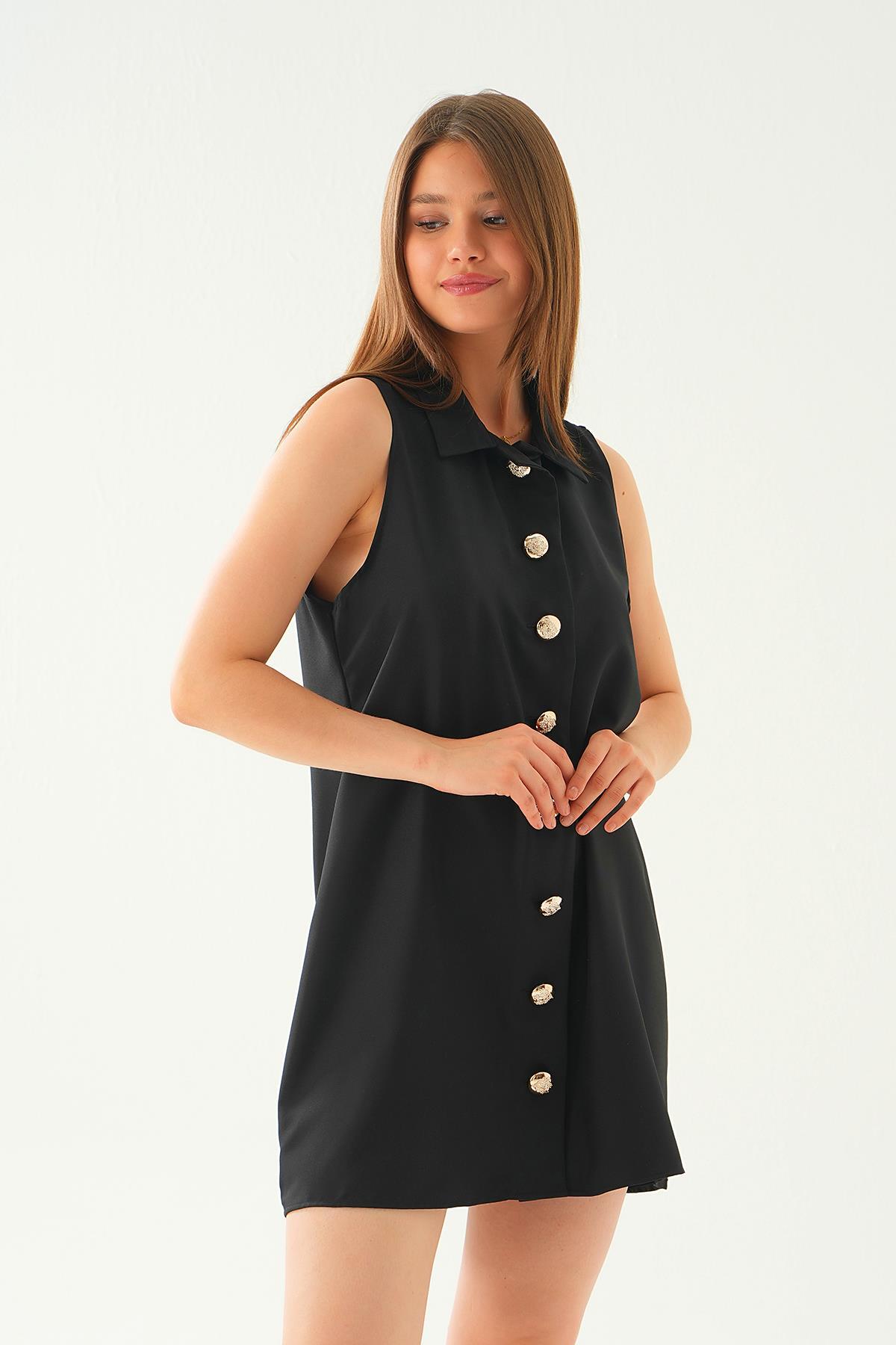 Siyah Sıfır Kol Düğmeli Elbise 7001