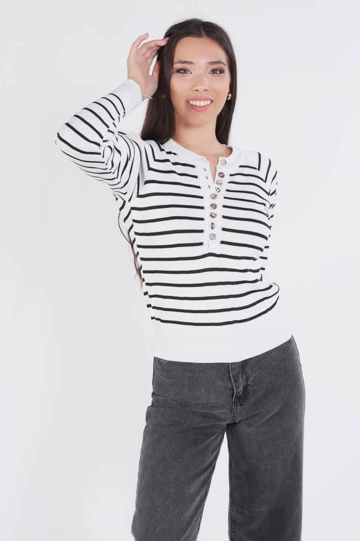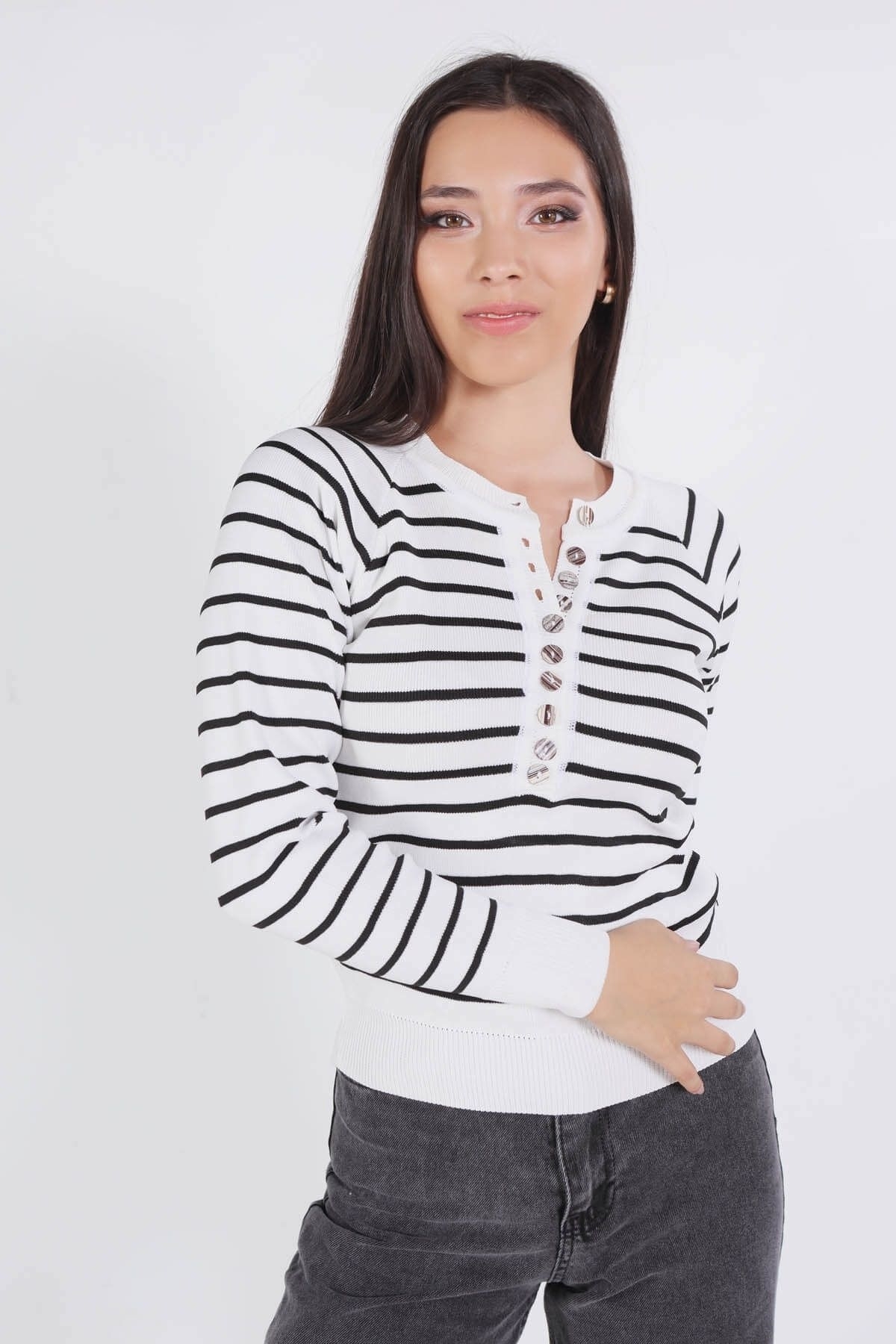 Beyaz-Siyah Çizgili Düğmeli Kazak 7010