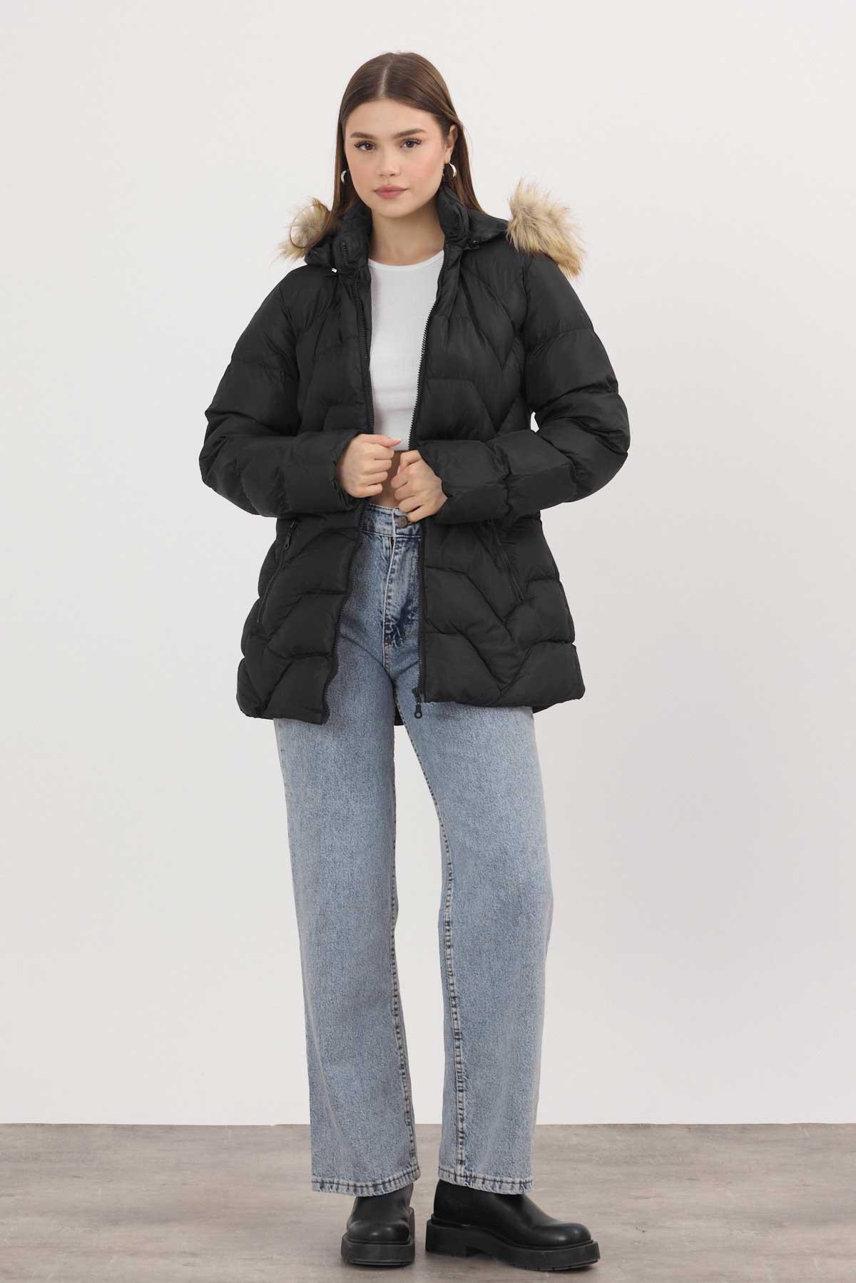 Siyah Kapüşonlu Dik Yaka Fermuarlı Kısa Şişme Kadın Mont 8002