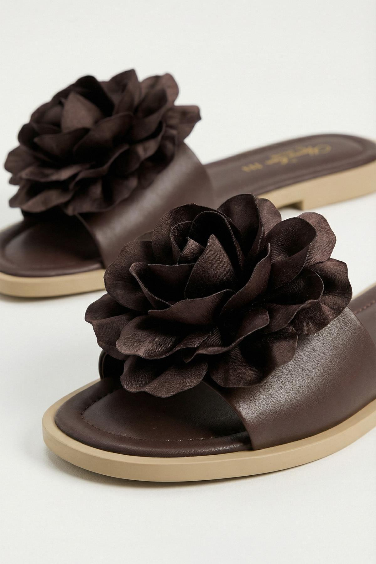 Kahve Çiçek Detay Terlik 7043