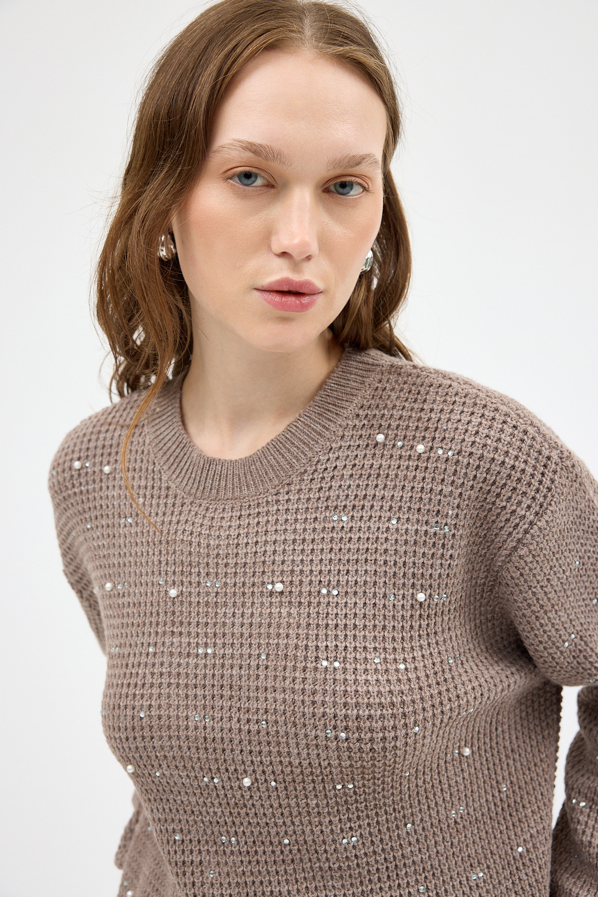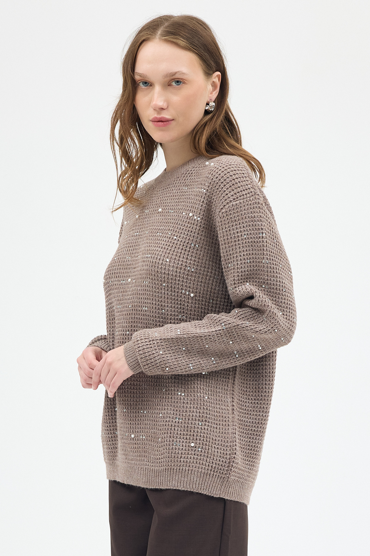 Koyu Vizon Kadın Taş İşleme Detaylı Bisiklet Yaka Triko Kazak 7045