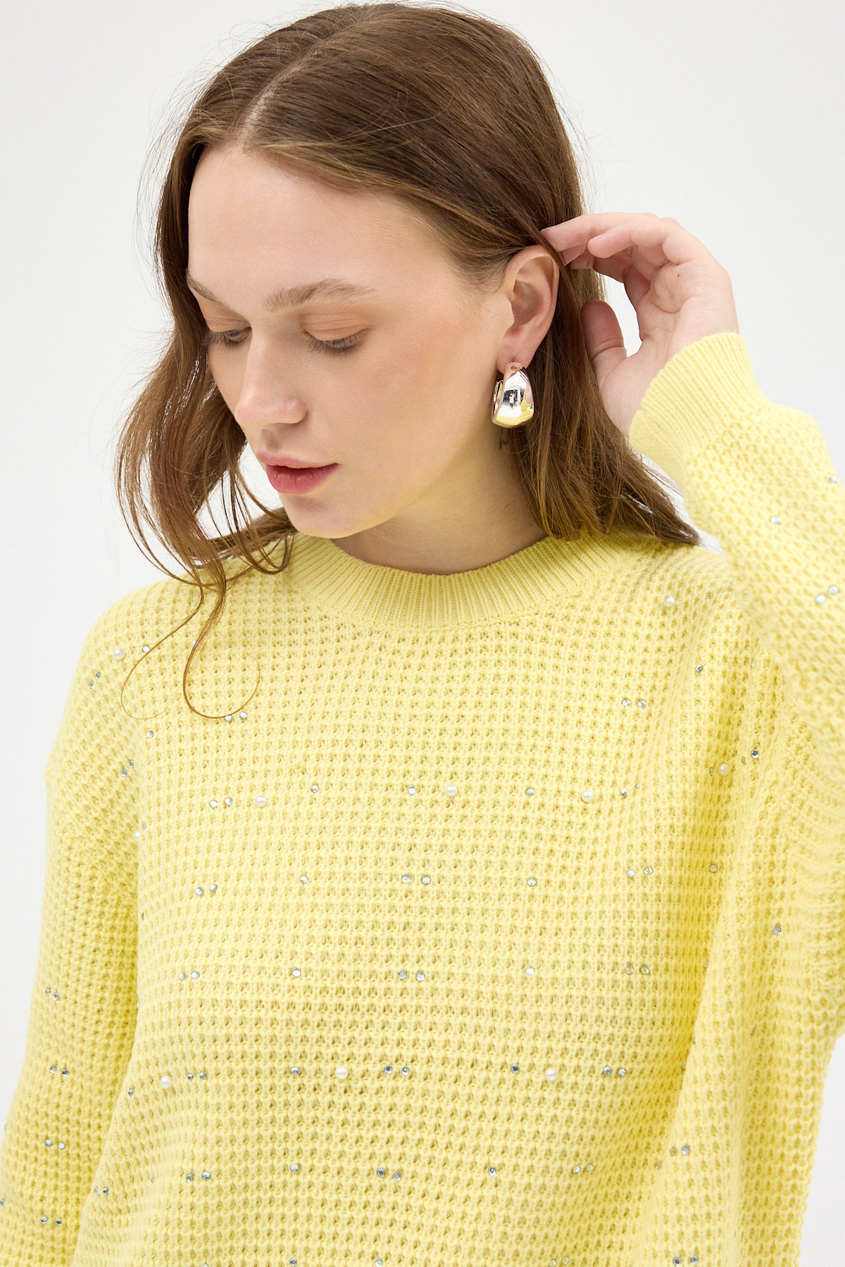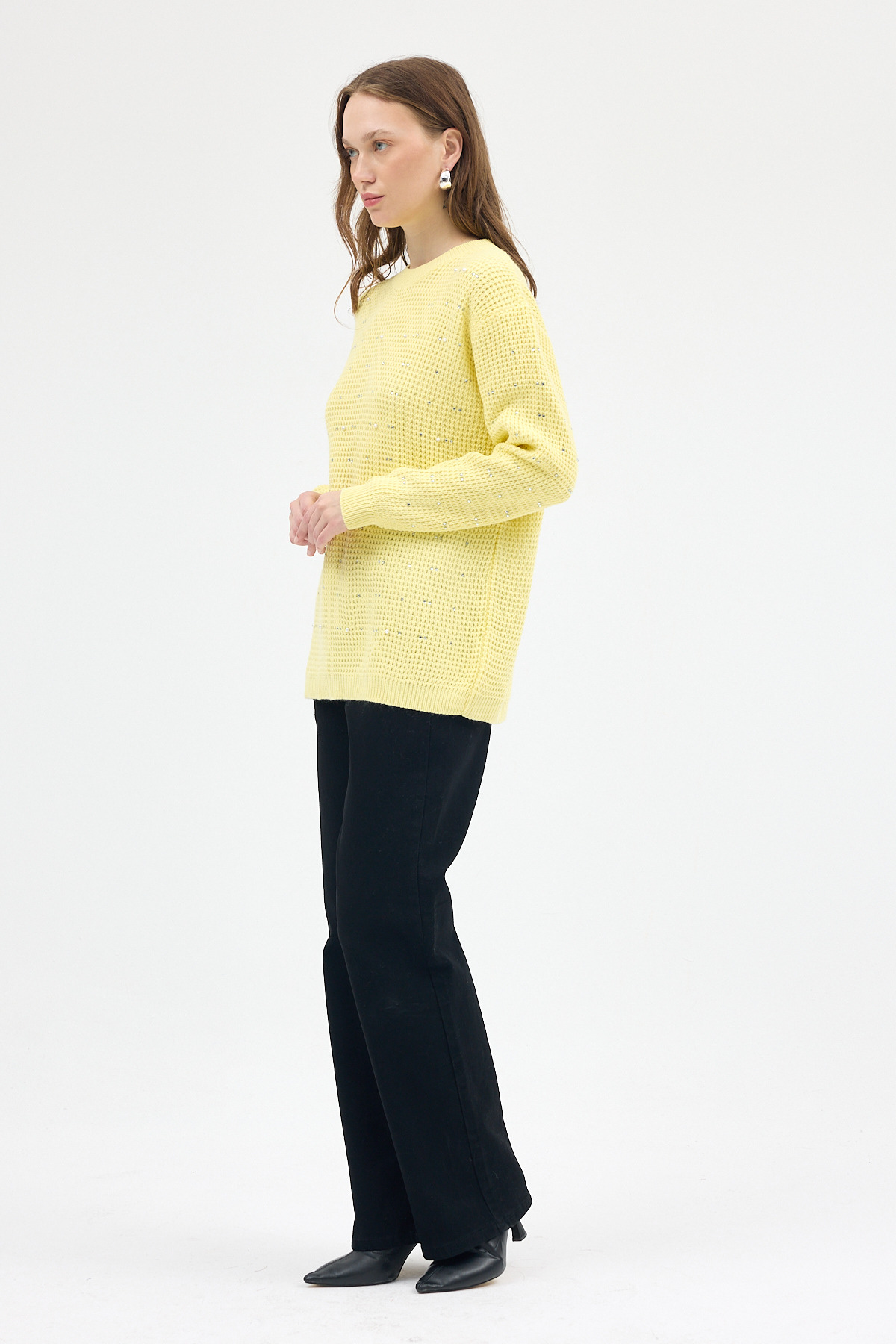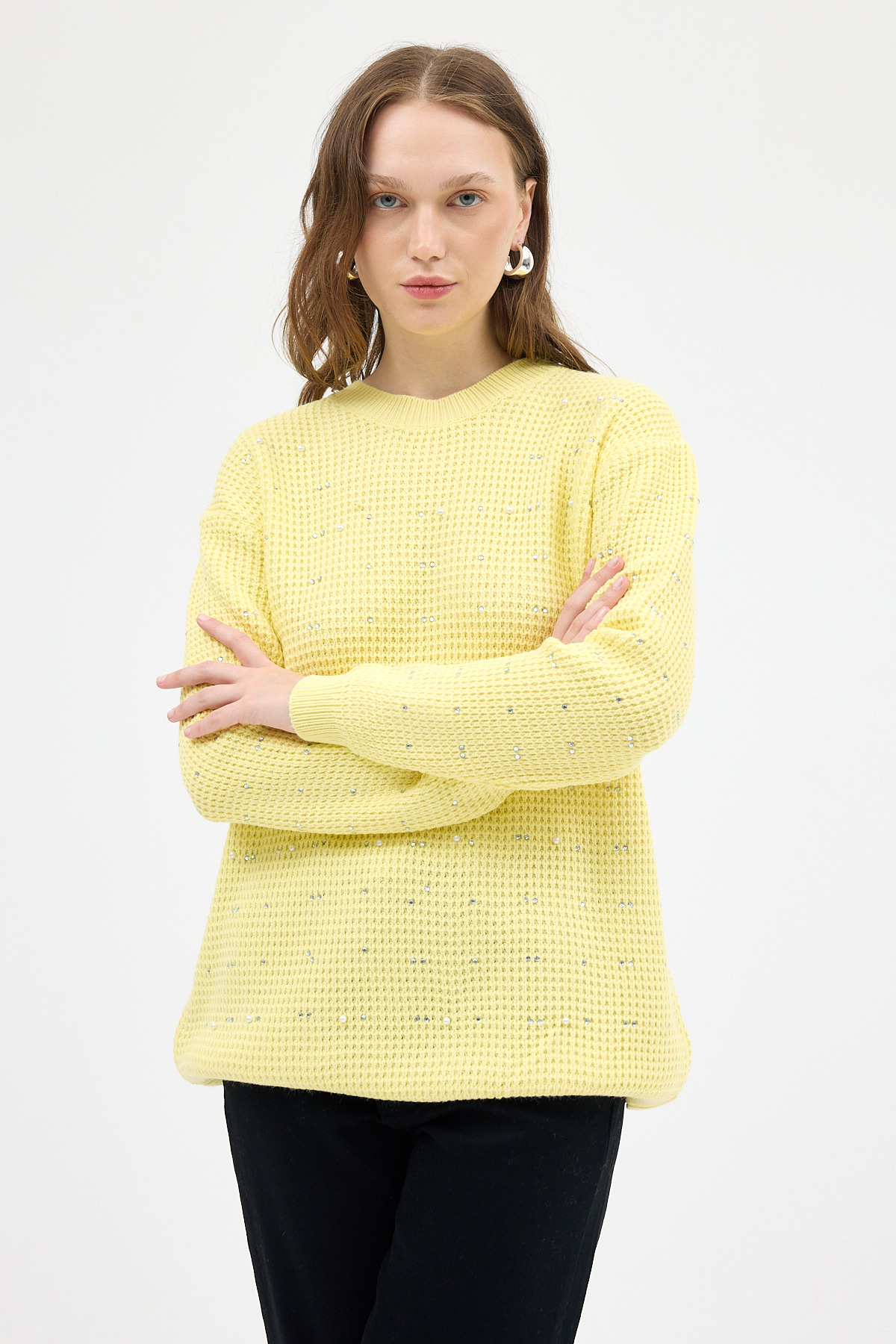 Sarı Kadın Taş İşleme Detaylı Bisiklet Yaka Triko Kazak 7045