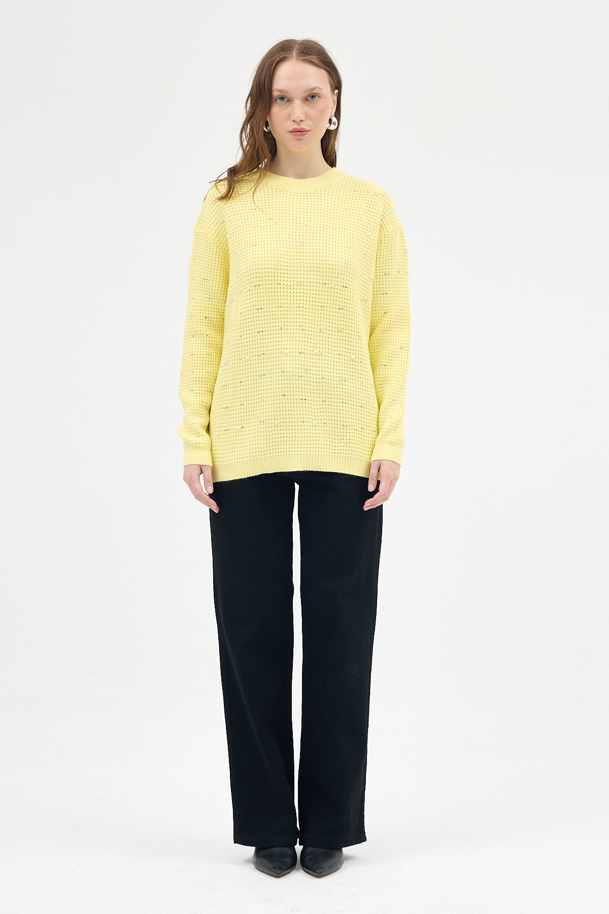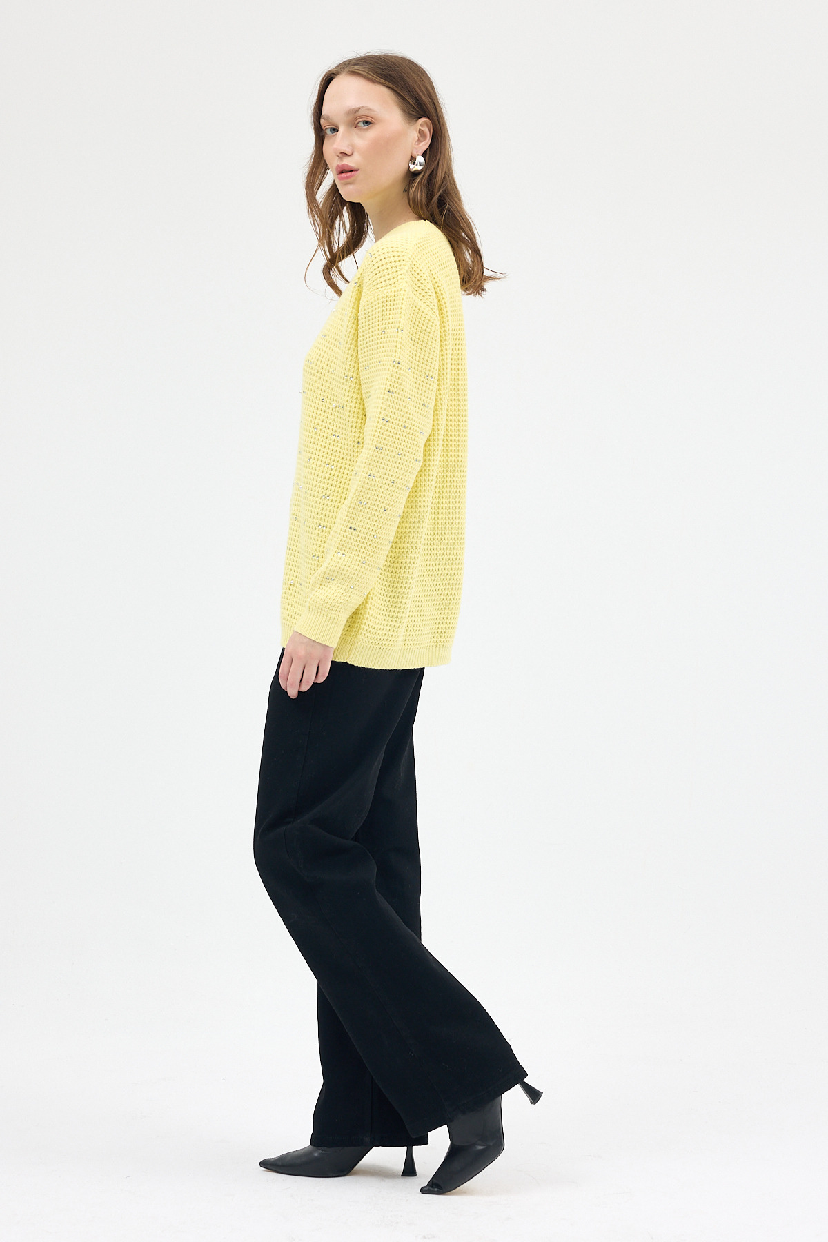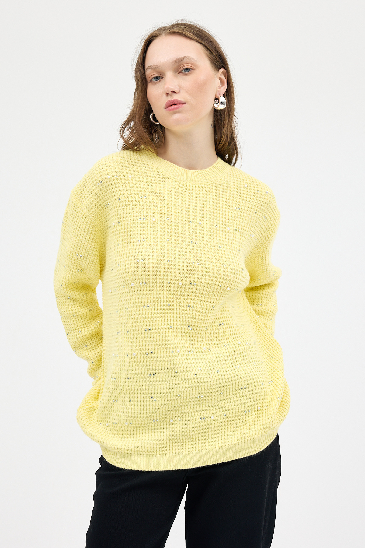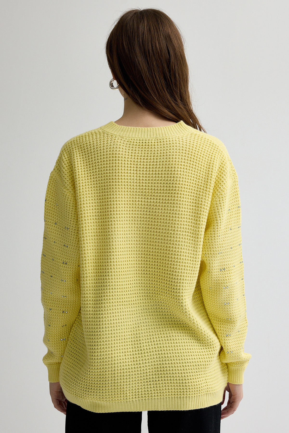 Sarı Kadın Taş İşleme Detaylı Bisiklet Yaka Triko Kazak 7045