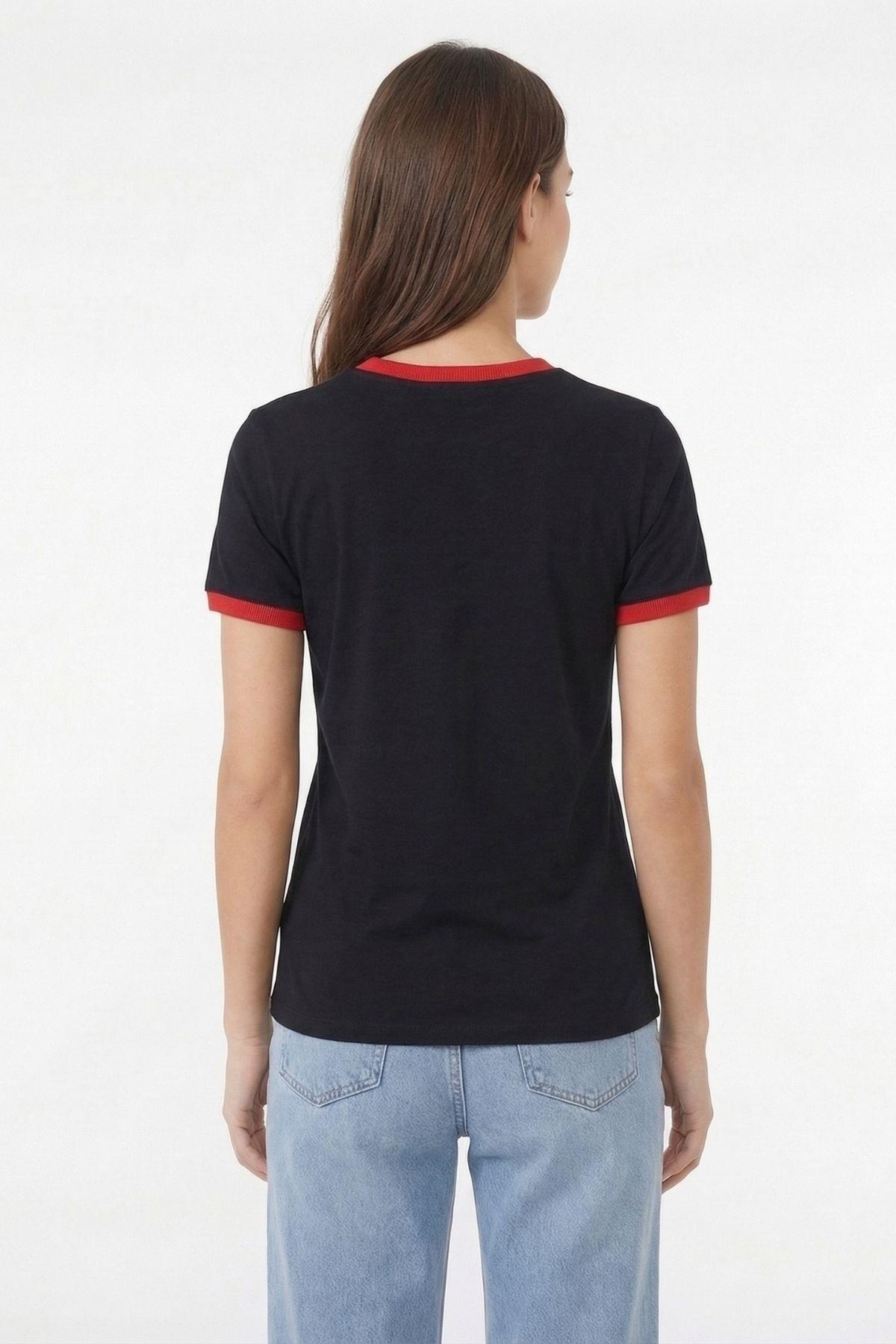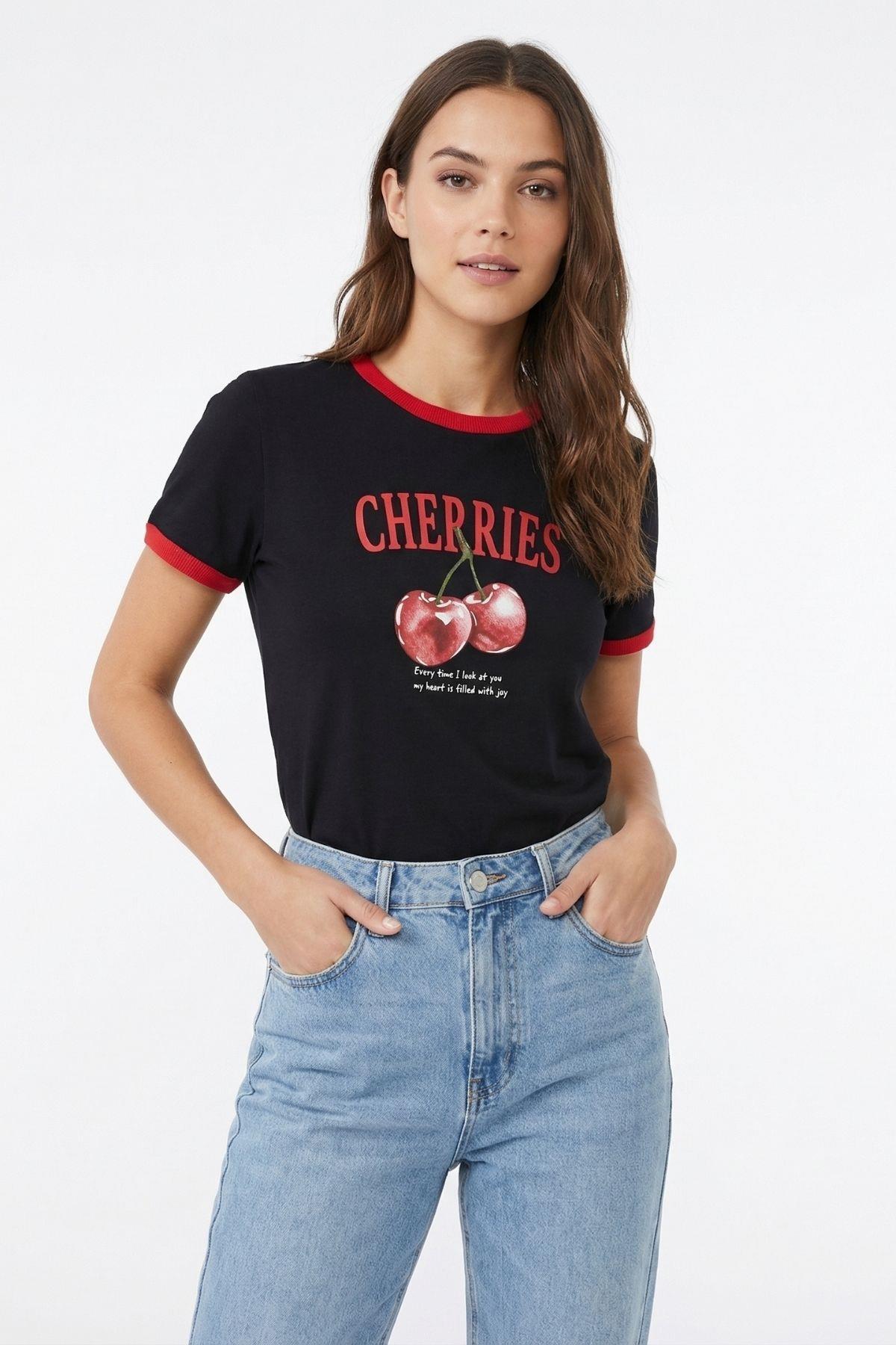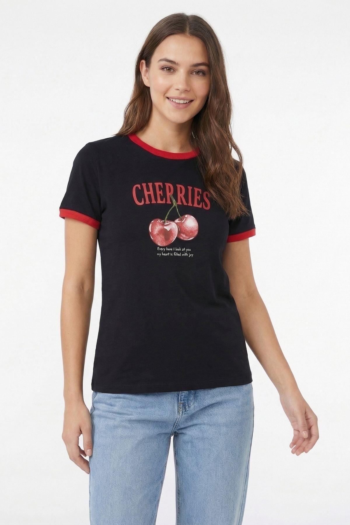 7062 Kiraz Desen Tişört Siyah