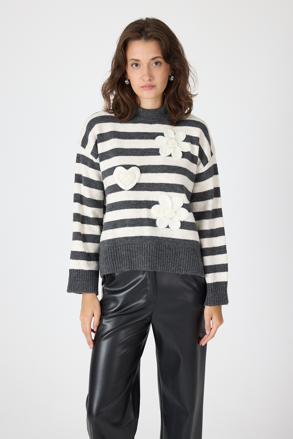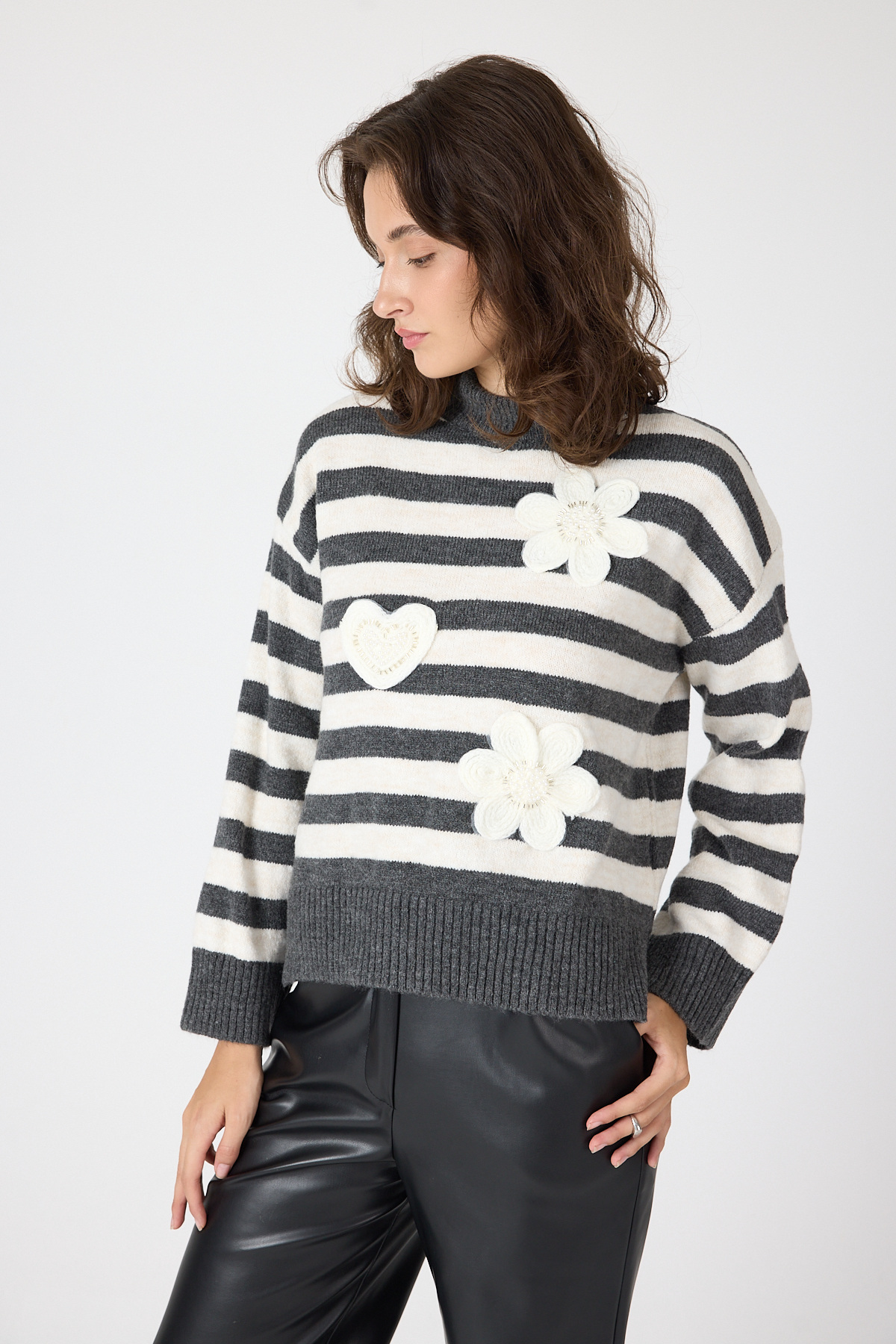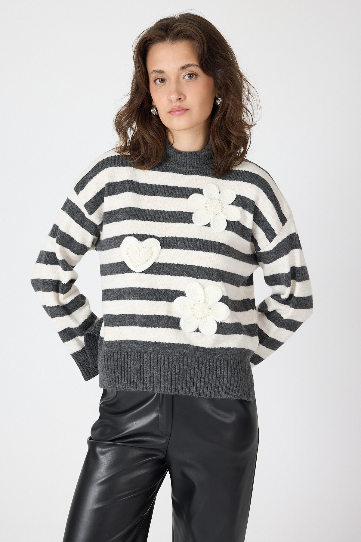 Gri Çizgili İşleme Detaylı Kazak 7090