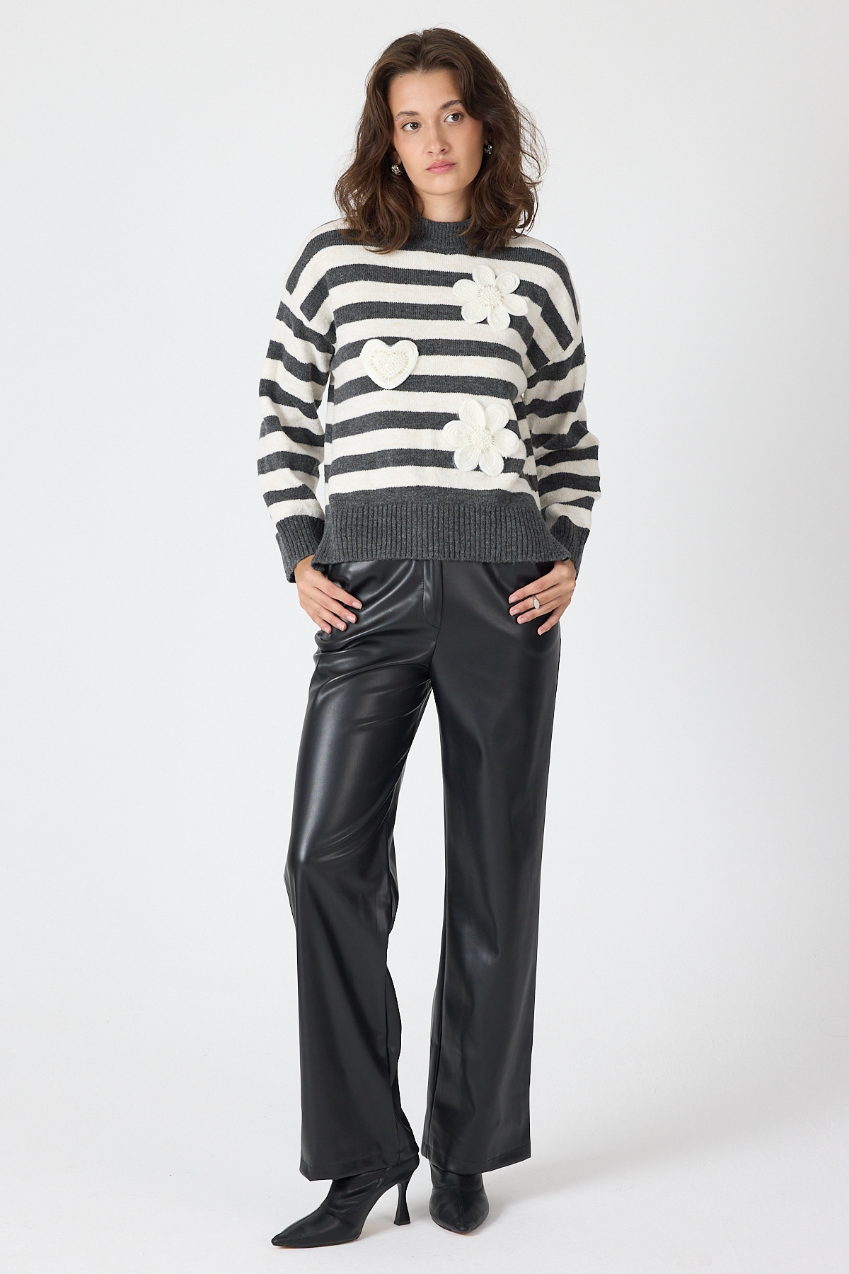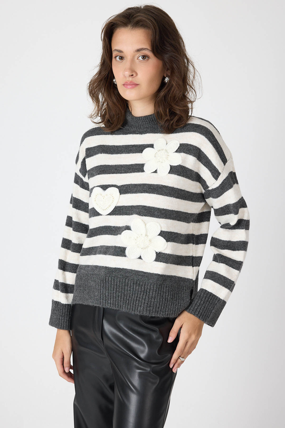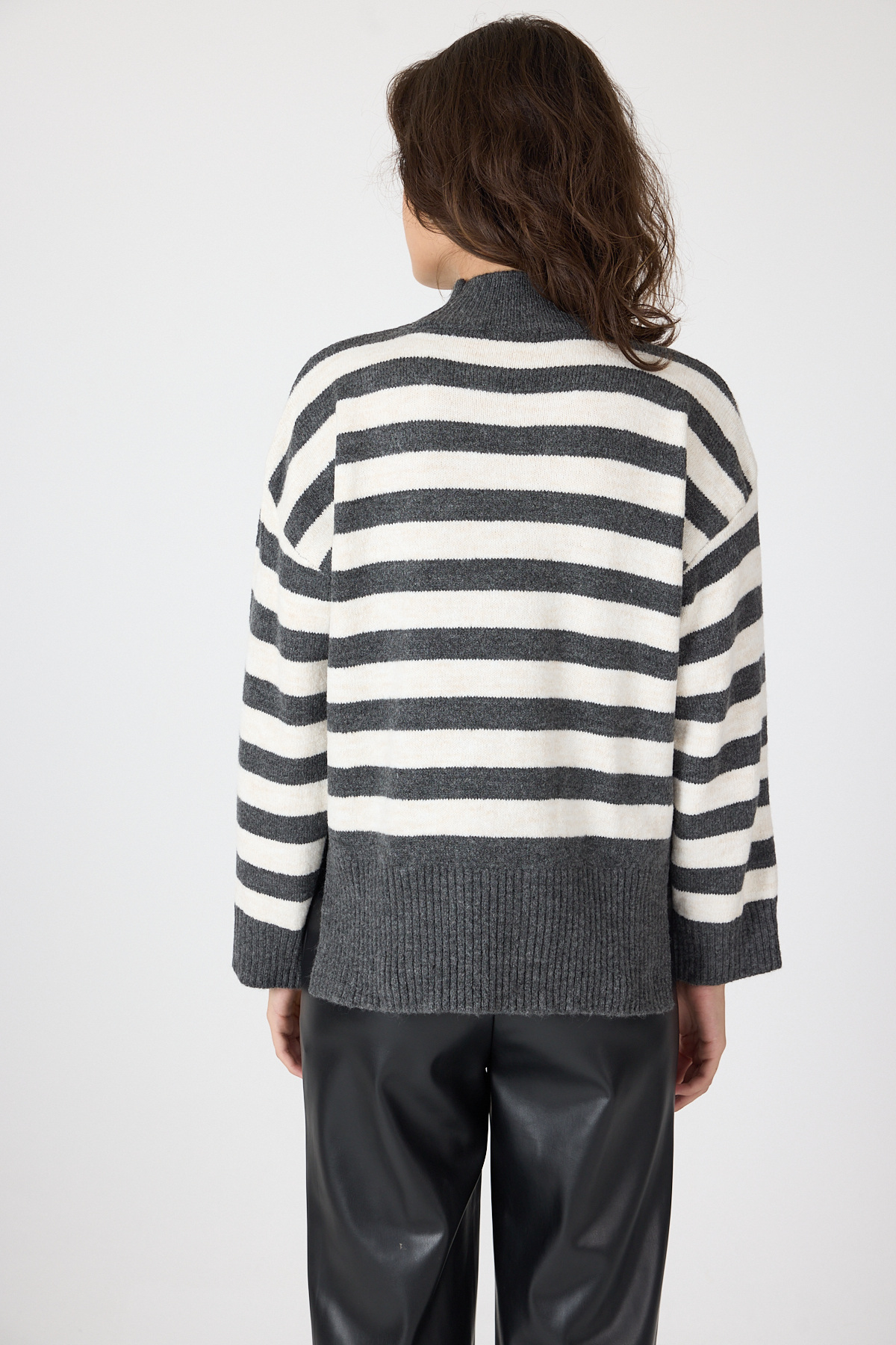 Gri Çizgili İşleme Detaylı Kazak 7090