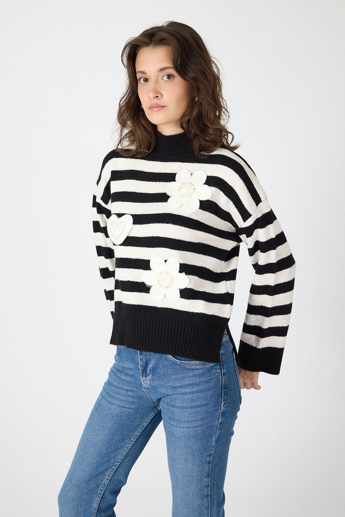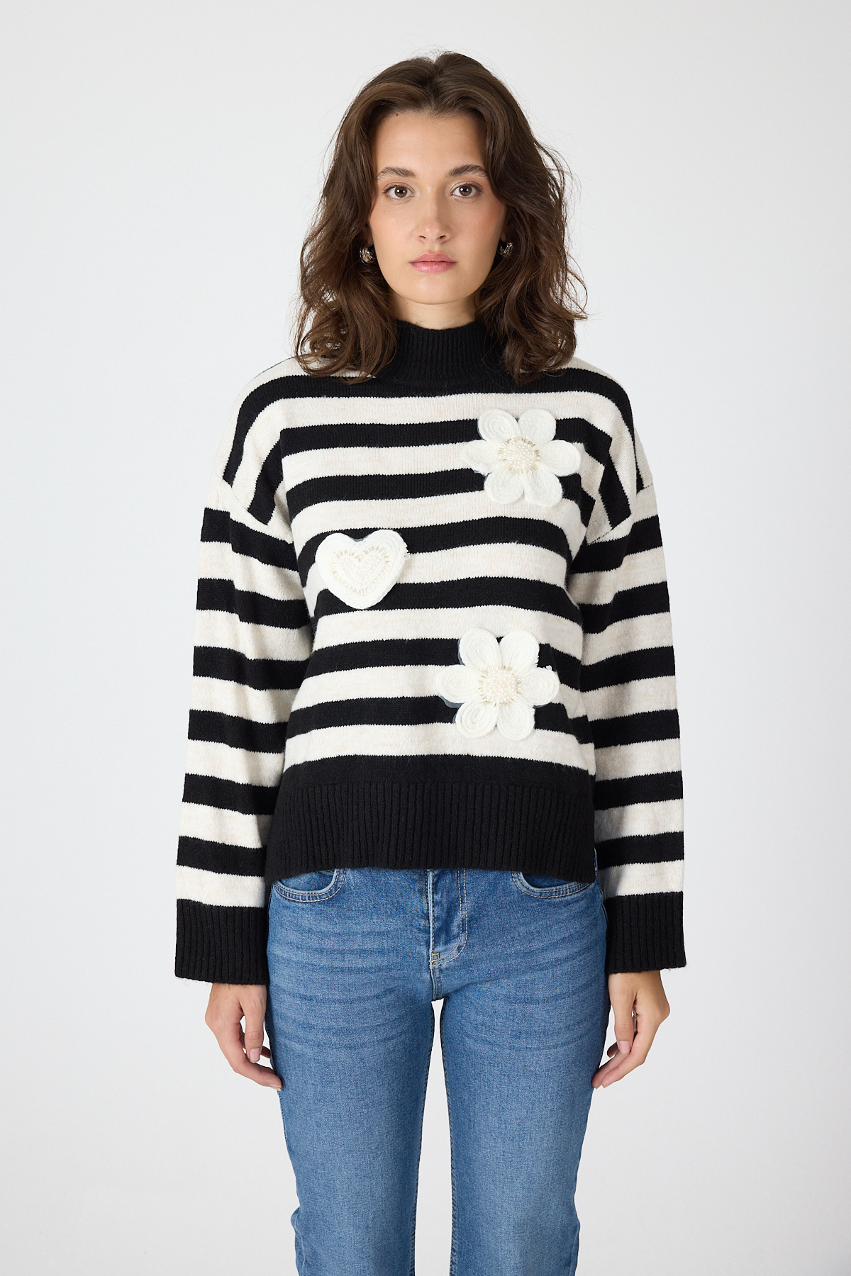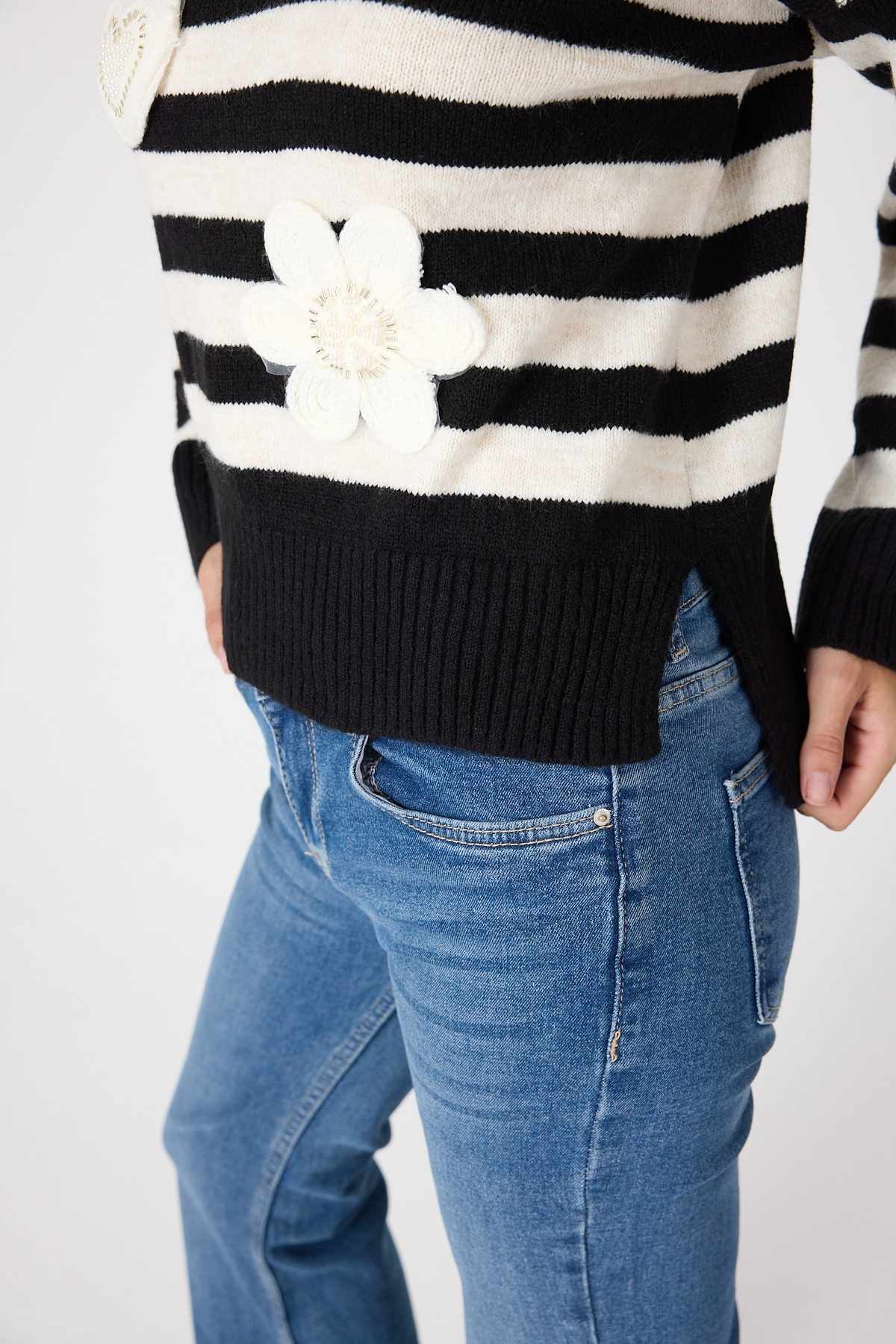Siyah Çizgili İşleme Detaylı Kazak 7090