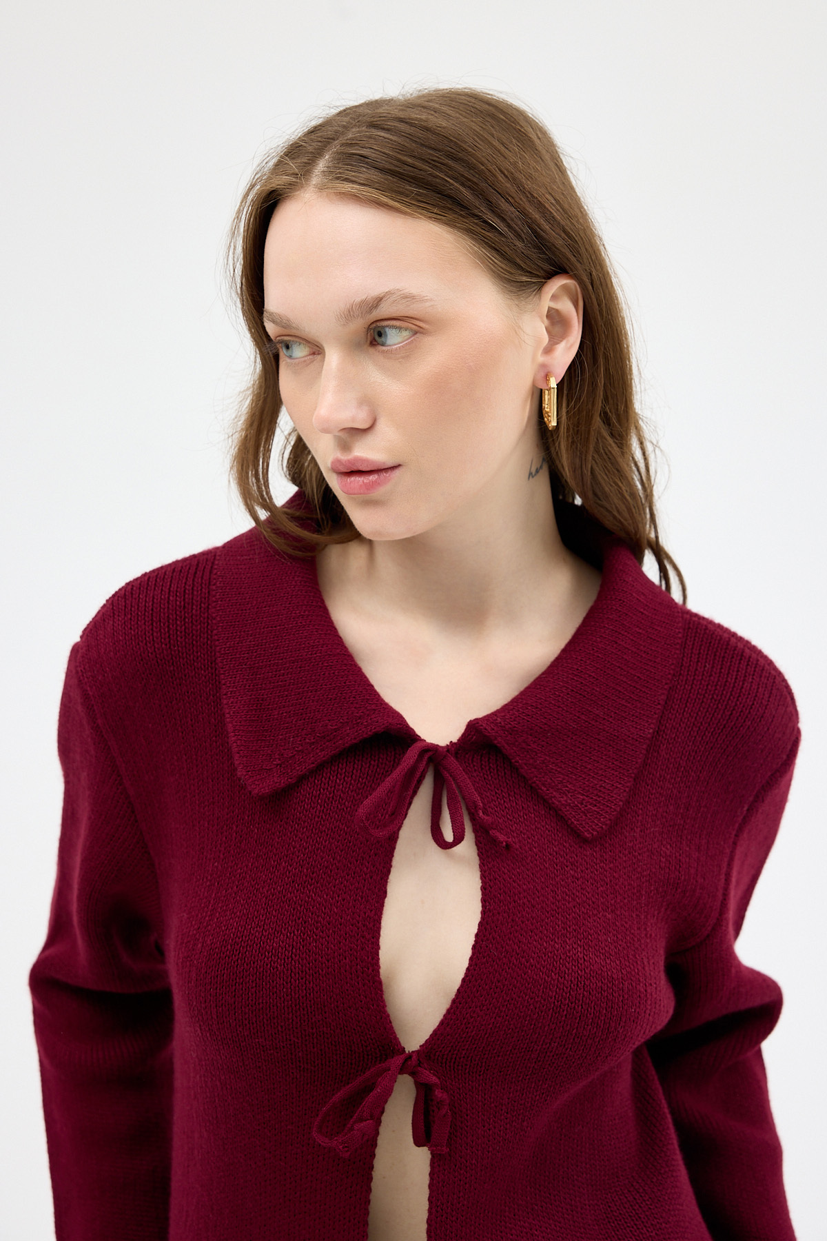 Bordo Kadın Bağlamalı Polo Yaka Triko Hırka 7095