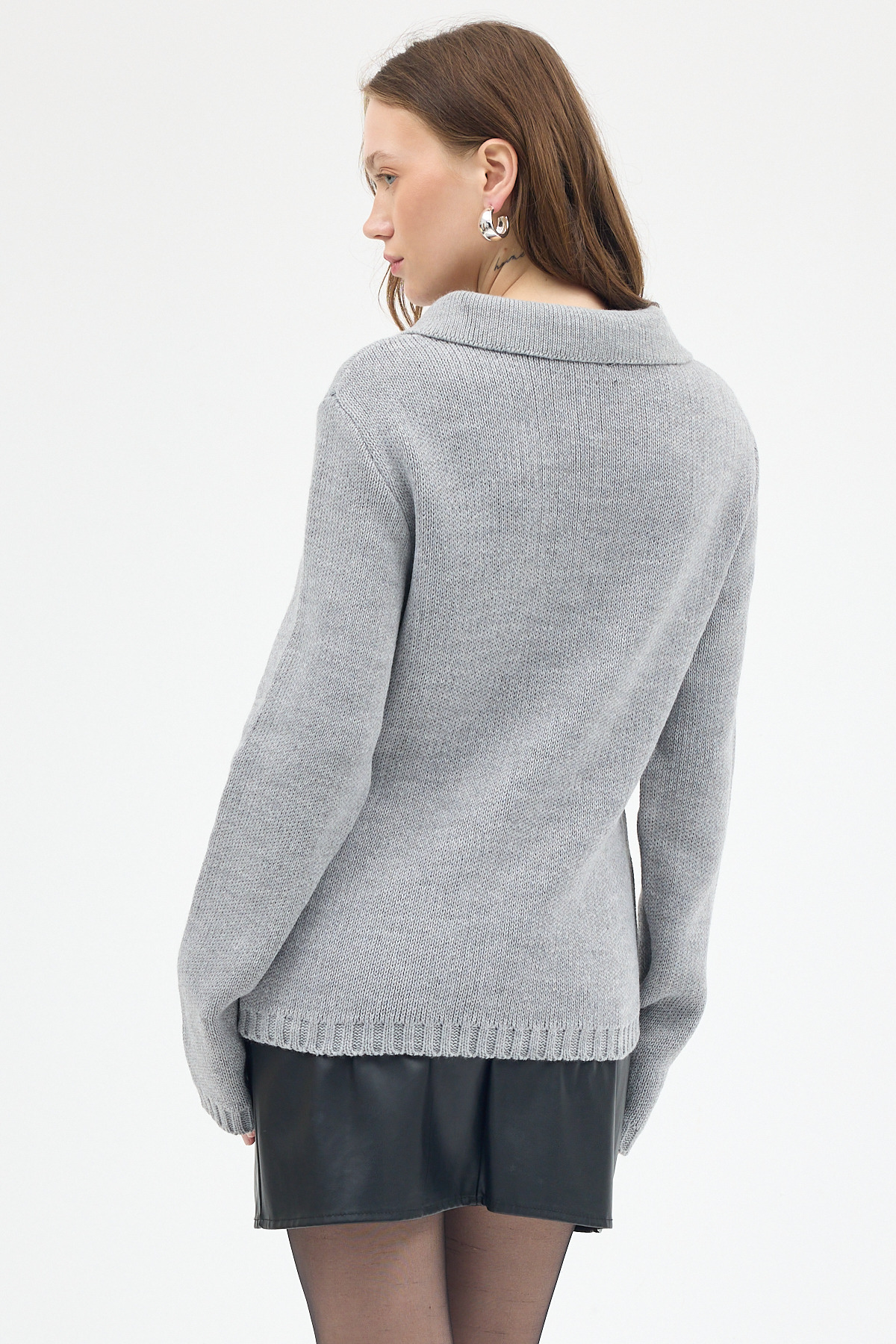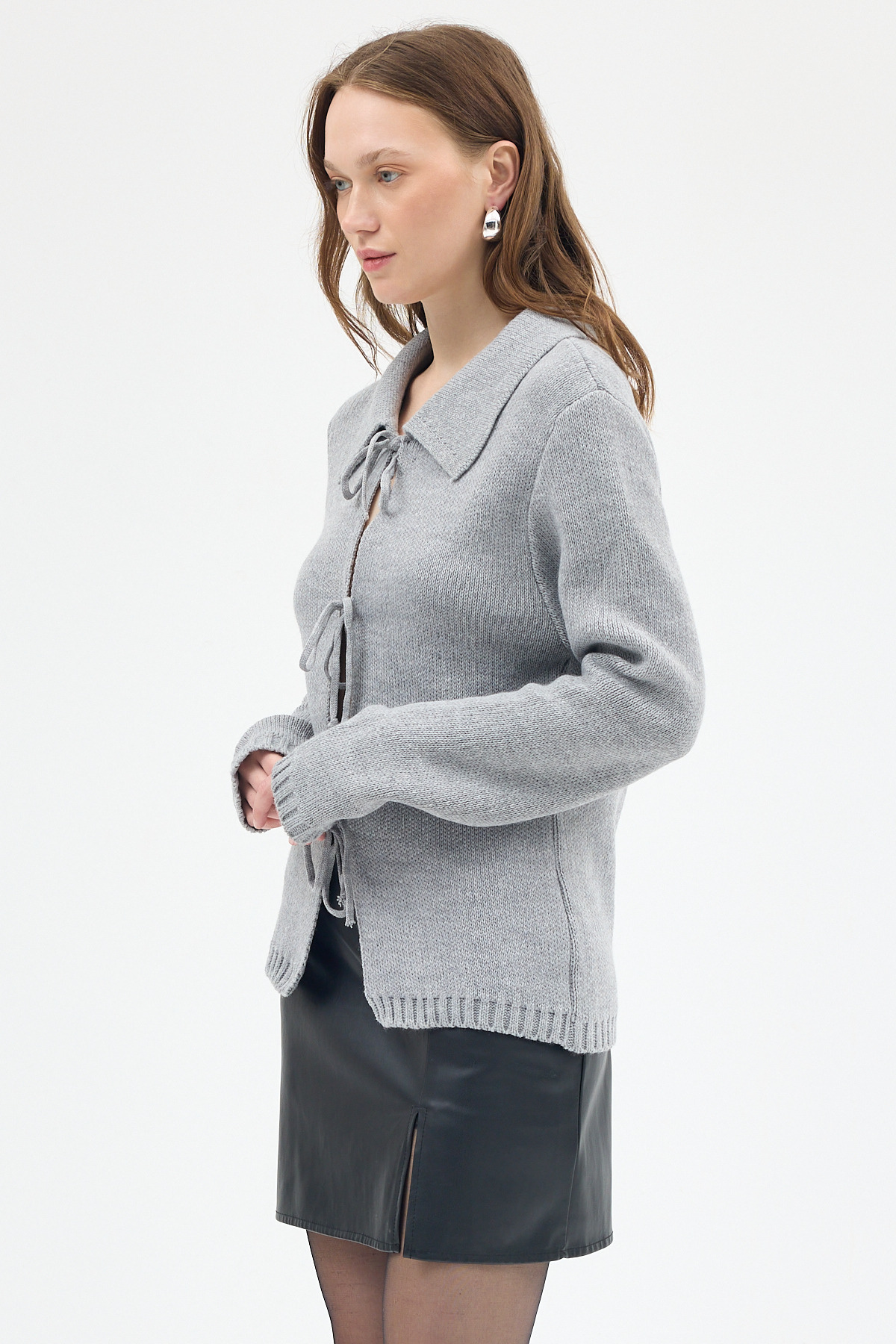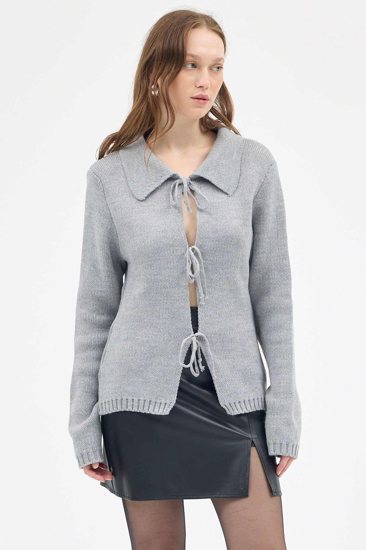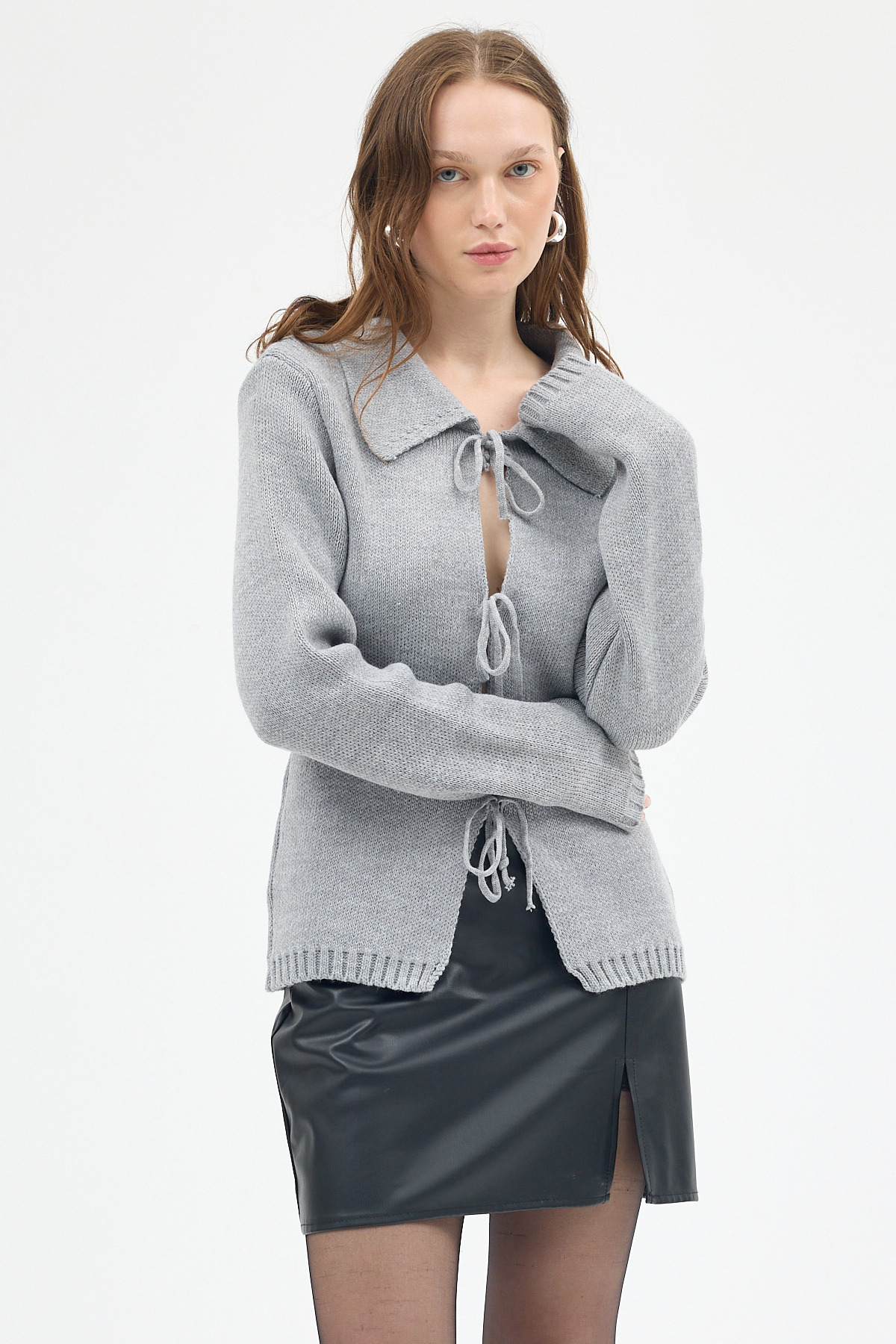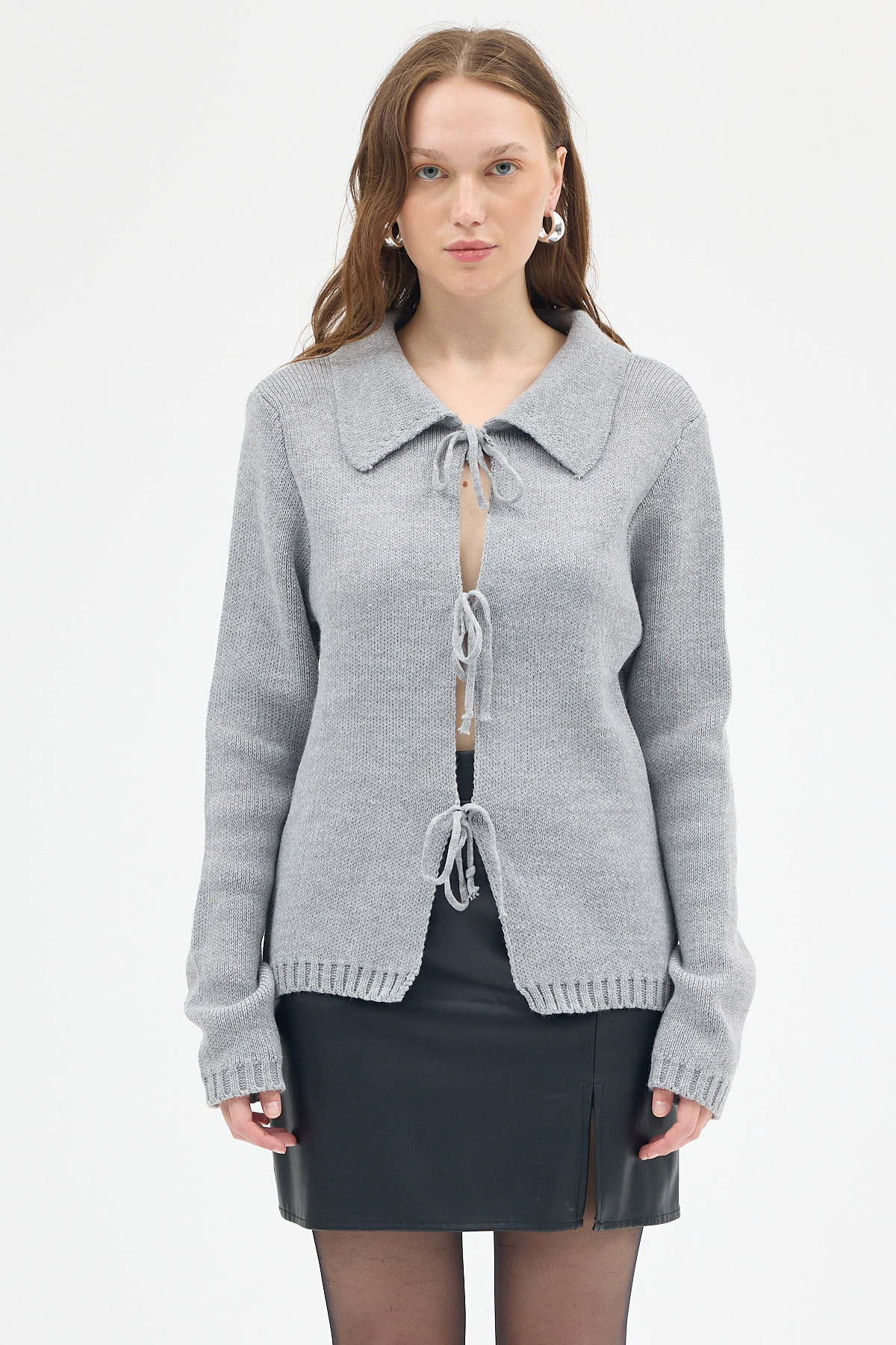 Gri Kadın Bağlamalı Polo Yaka Triko Hırka 7095