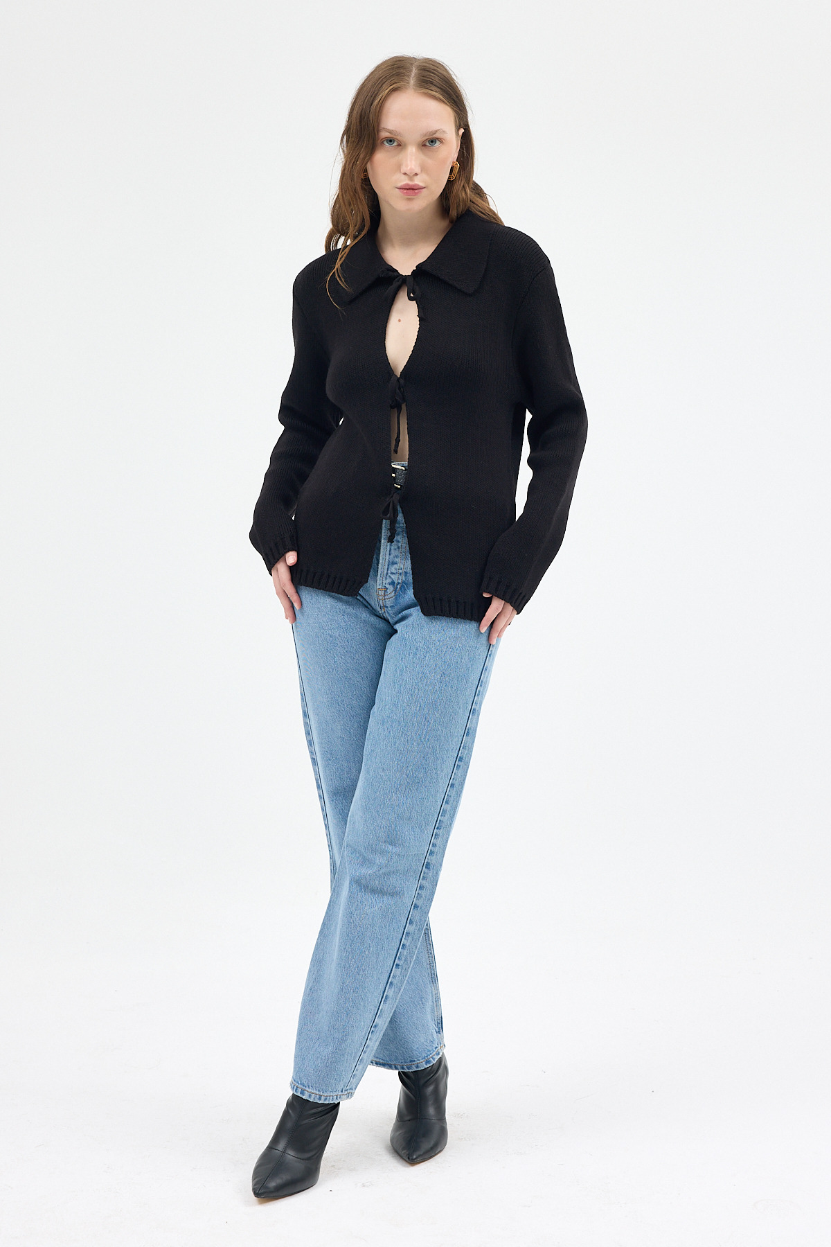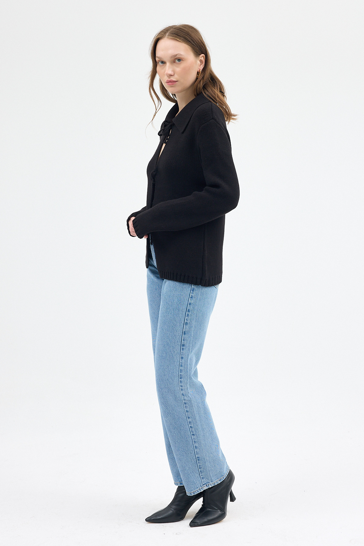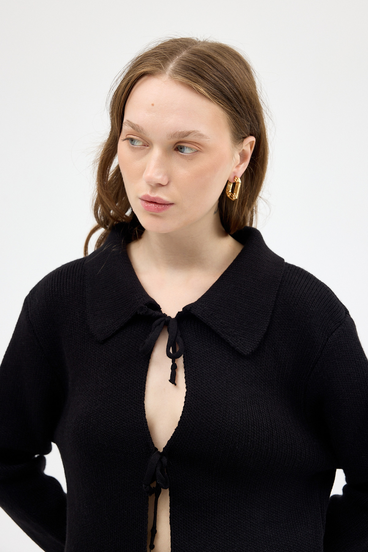 Siyah Kadın Bağlamalı Polo Yaka Triko Hırka 7095