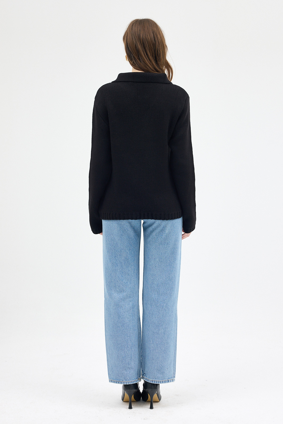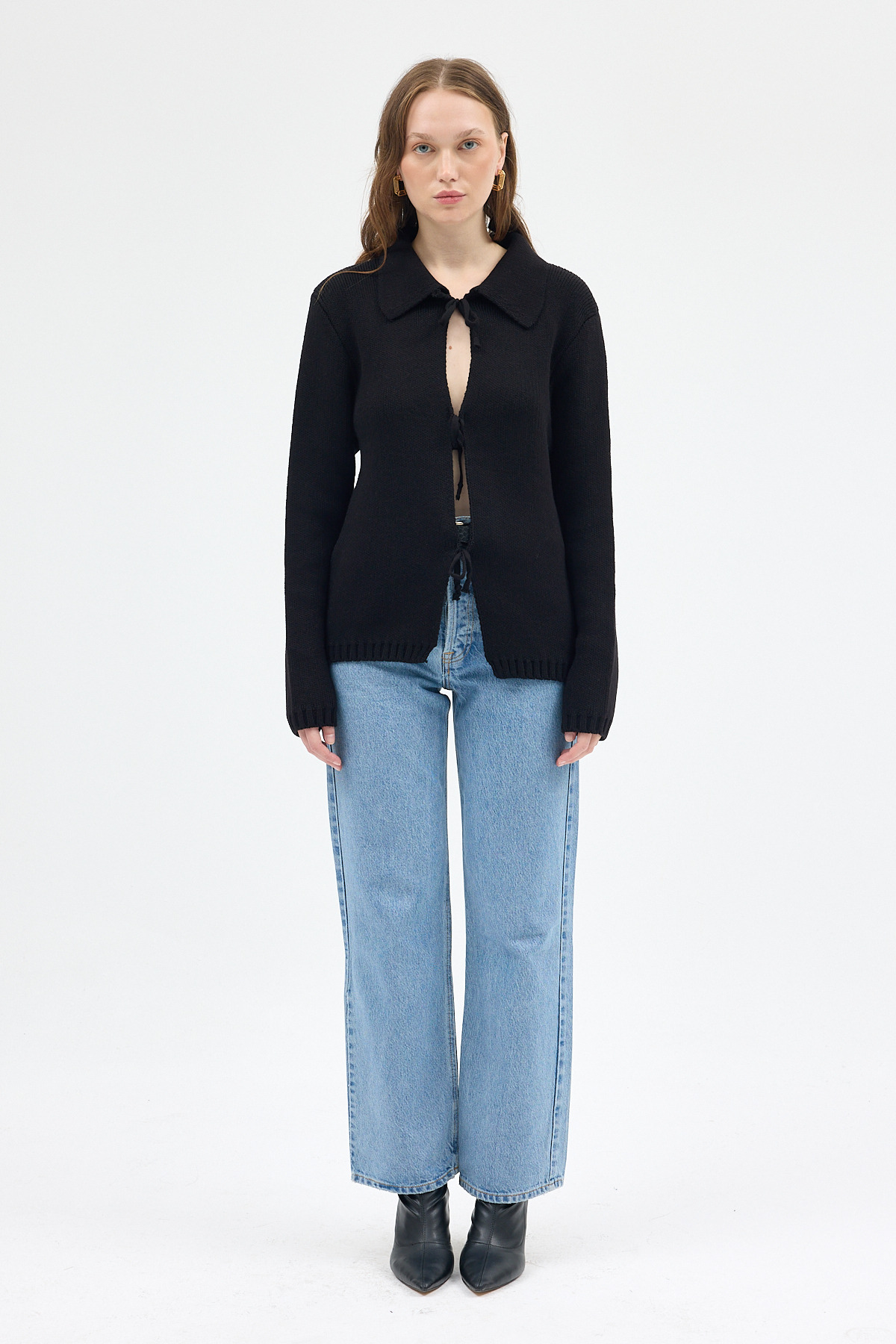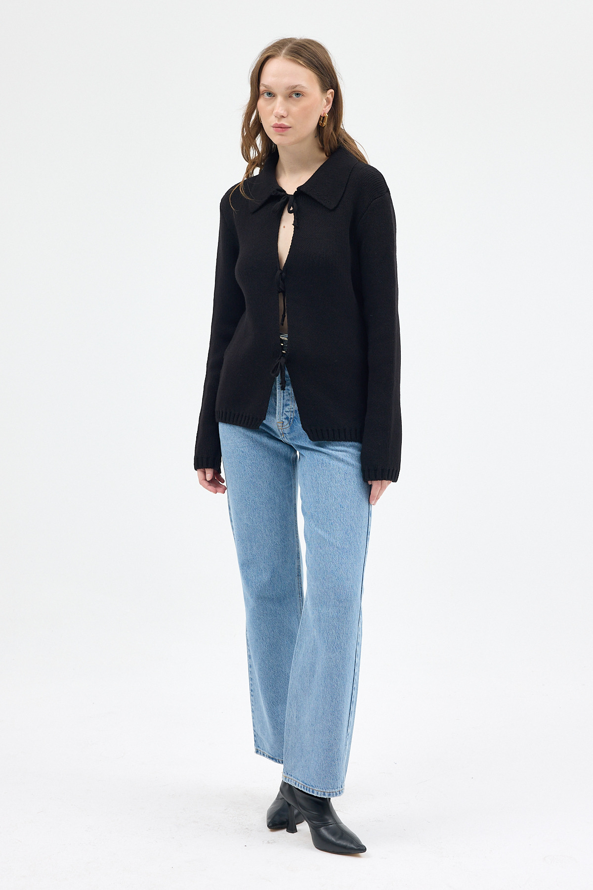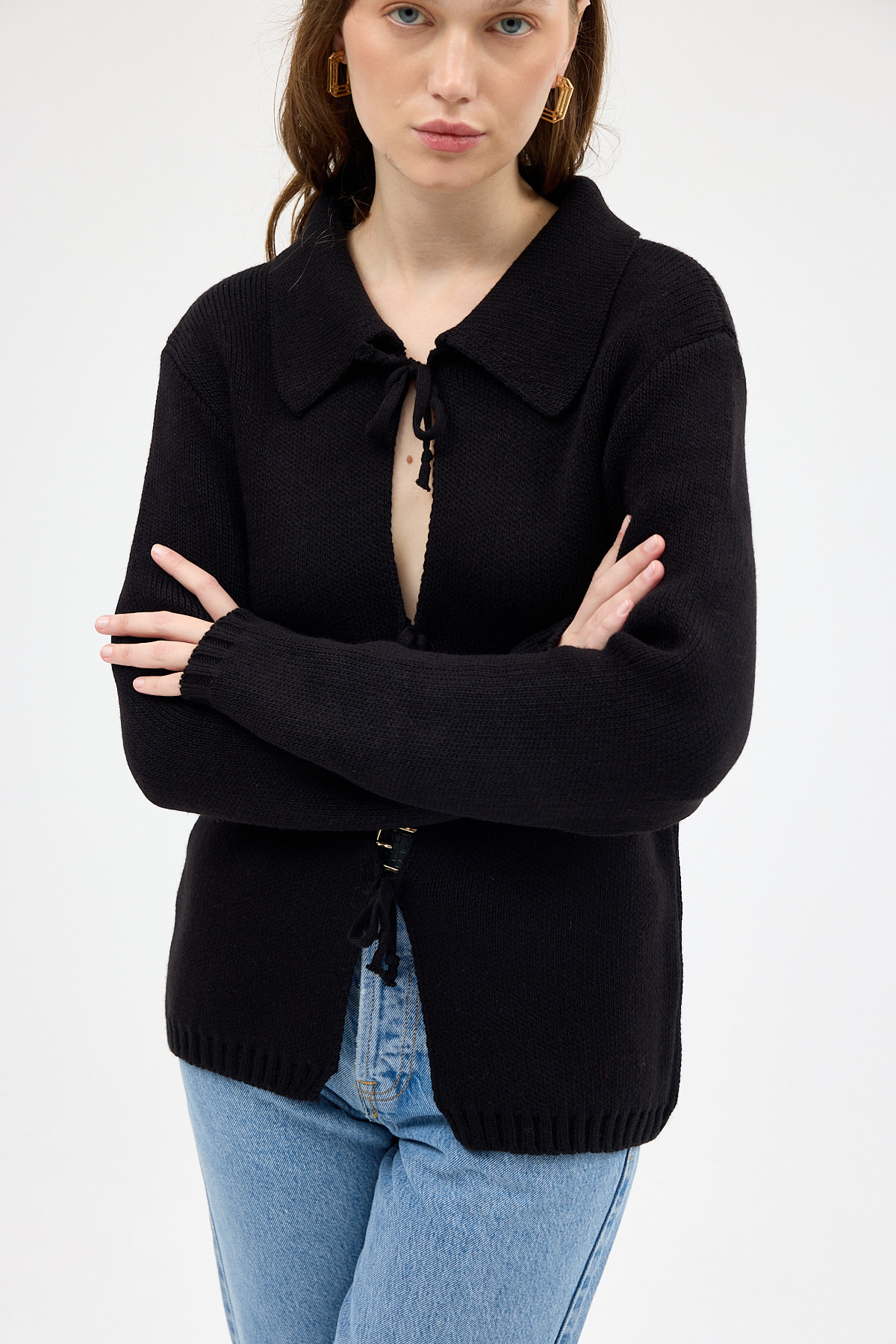 Siyah Kadın Bağlamalı Polo Yaka Triko Hırka 7095