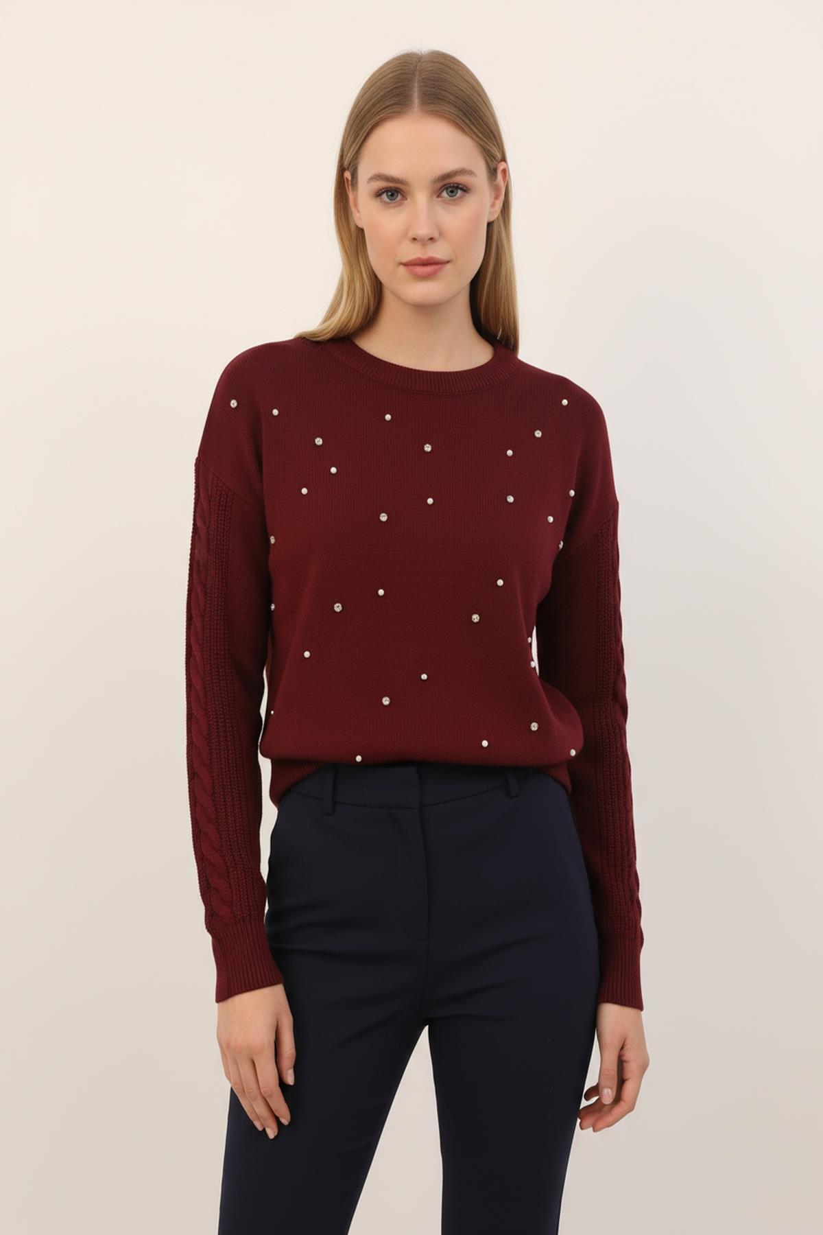 7115 Kol Örgü Detay Taşlı Kazak Bordo