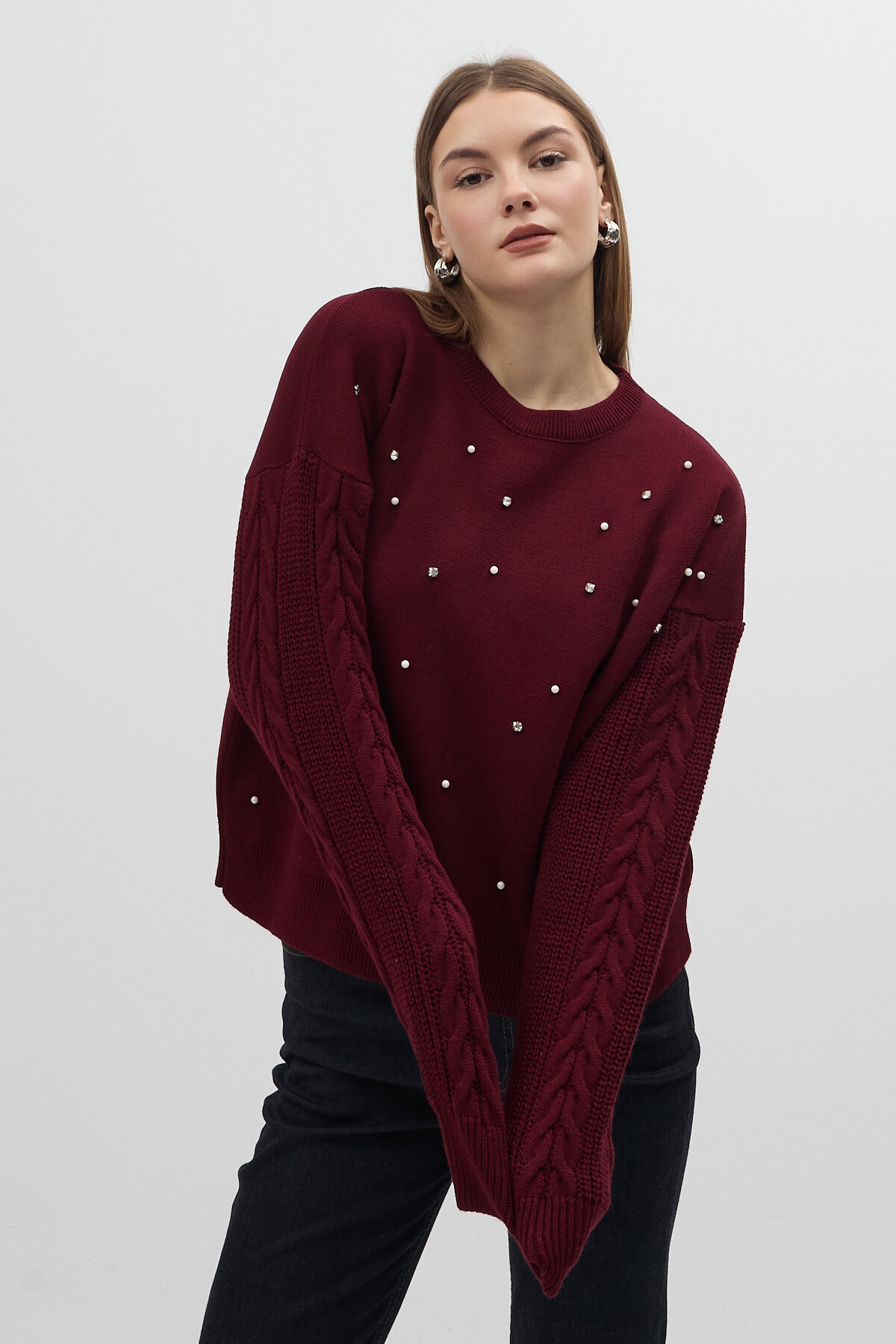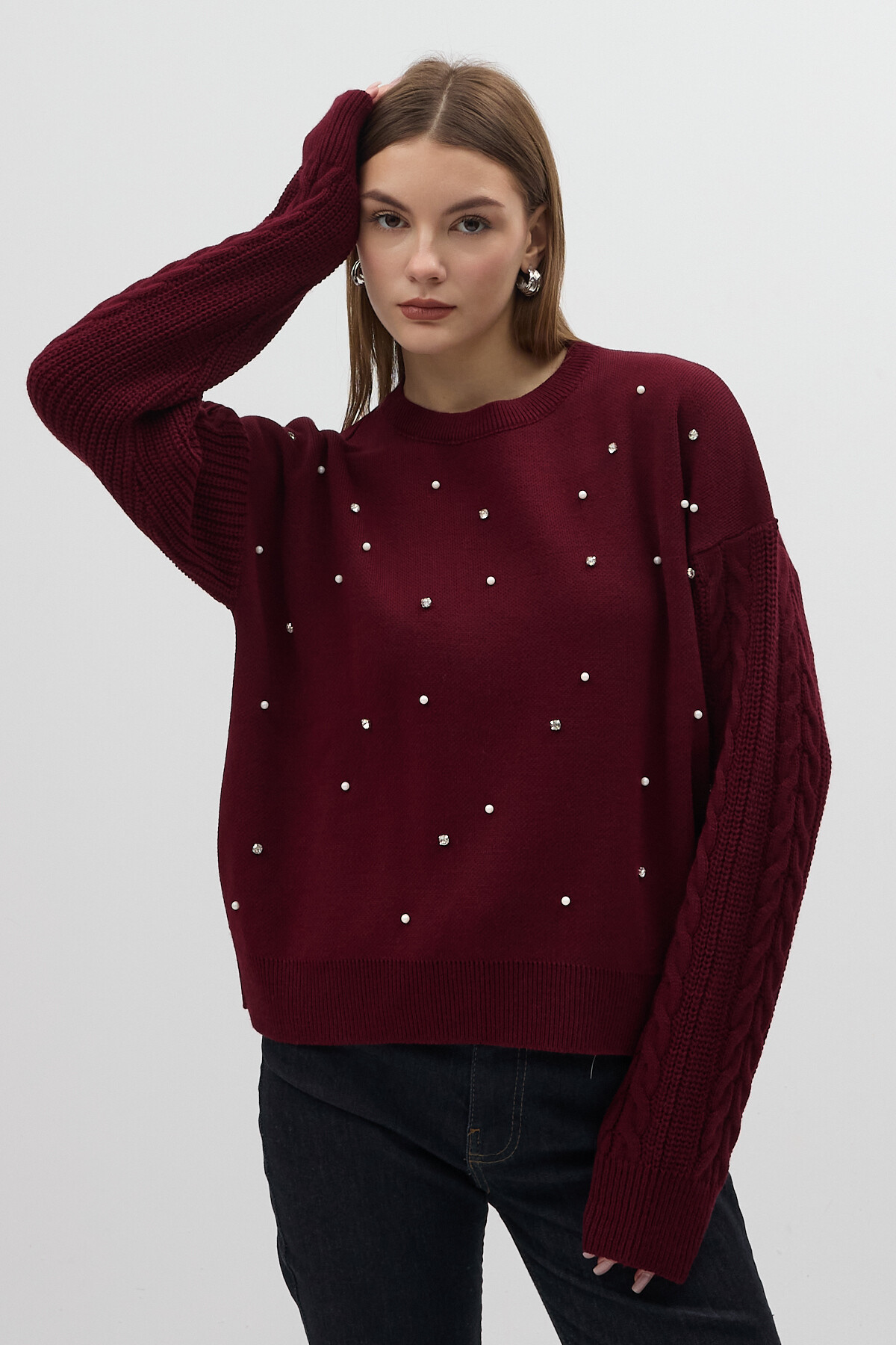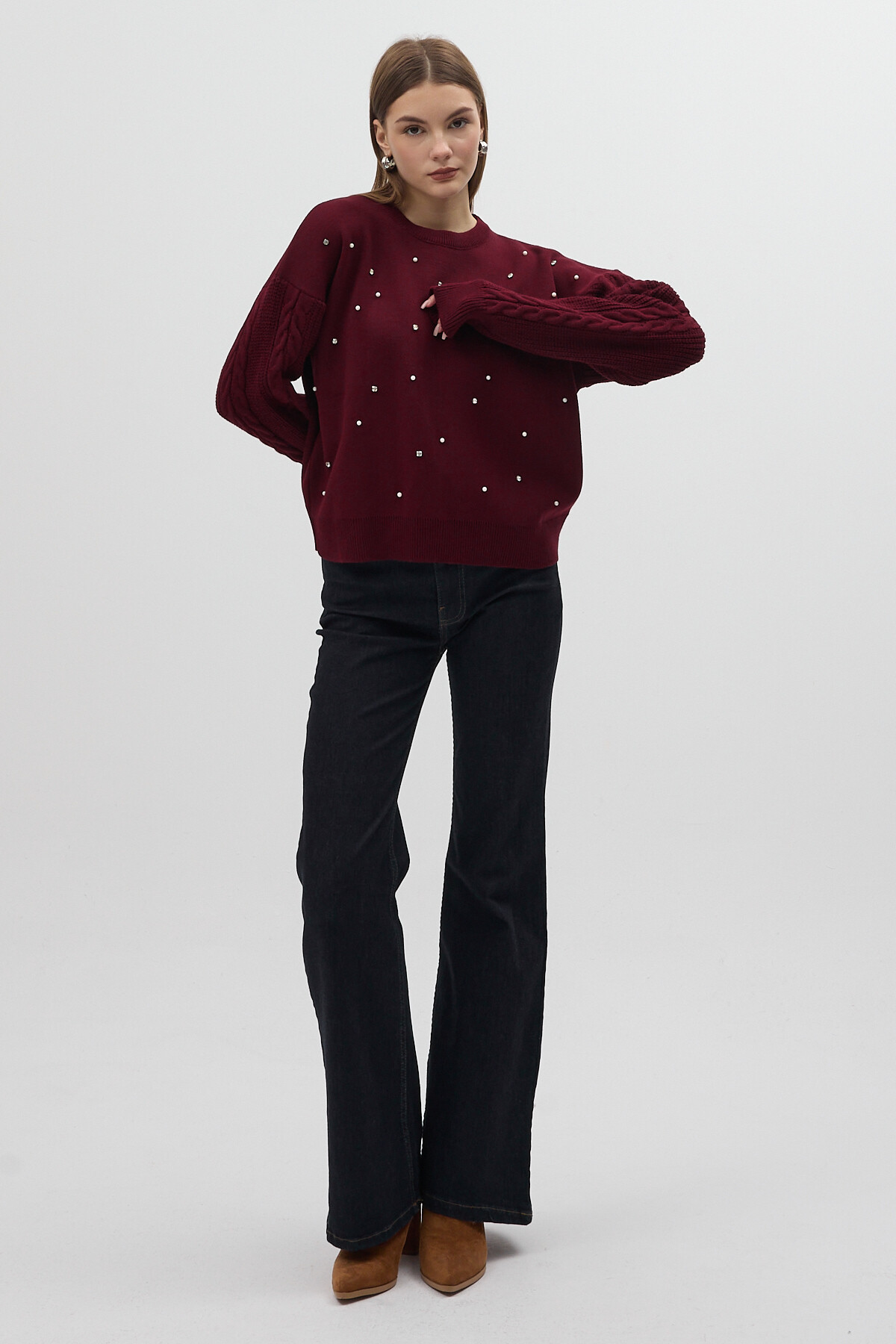 Bordo İnci ve Taş Detaylı Örgü Kollu Bisiklet Yaka Kadın Kazak 7115