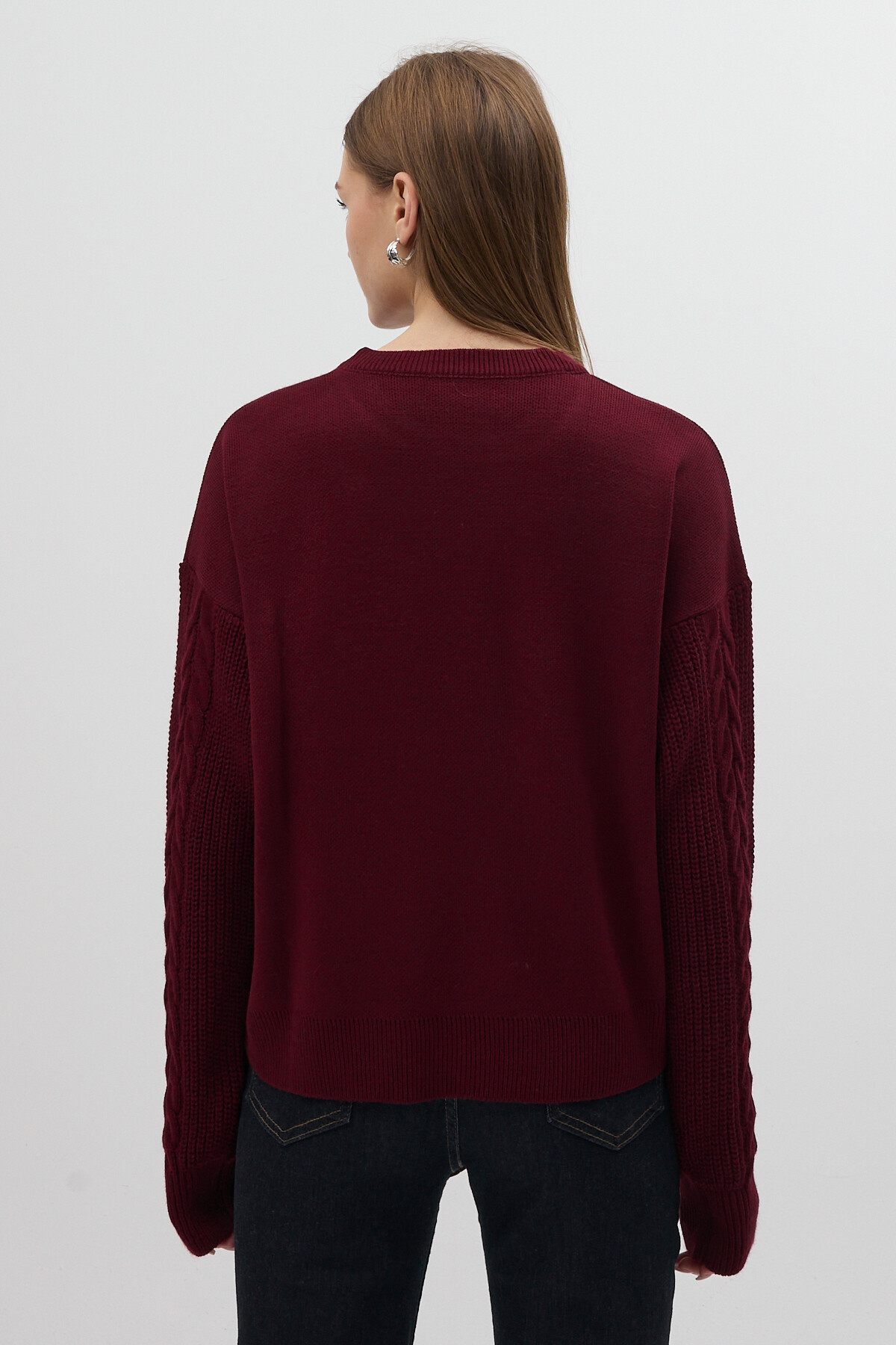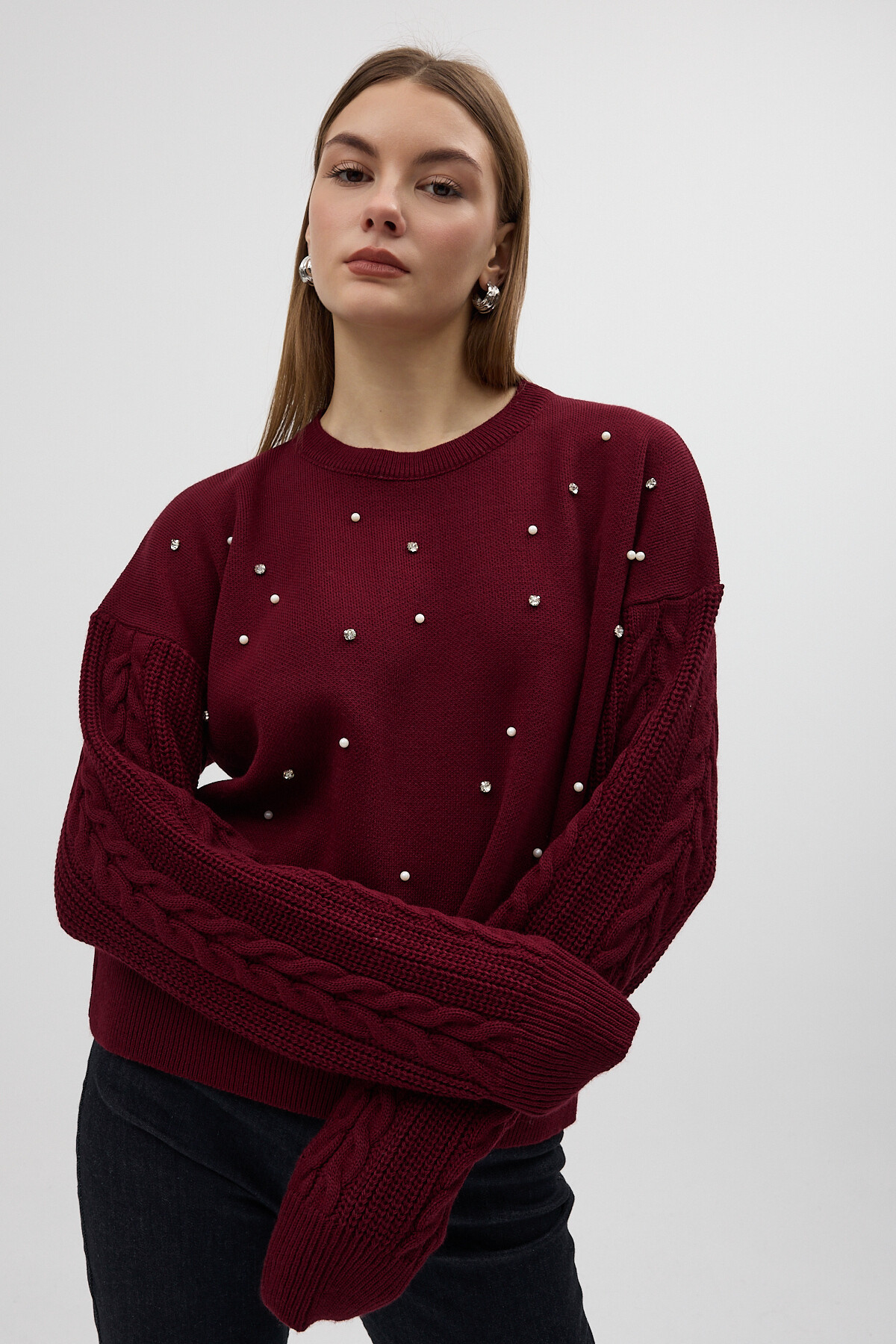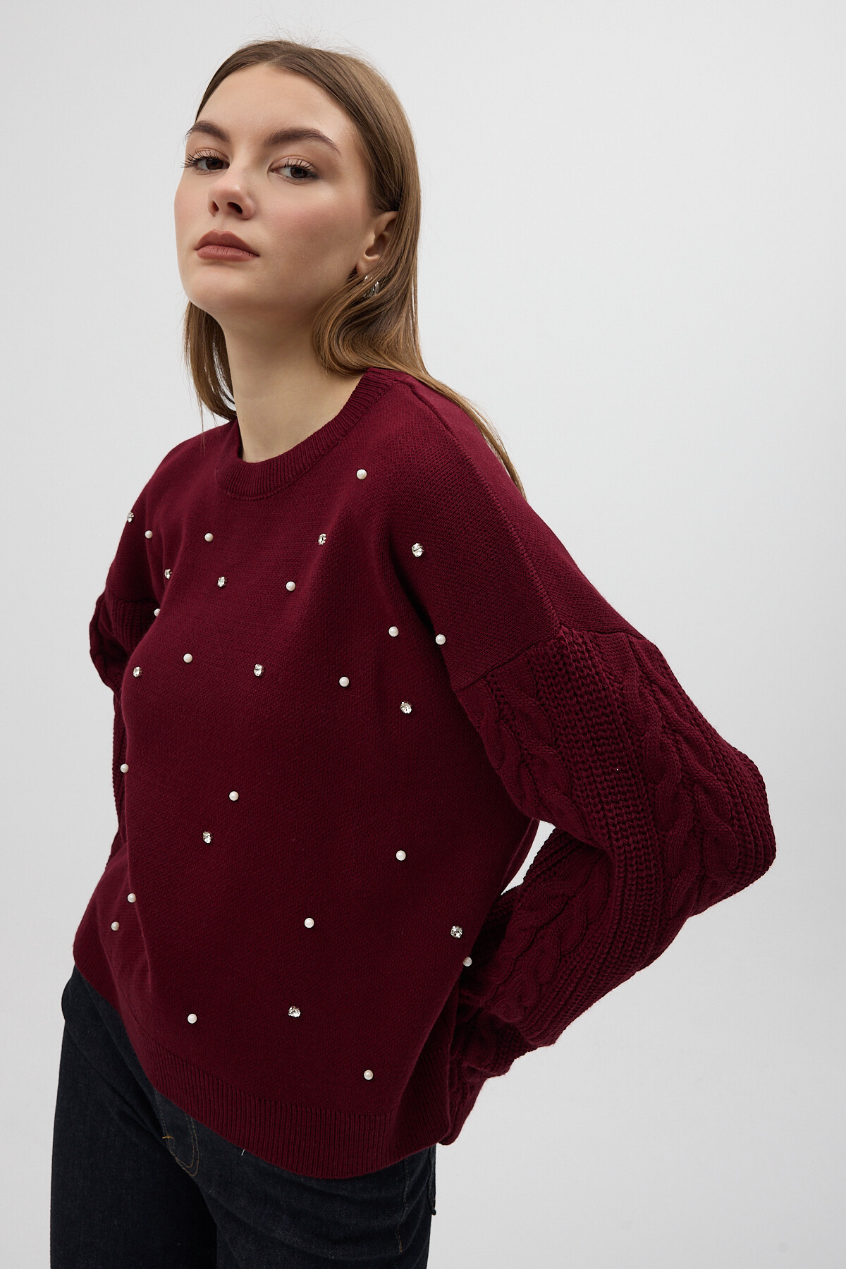 Bordo İnci ve Taş Detaylı Örgü Kollu Bisiklet Yaka Kadın Kazak 7115