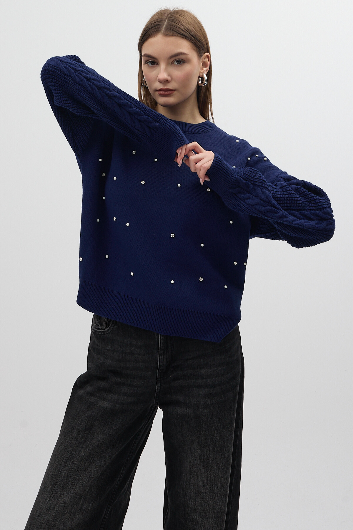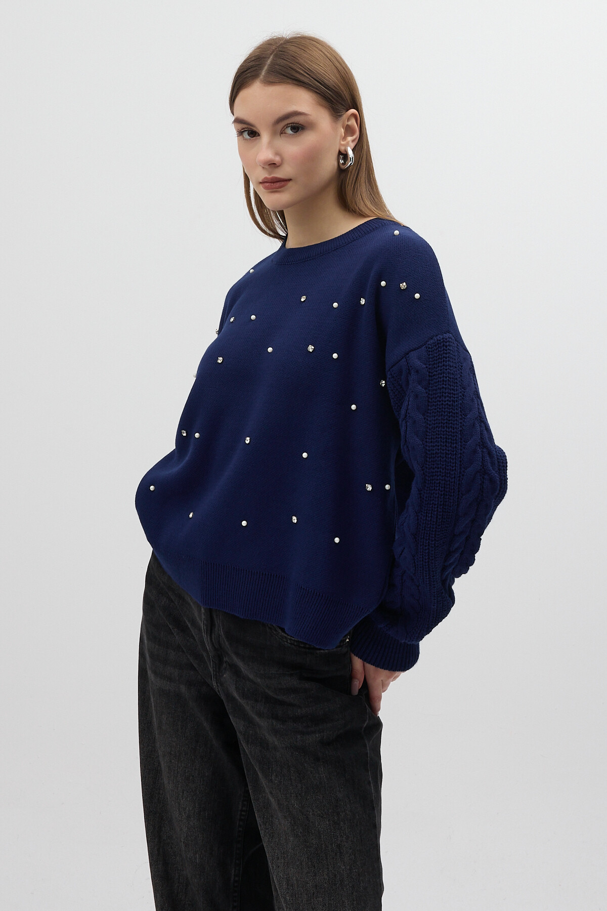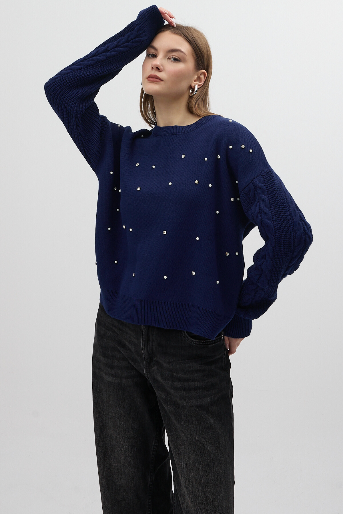 Lacivert İnci ve Taş Detaylı Örgü Kollu Bisiklet Yaka Kadın Kazak 7115