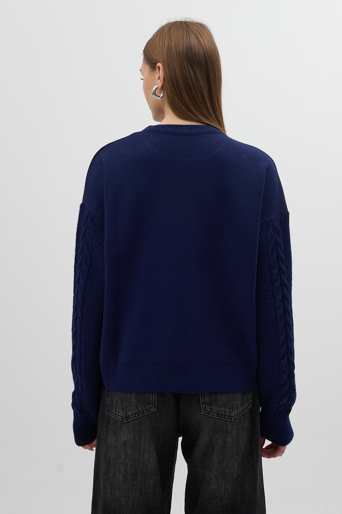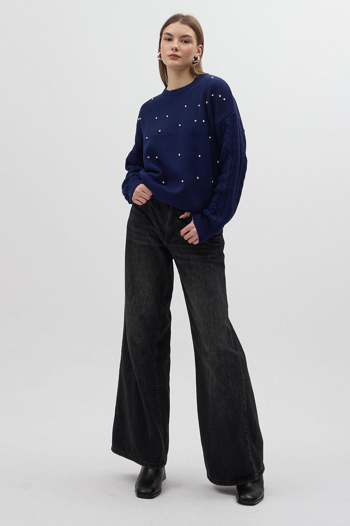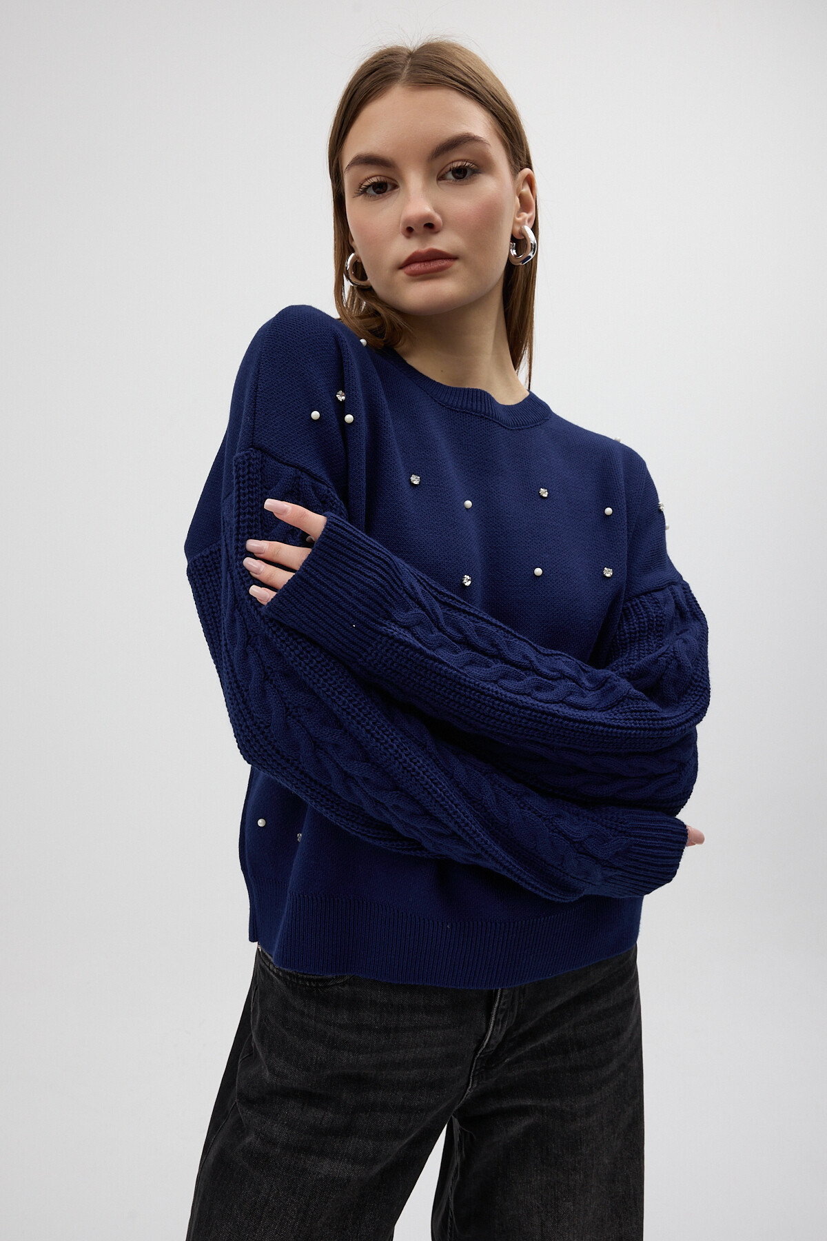 Lacivert İnci ve Taş Detaylı Örgü Kollu Bisiklet Yaka Kadın Kazak 7115