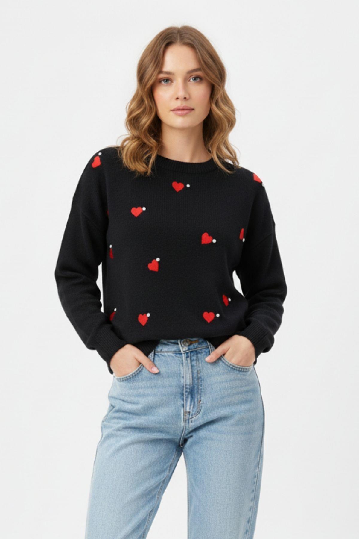 7120 Kalp Nakış Taş Detay Kazak Siyah