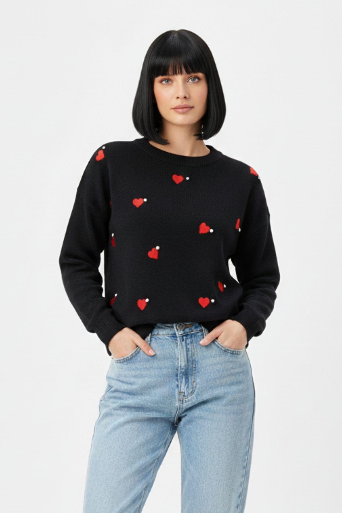 7120 Kalp Nakış Taş Detay Kazak Siyah