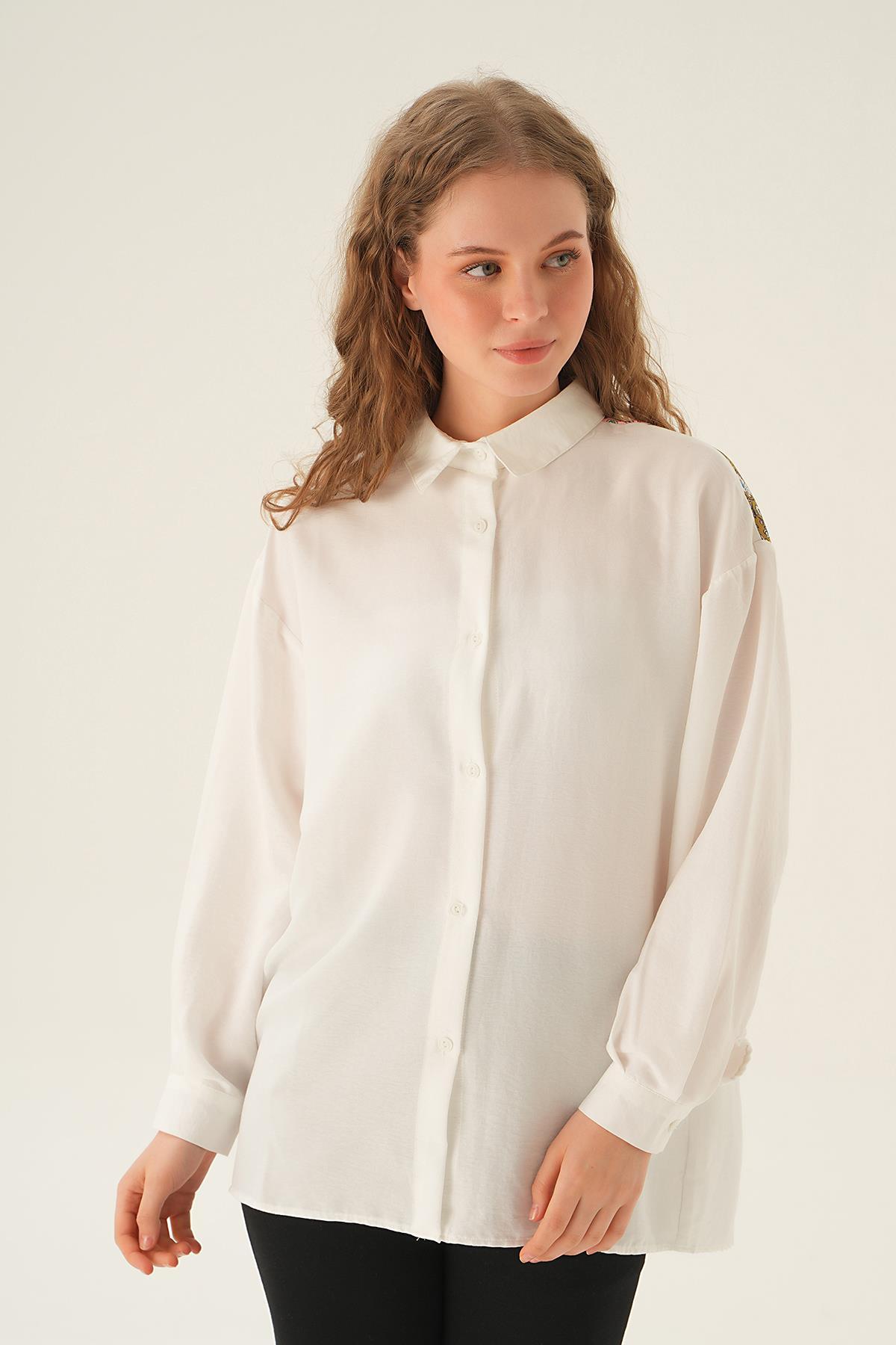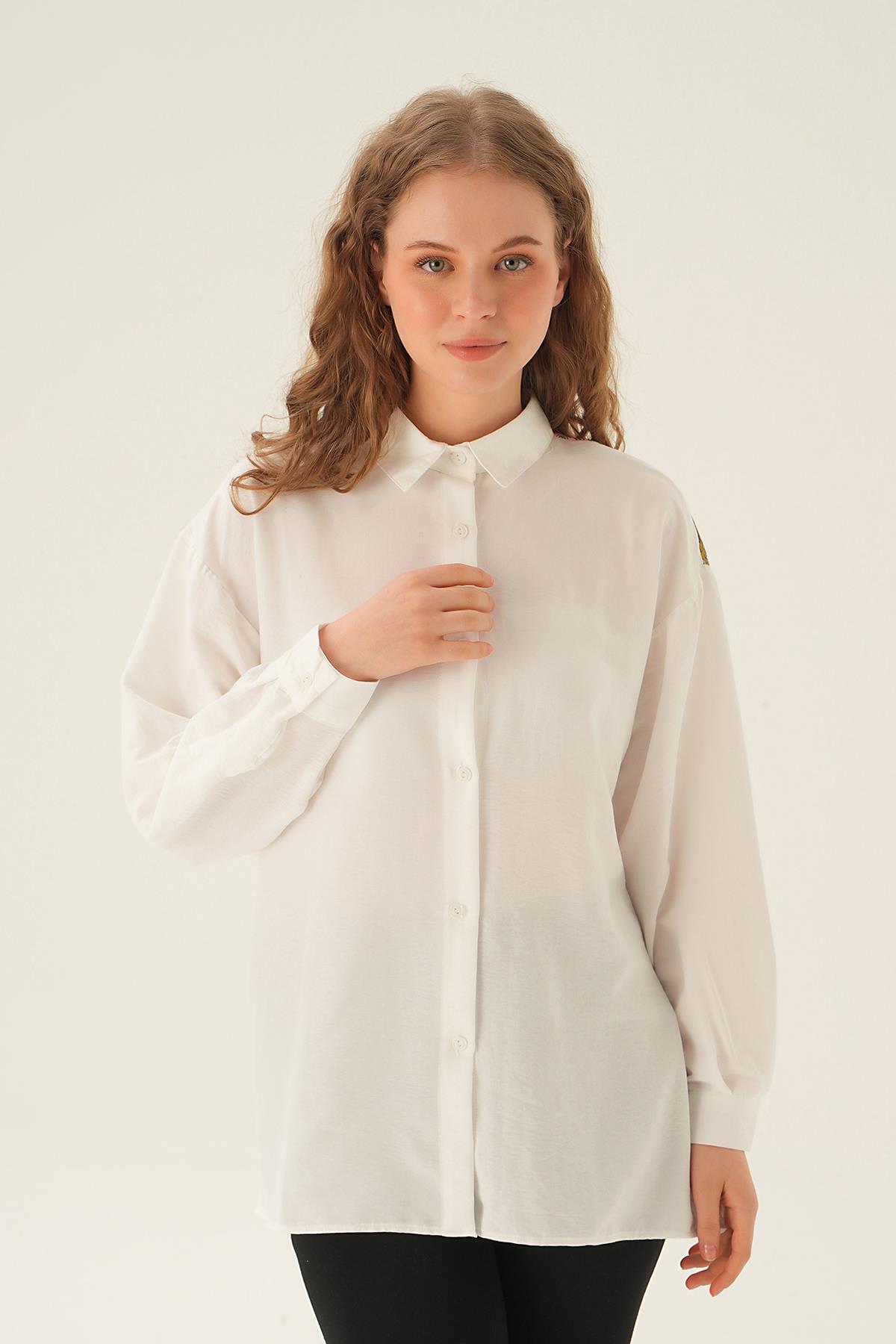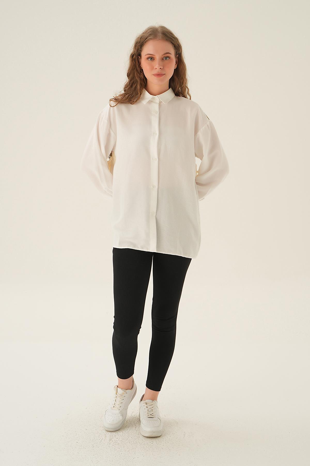 Bej Üçgen Fularlı Oversize Ekose Gömlek 5484