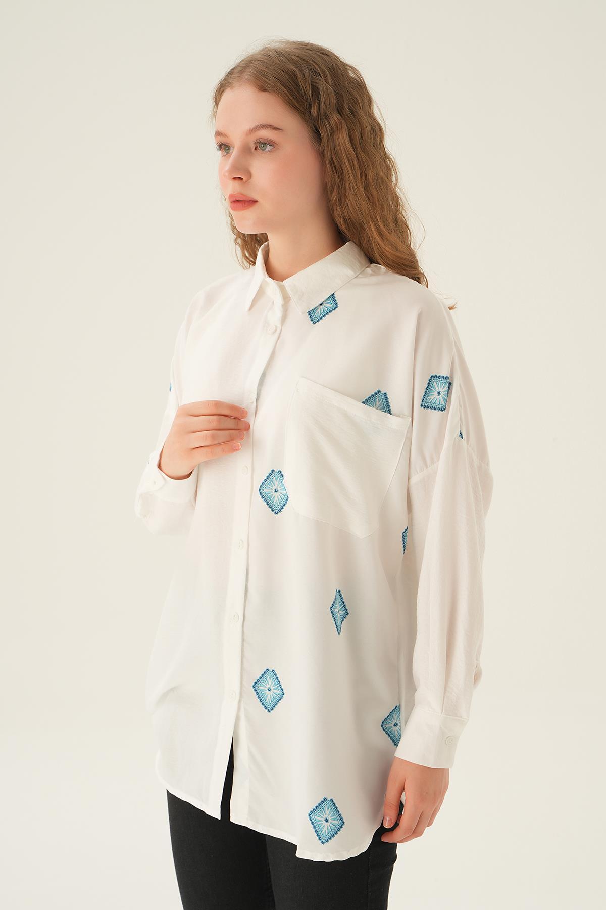 Beyaz Cepli Oversize Nakış Detay Gömlek 71481