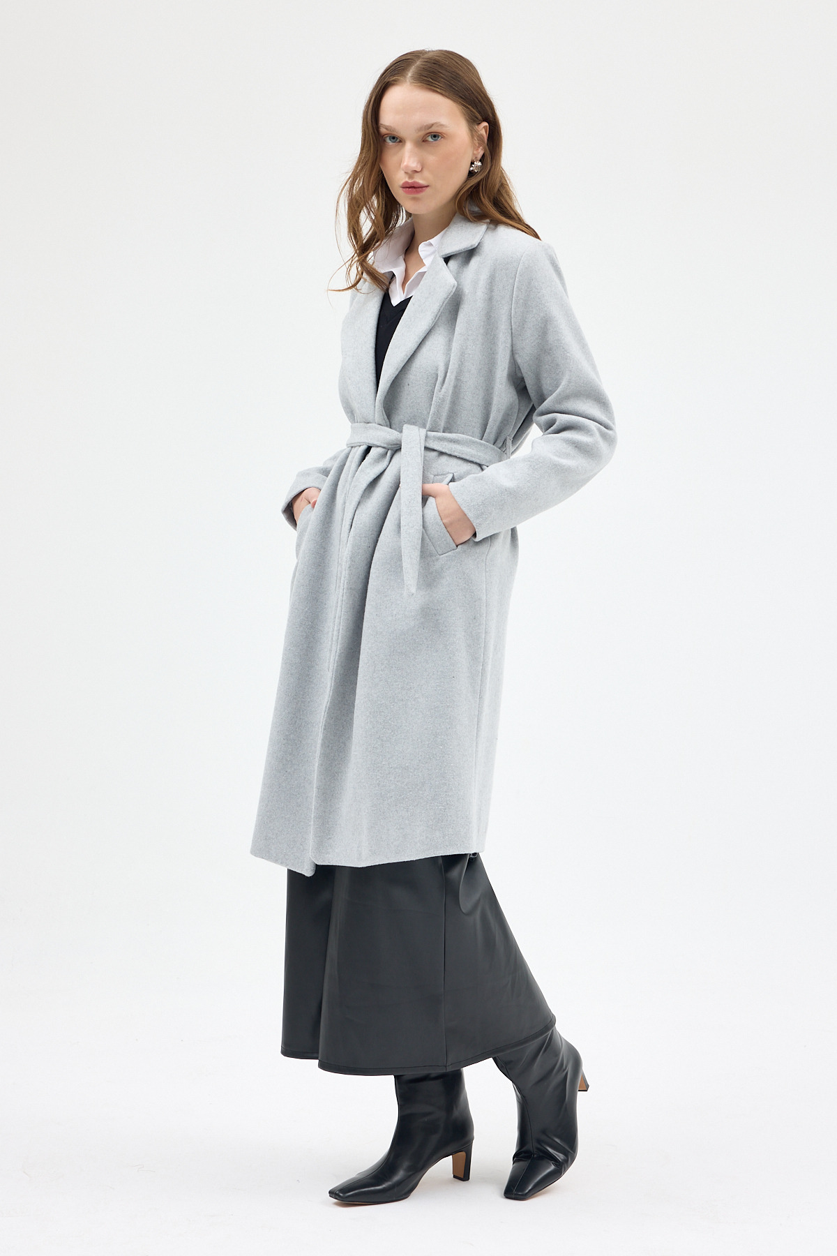 Gri Kemerli İçi Astarlı Uzun Kaşe Kaban 7149A