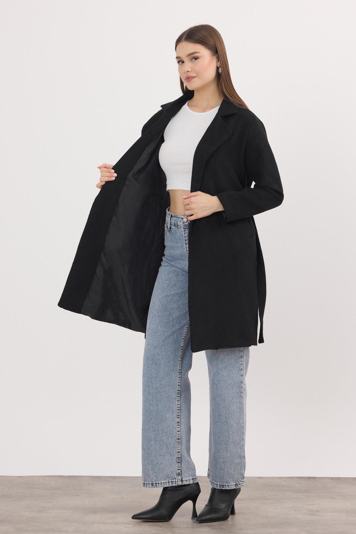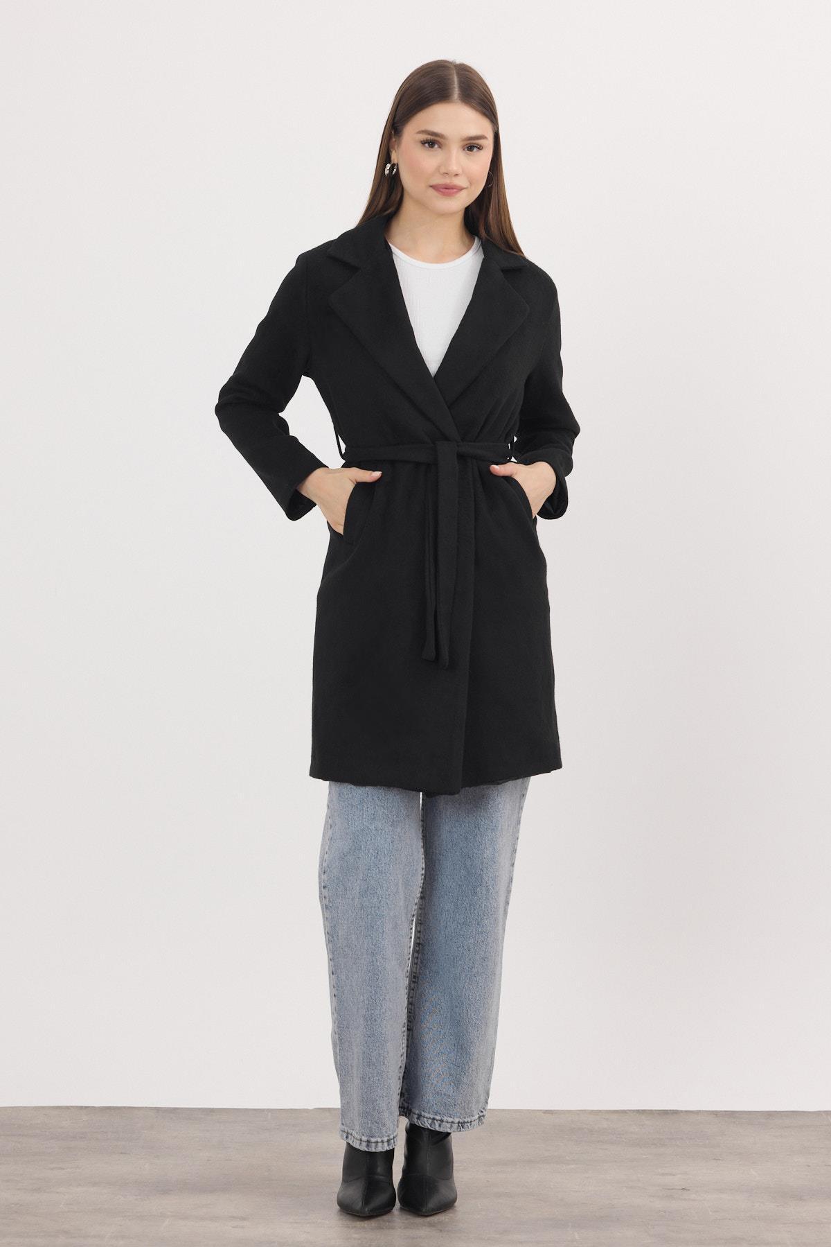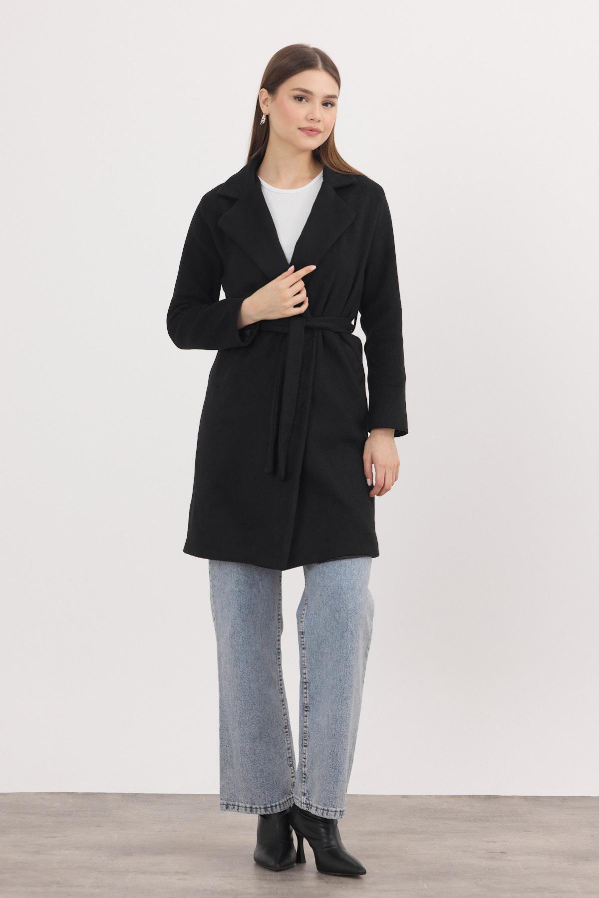 Siyah Kemerli İçi Astarlı Uzun Kaşe Kaban 7149A