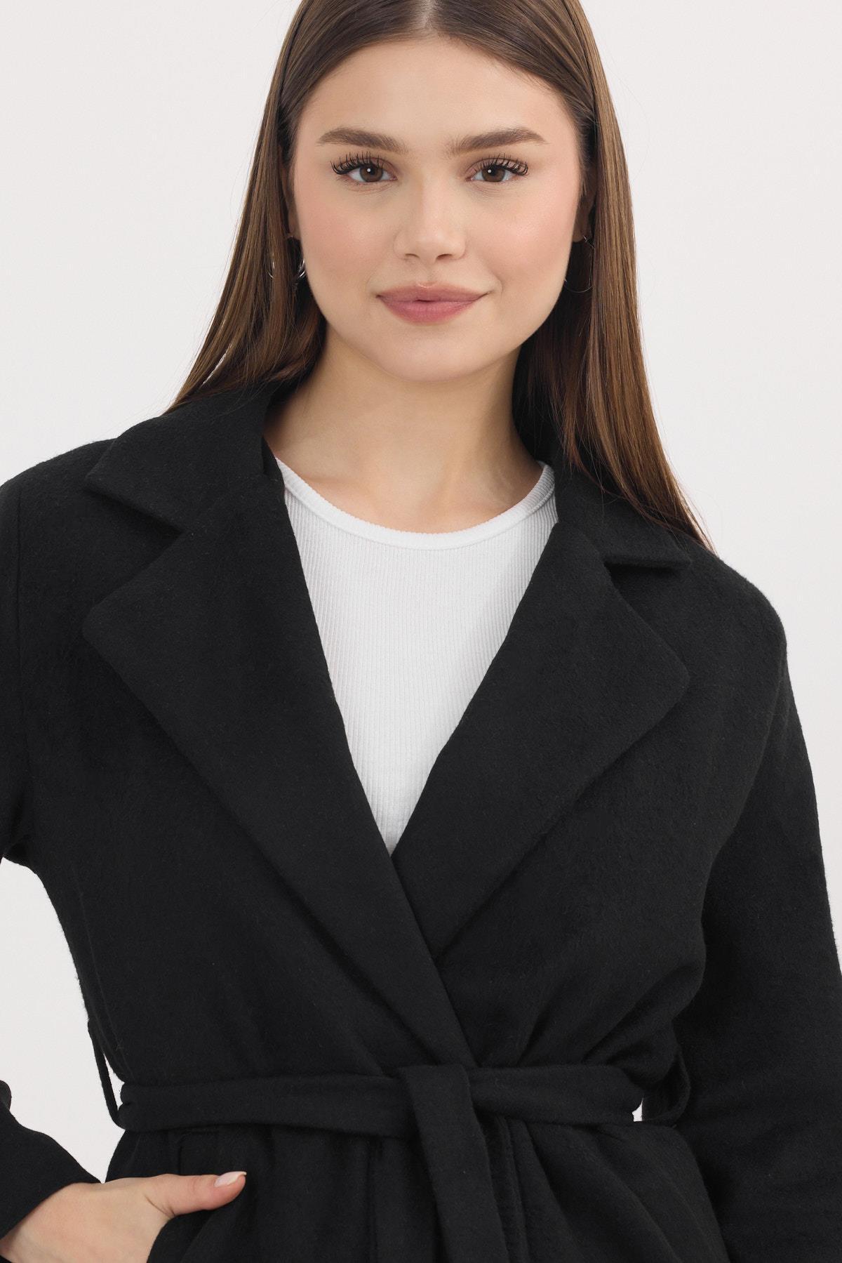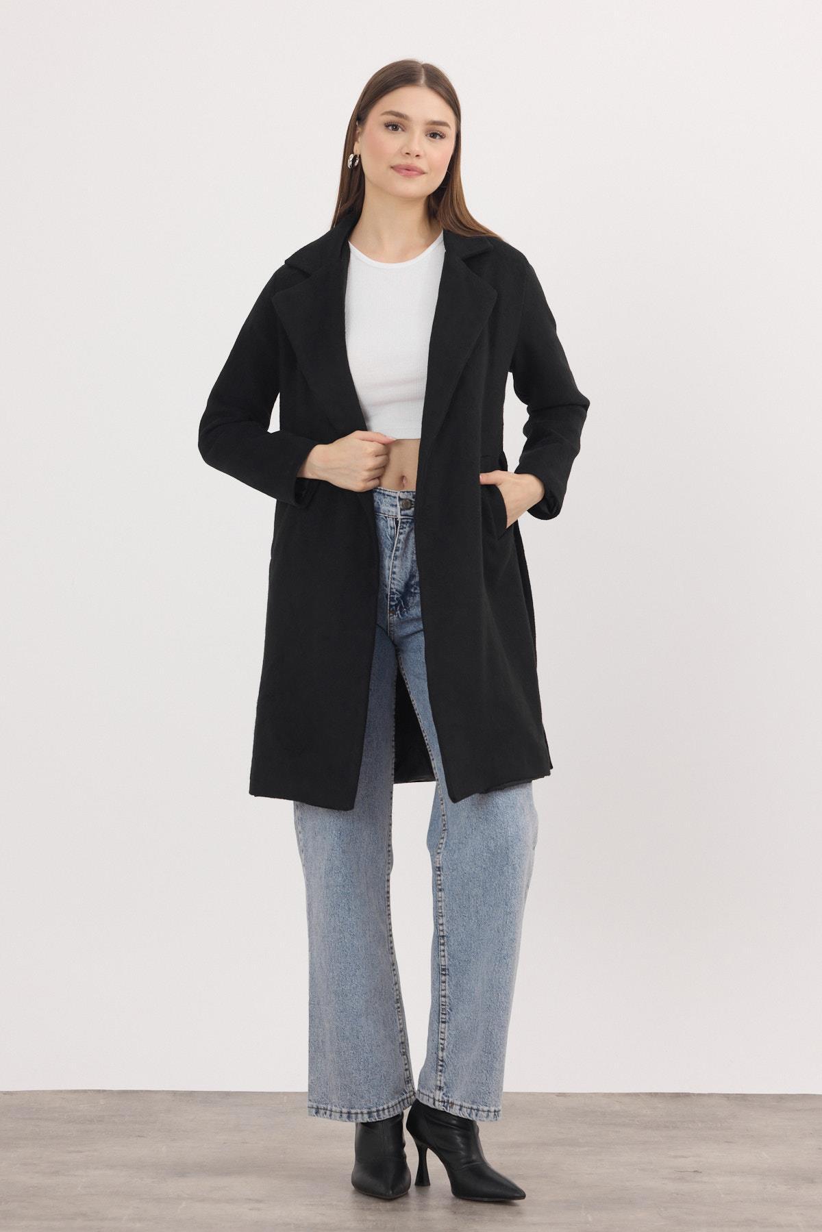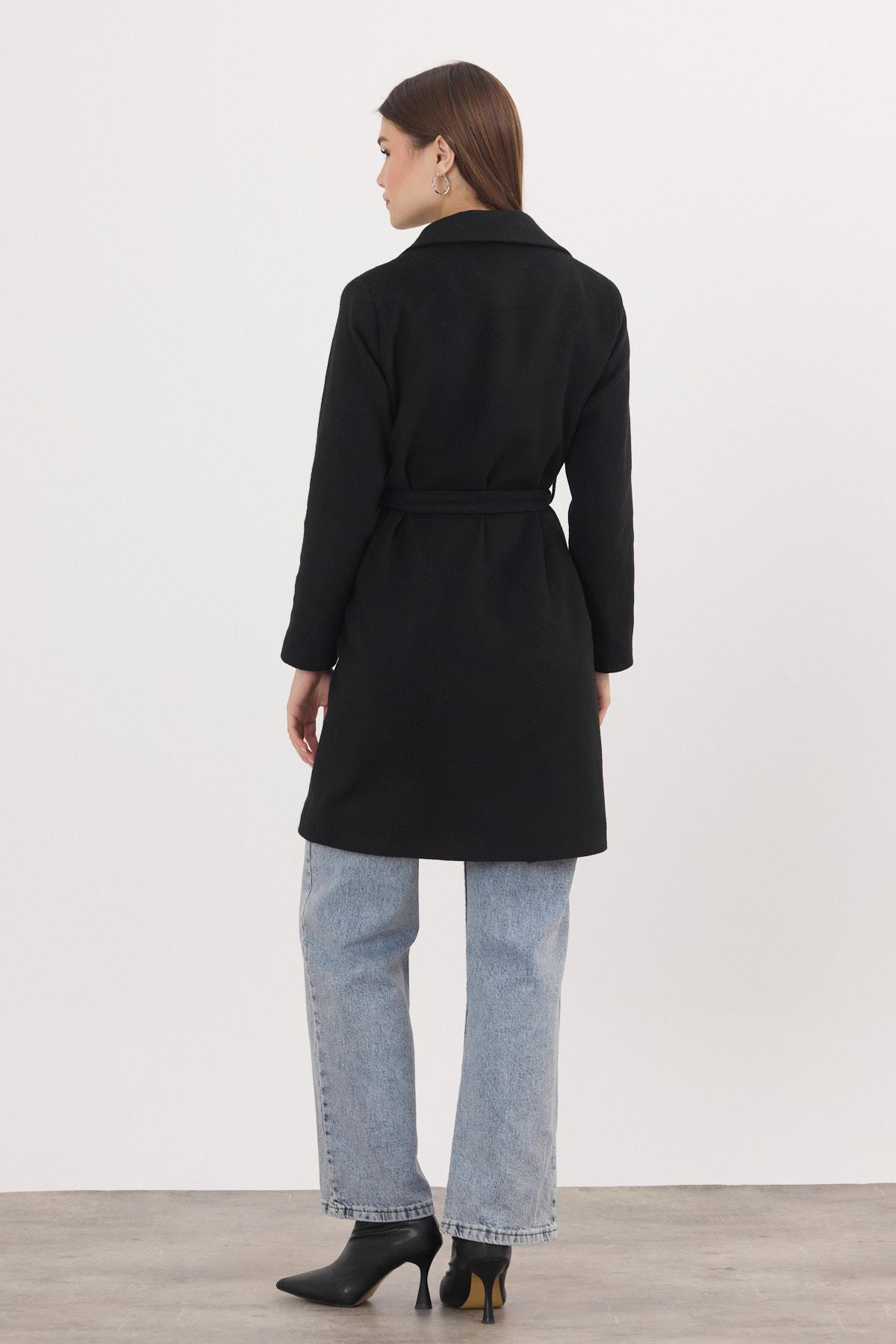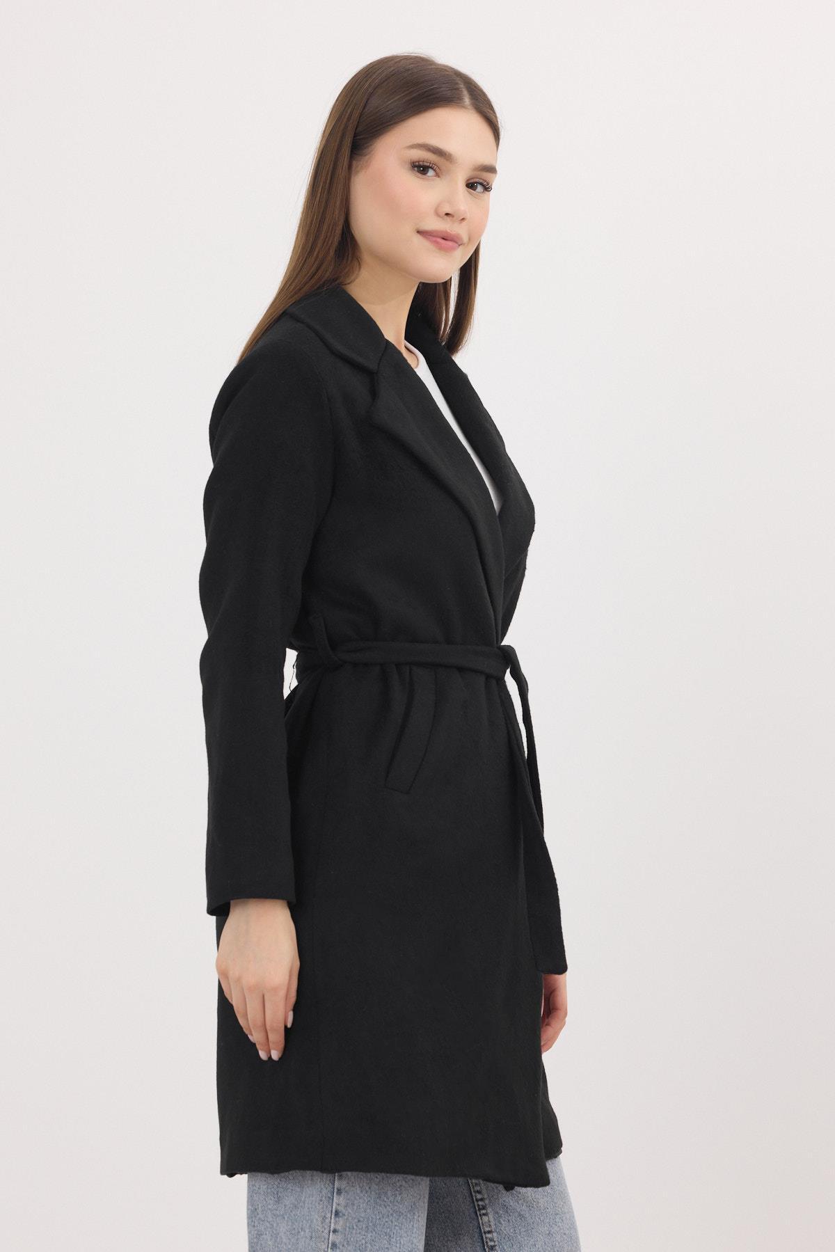 Siyah Kemerli İçi Astarlı Uzun Kaşe Kaban 7149A