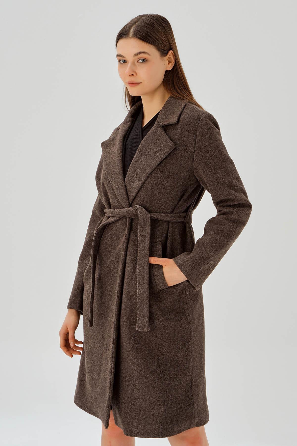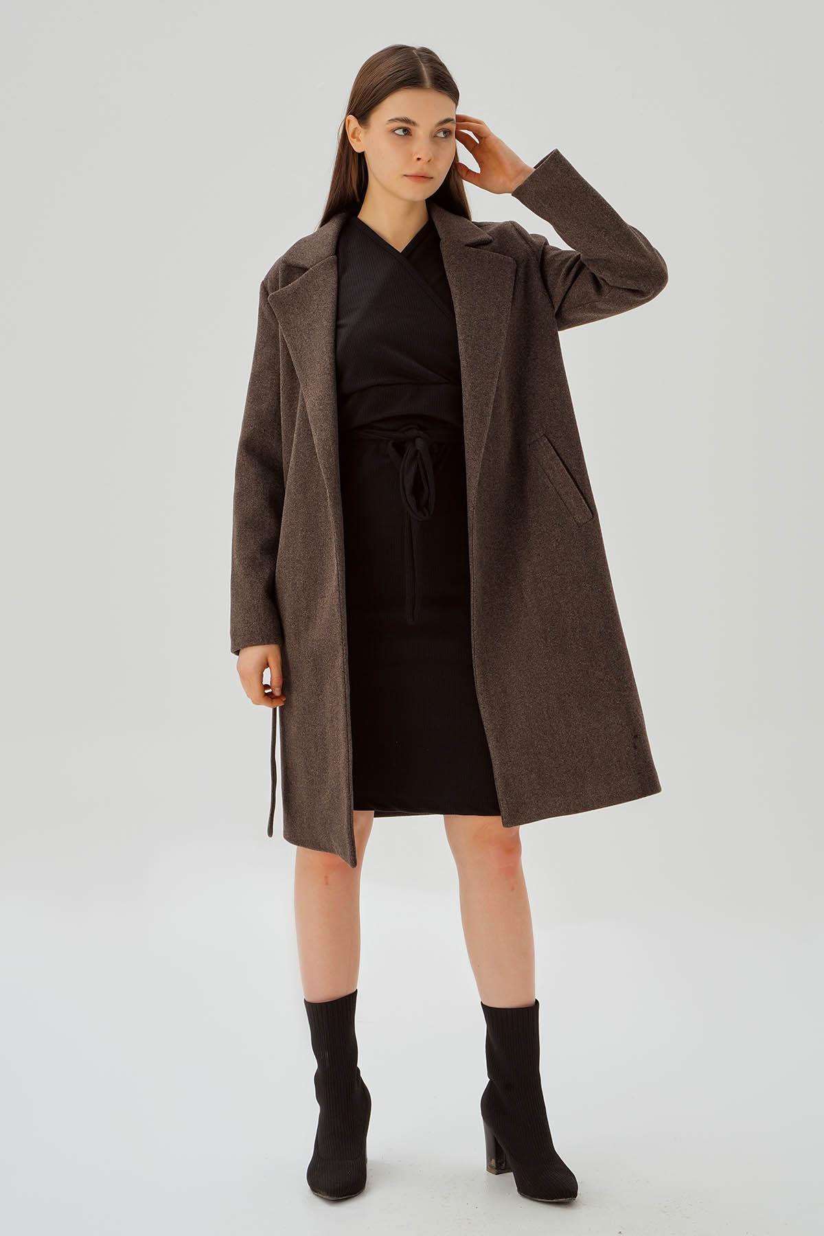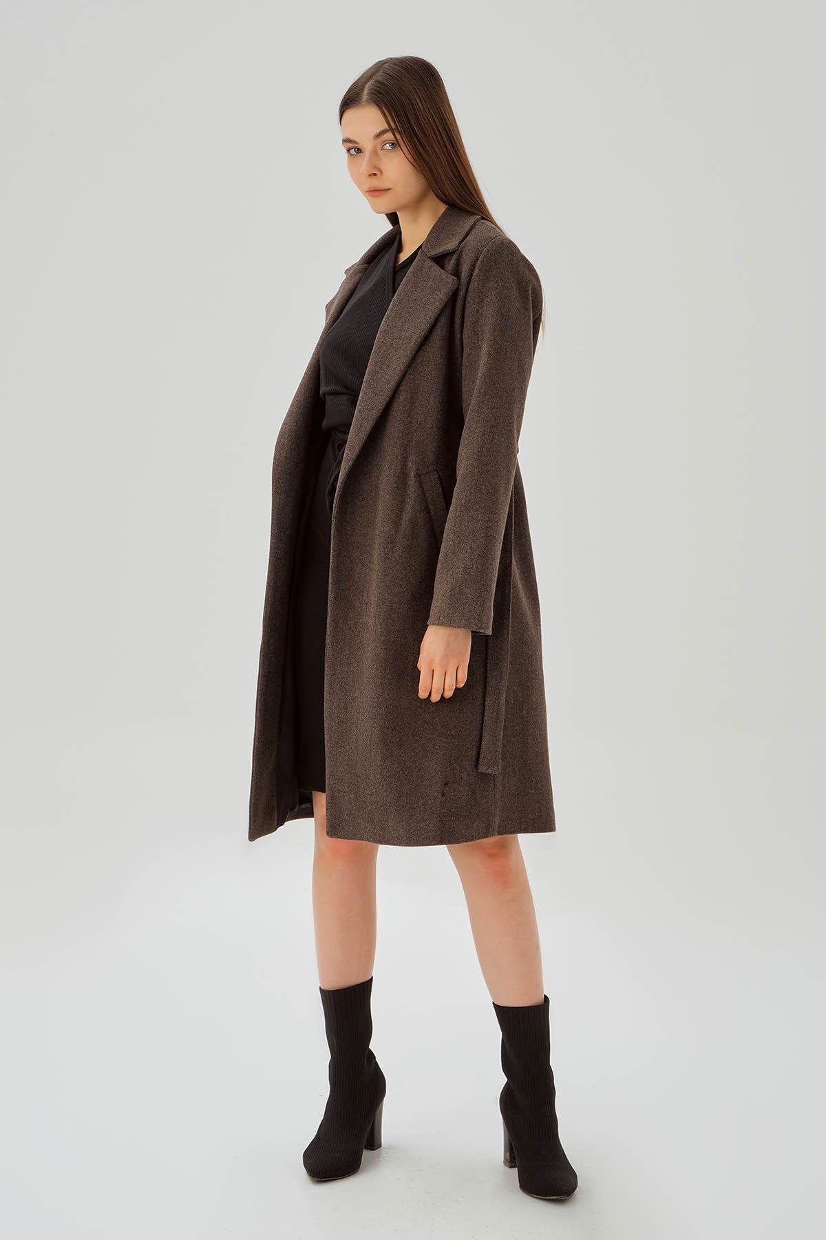 Kahve Belden Bağlamalı Kaşe Kaban 7218A