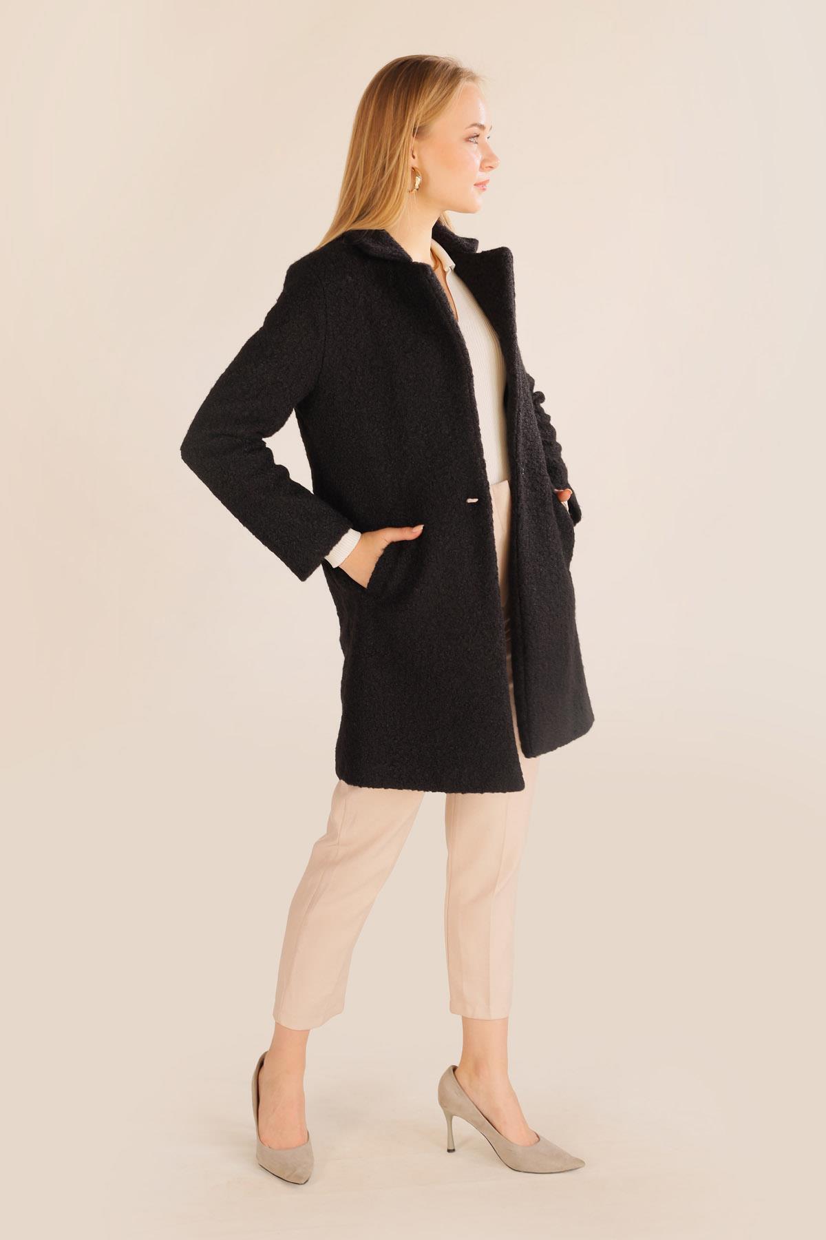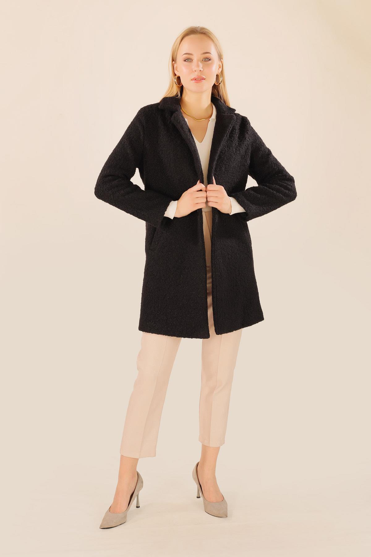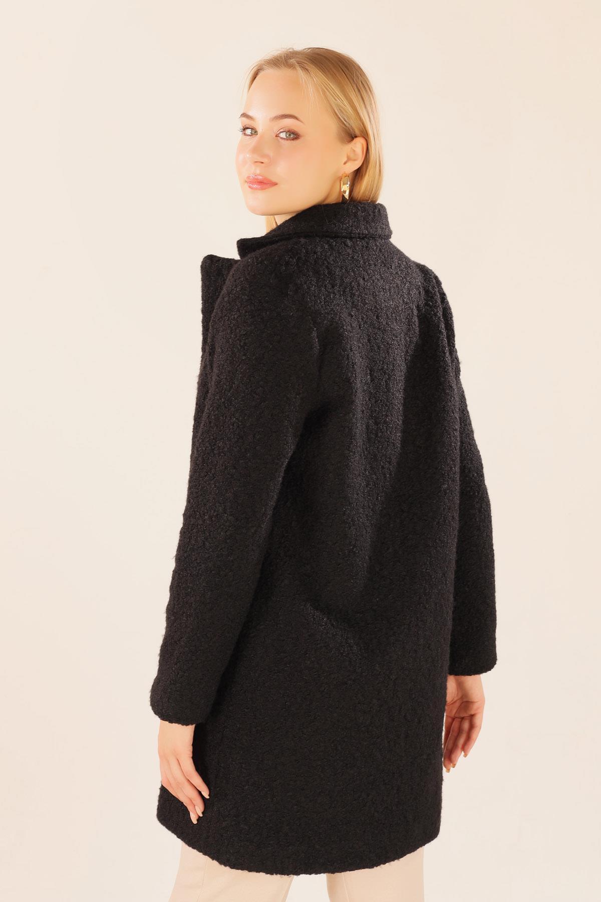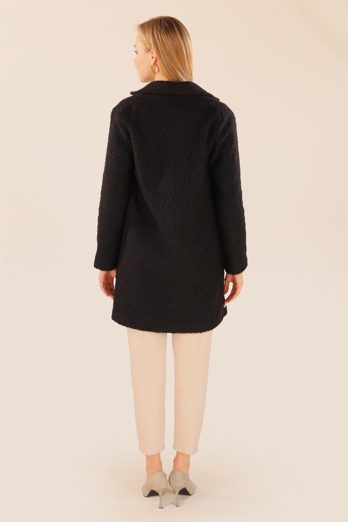 Siyah Büyük Cepli Geniş Yakalı Kadın Kaban 3102A
