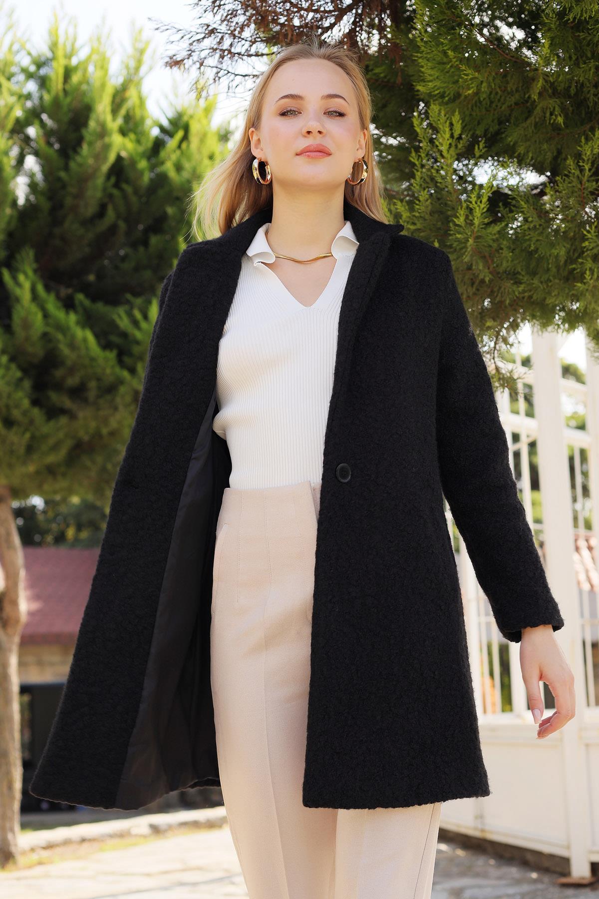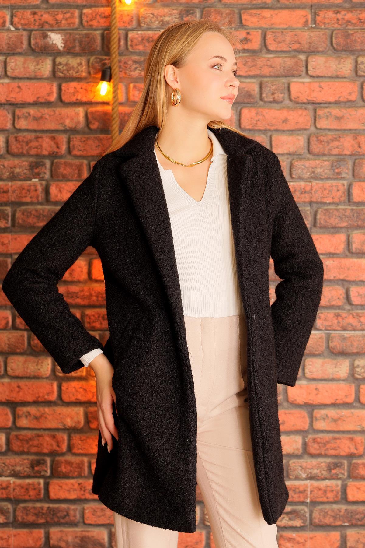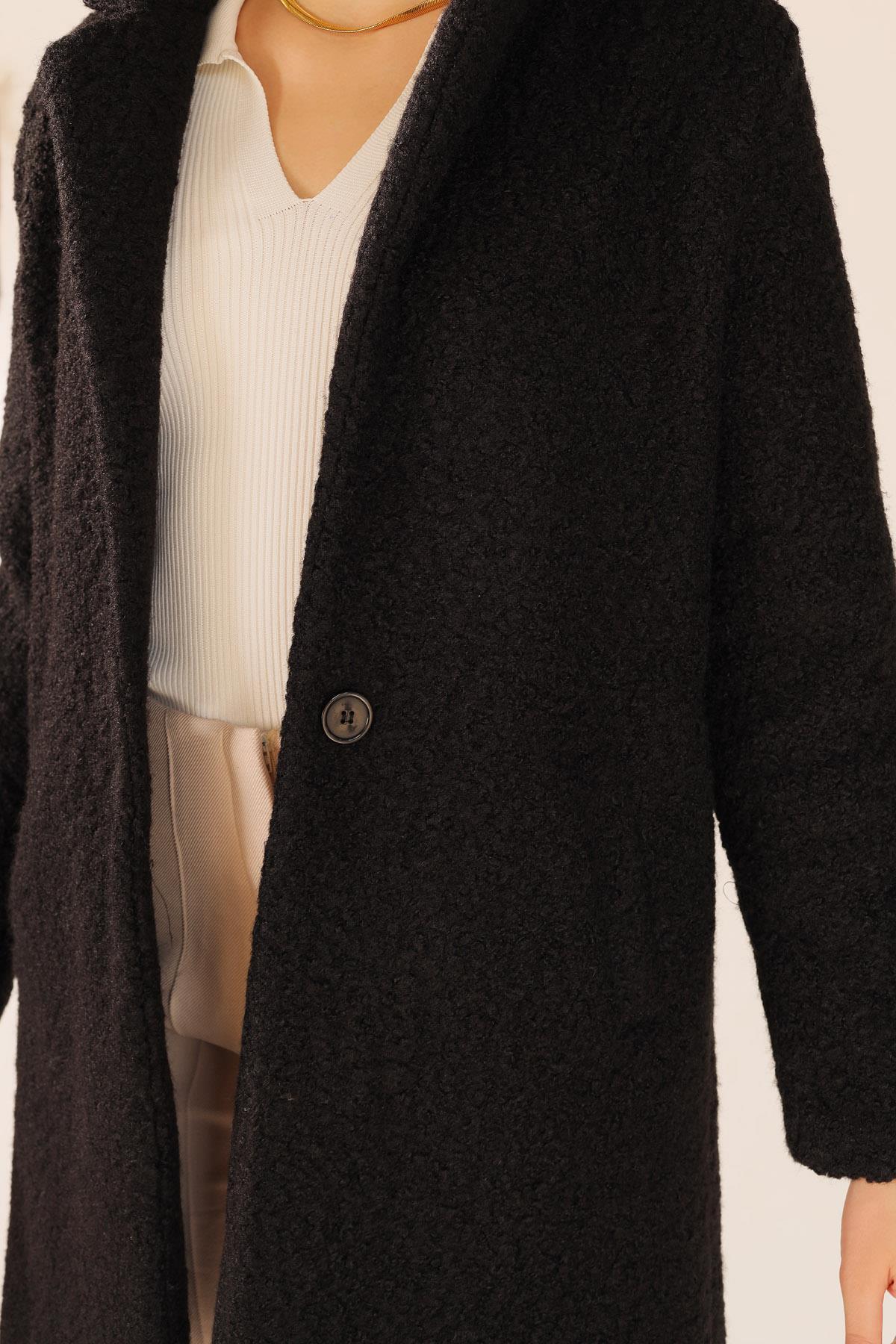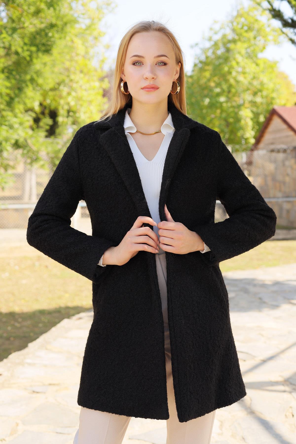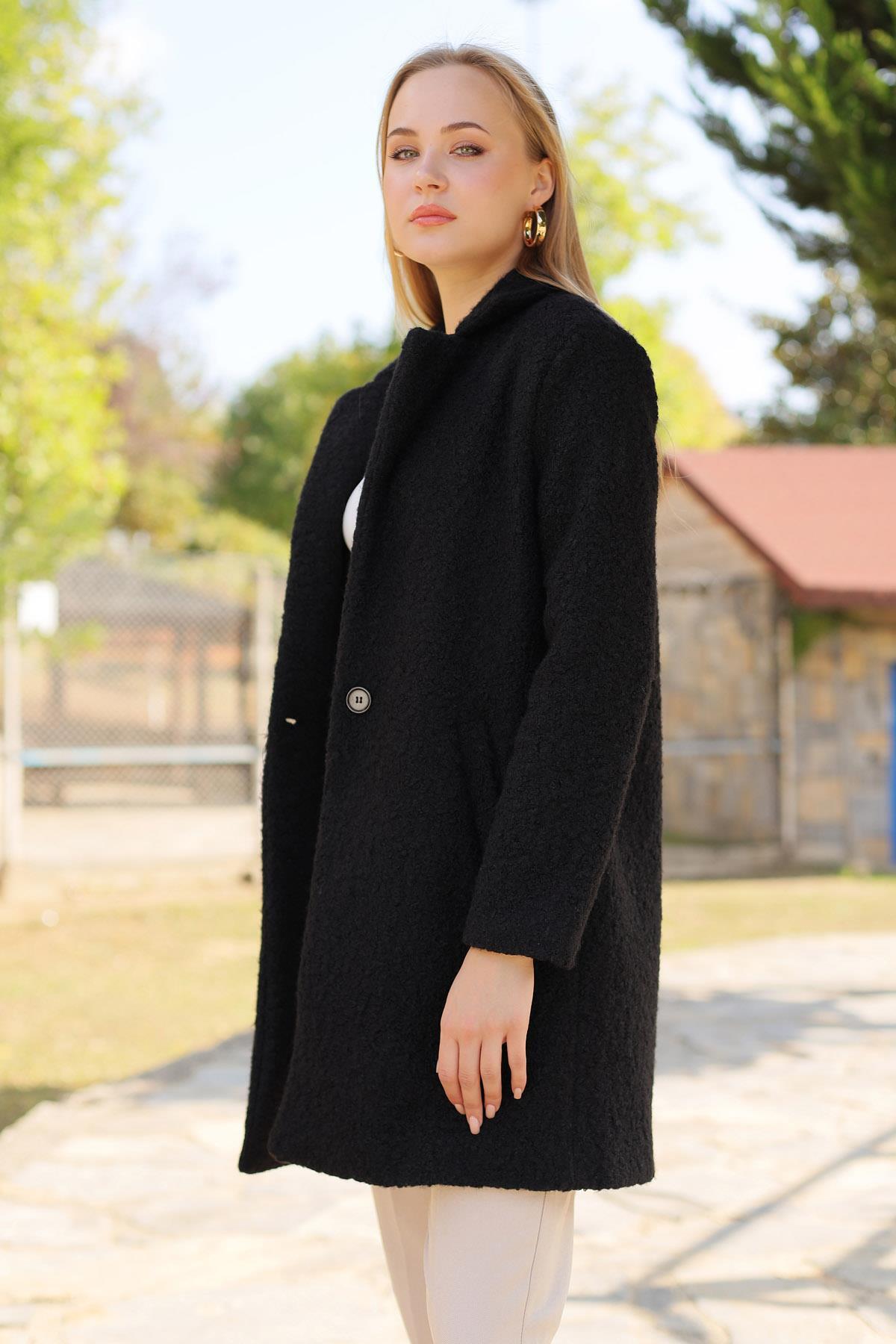Siyah Büyük Cepli Geniş Yakalı Kadın Kaban 3102A