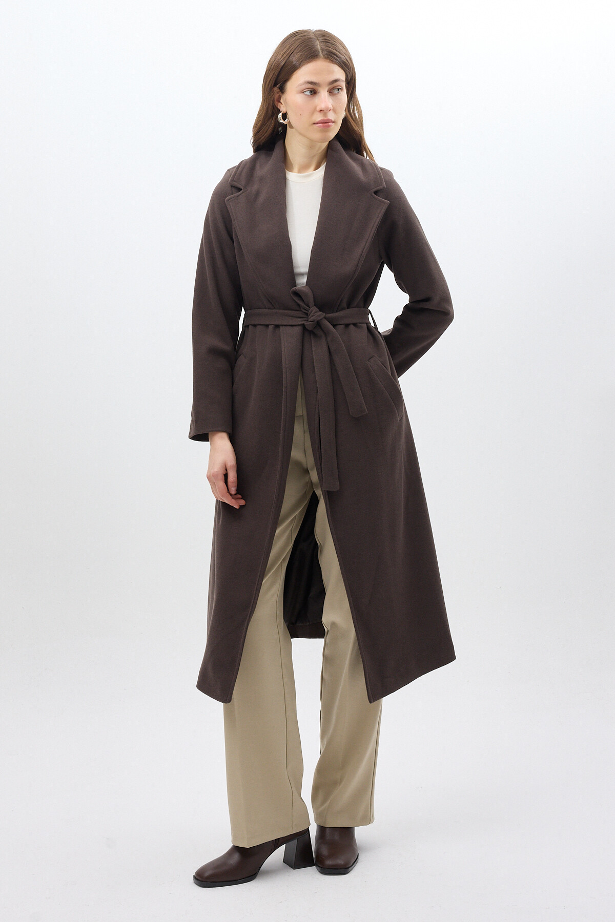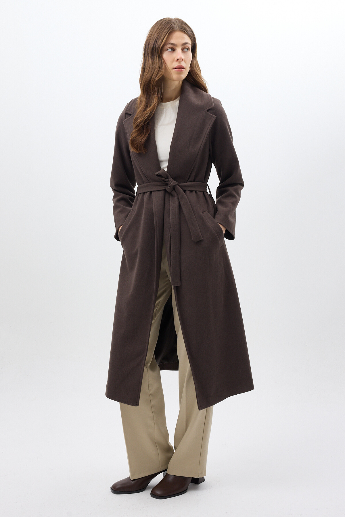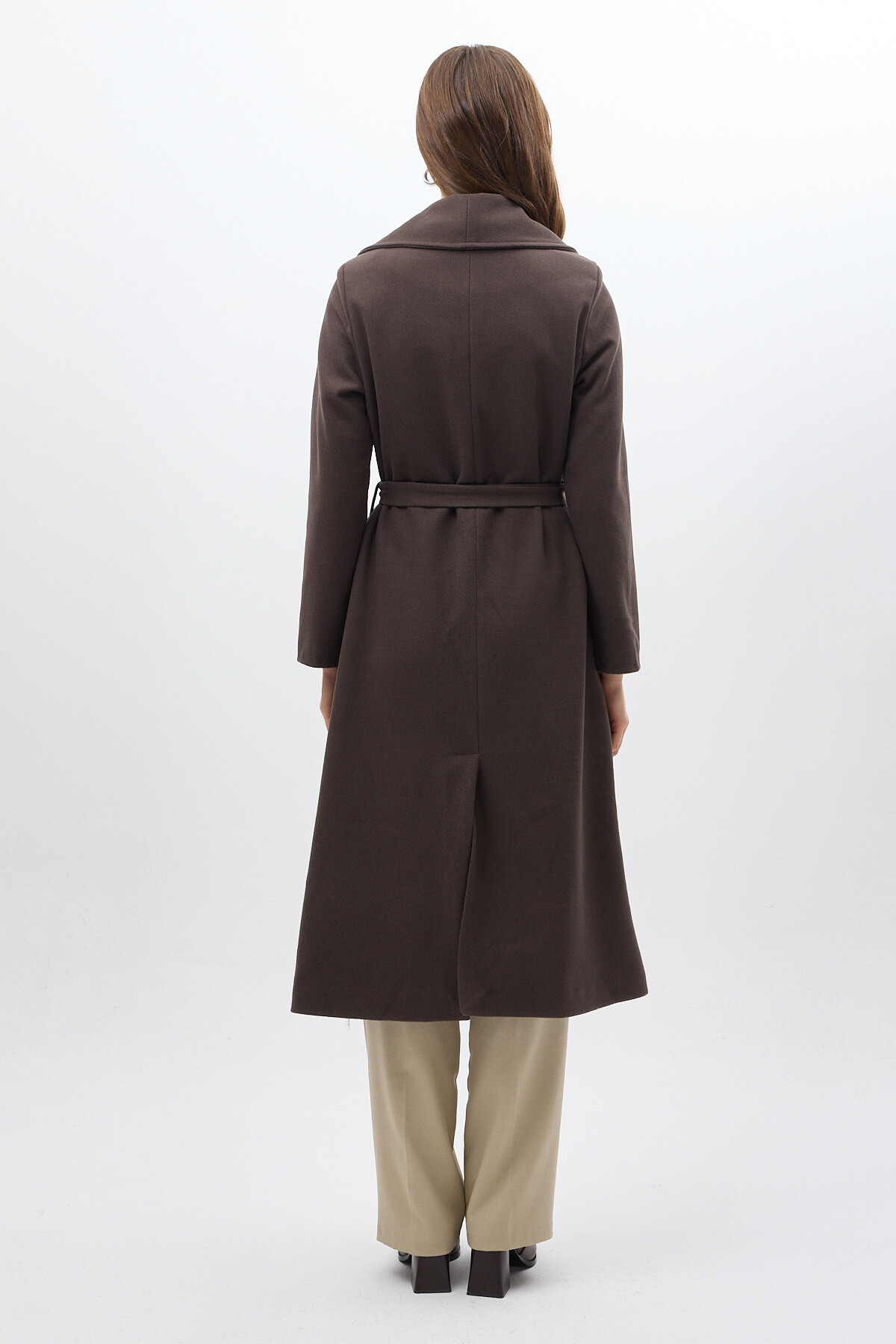 Acı Kahve Kuşaklı Uzun Astarlı Kadın Kaban 7242A
