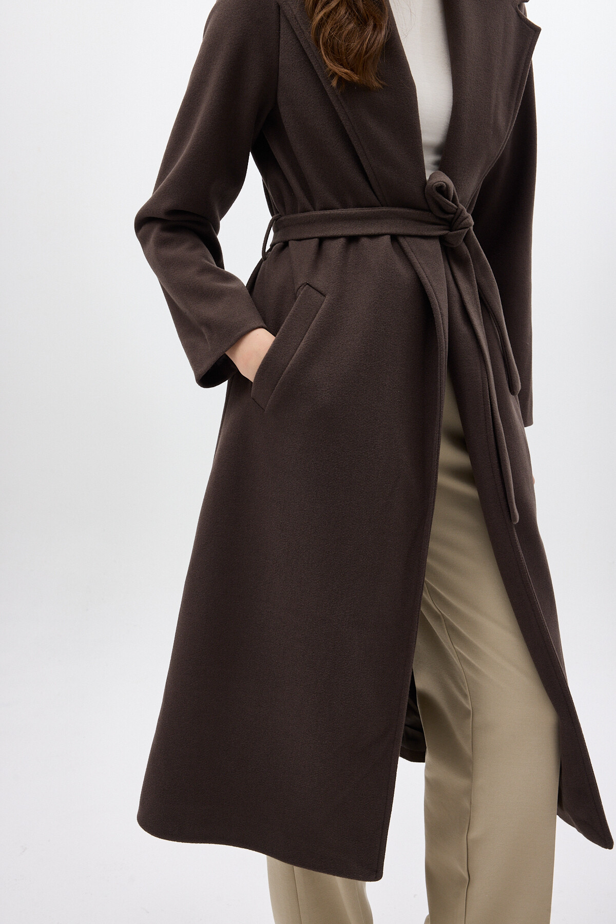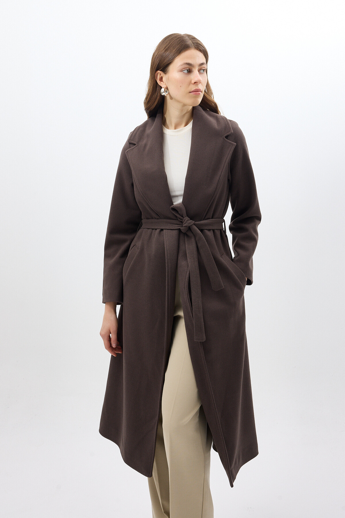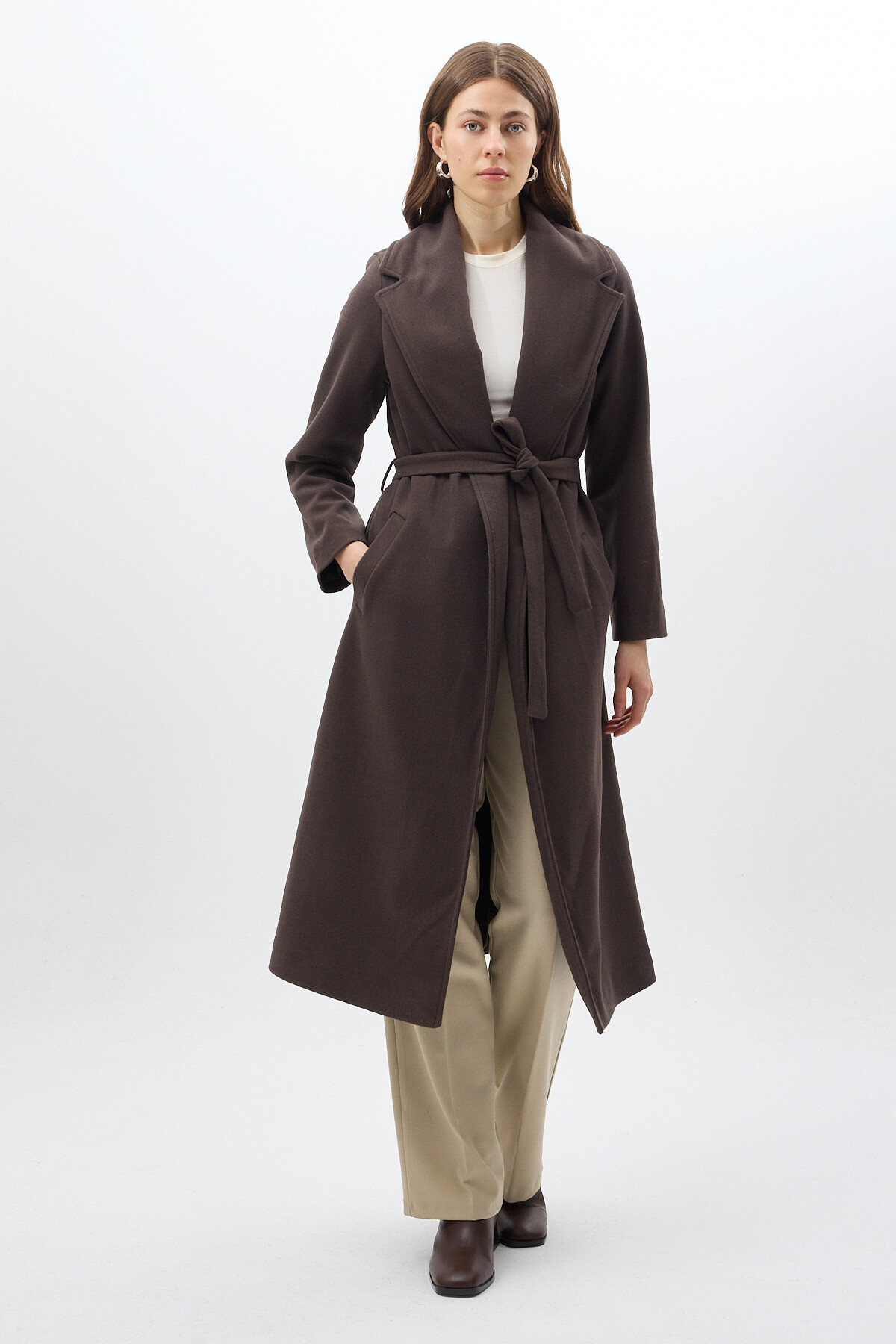 Acı Kahve Kuşaklı Uzun Astarlı Kadın Kaban 7242A