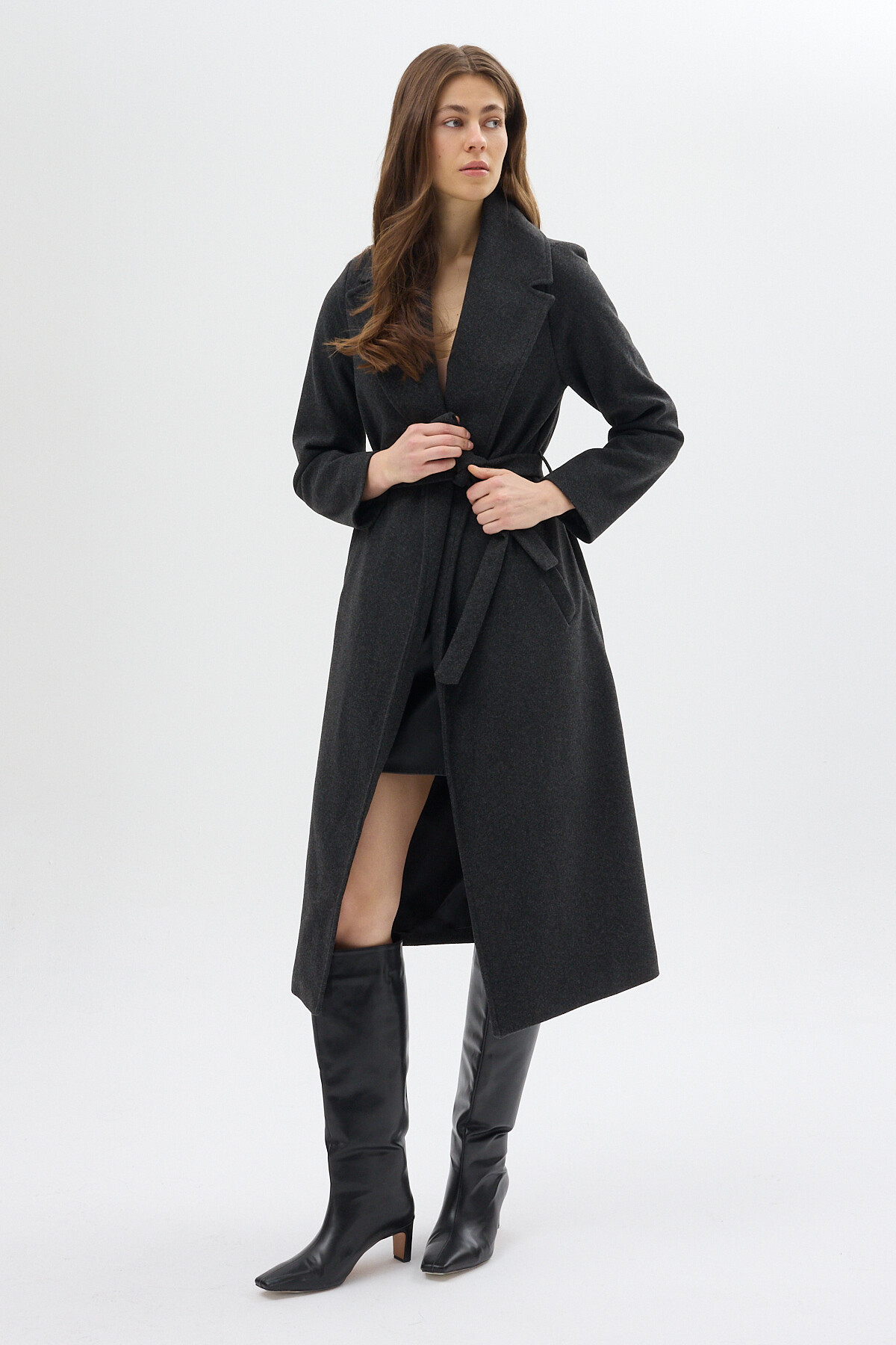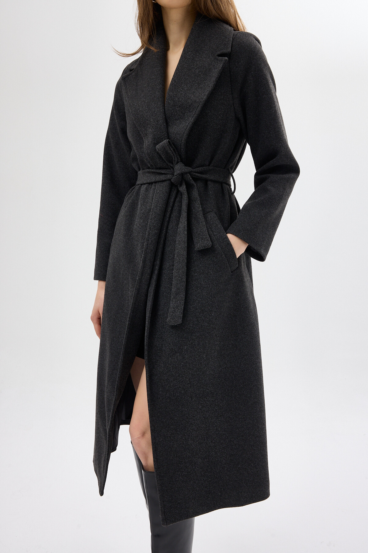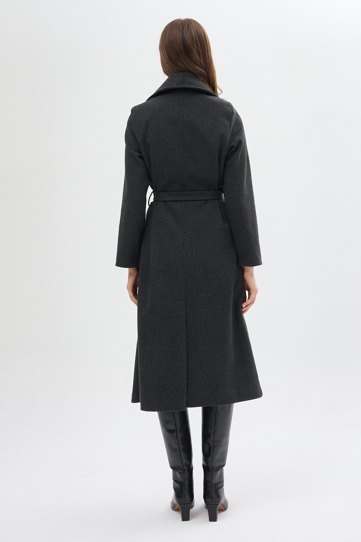 Antrasit Kuşaklı Uzun Astarlı Kadın Kaban 7242A