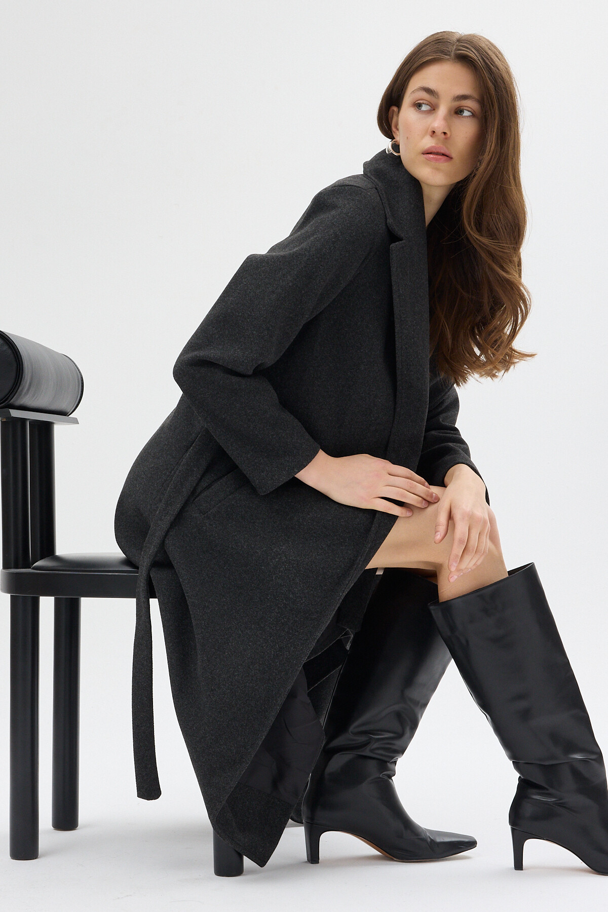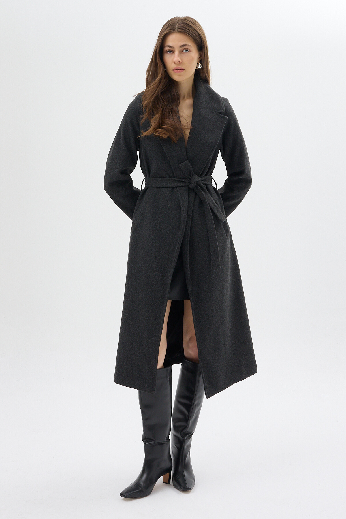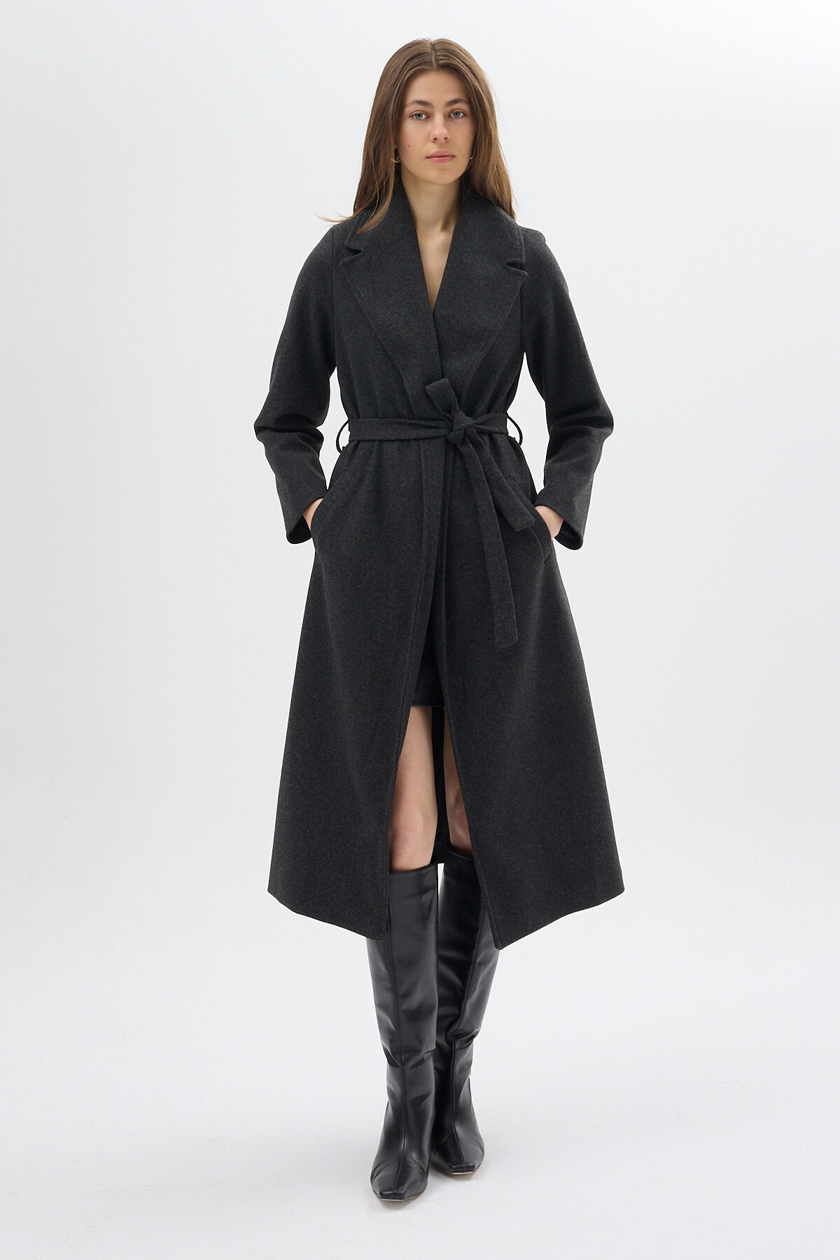 Antrasit Kuşaklı Uzun Astarlı Kadın Kaban 7242A